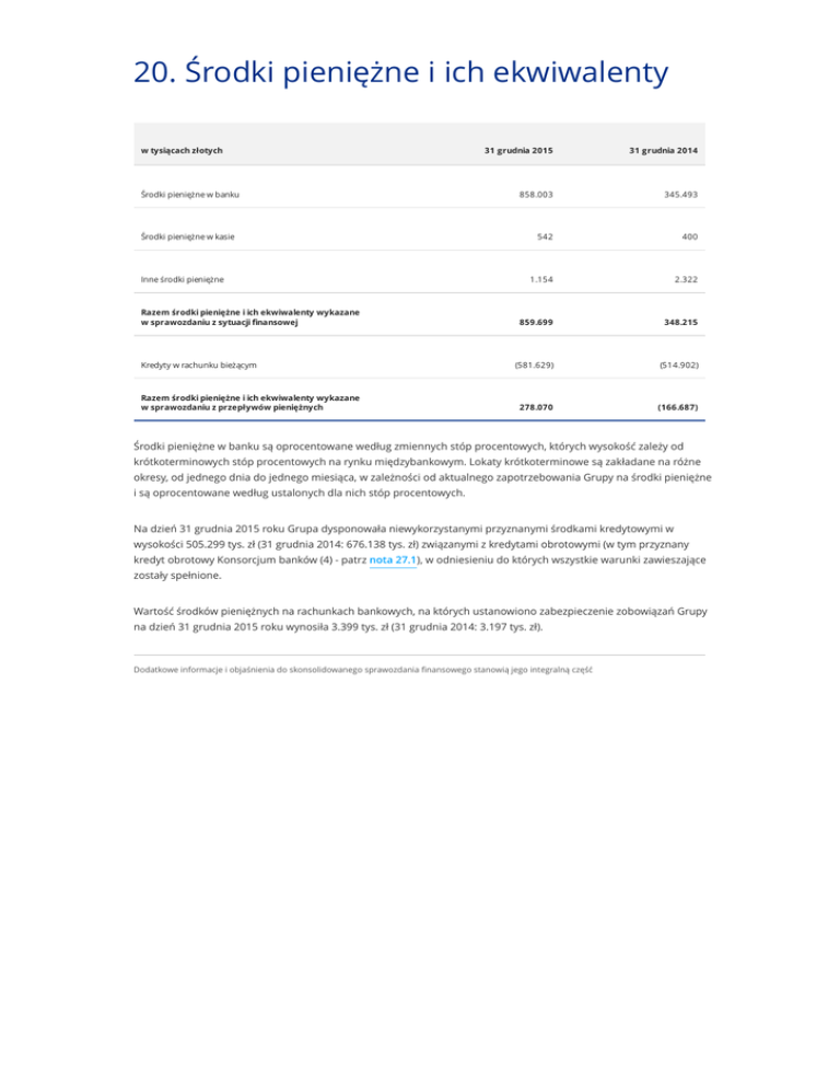 20. Środki pieniężne i ich ekwiwalenty w tysiącach złotych Środki pieniężne w banku Środki pieniężne w kasie Inne środki pieniężne Razem środki pieniężne i ich ekwiwalenty wykazane w sprawozdaniu z sytuacji finansowej Kredyty w rachunku bieżącym Razem środki pieniężne i ich ekwiwalenty wykazane w sprawozdaniu z przepływów pieniężnych 31 grudnia 2015 31 grudnia 2014 858.003 345.493 542 400 1.154 2.322 859.699 348.215 (581.629) (514.902) 278.070 (166.687) Środki pieniężne w banku są oprocentowane według zmiennych stóp procentowych, których wysokość zależy od krótkoterminowych stóp procentowych na rynku międzybankowym. Lokaty krótkoterminowe są zakładane na różne okresy, od jednego dnia do jednego miesiąca, w zależności od aktualnego zapotrzebowania Grupy na środki pieniężne i są oprocentowane według ustalonych dla nich stóp procentowych. Na dzień 31 grudnia 2015 roku Grupa dysponowała niewykorzystanymi przyznanymi środkami kredytowymi w wysokości 505.299 tys. zł (31 grudnia 2014: 676.138 tys. zł) związanymi z kredytami obrotowymi (w tym przyznany kredyt obrotowy Konsorcjum banków (4) - patrz nota 27.1), w odniesieniu do których wszystkie warunki zawieszające zostały spełnione. Wartość środków pieniężnych na rachunkach bankowych, na których ustanowiono zabezpieczenie zobowiązań Grupy na dzień 31 grudnia 2015 roku wynosiła 3.399 tys. zł (31 grudnia 2014: 3.197 tys. zł). Dodatkowe informacje i objaśnienia do skonsolidowanego sprawozdania nansowego stanowią jego integralną część