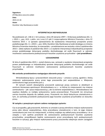 Sygnatura IPTPB1/4511-611/15-2/MH Data 2015.12.16 Autor Dyrektor Izby Skarbowej w Łodzi INTERPRETACJA INDYWIDUALNA Na podstawie art. 14b § 1 i § 6 ustawy z dnia 29 sierpnia 1997 r. Ordynacja podatkowa (Dz. U. z 2015 r., poz. 613, z późn. zm.) oraz § 5 pkt 3 rozporządzenia Ministra Finansów z dnia 22 kwietnia 2015 r. w sprawie upoważnienia do wydawania interpretacji przepisów prawa podatkowego (Dz. U. z 2015 r., poz. 643), Dyrektor Izby Skarbowej w Łodzi działający w imieniu Ministra Finansów stwierdza, że stanowisko – przedstawione we wniosku z dnia 2 października 2015 r. (data wpływu 6 października 2015 r.) o wydanie interpretacji indywidualnej przepisów prawa podatkowego dotyczącej podatku dochodowego od osób fizycznych w zakresie możliwości zastosowania podwyższonych kosztów uzyskania przychodów – jest prawidłowe. UZASADNIENIE W dniu 6 października 2015 r. został złożony ww. wniosek o wydanie interpretacji przepisów prawa podatkowego w indywidualnej sprawie dotyczącej podatku dochodowego od osób fizycznych w zakresie możliwości zastosowania podwyższonych kosztów uzyskania przychodów. We wniosku przedstawiono następujące zdarzenie przyszłe: Wnioskodawcę łączy z pracownikiem stosunek pracy – umowa o pracę, zgodnie z którą miejscem wykonywania pracy przez tego pracownika jest województwo x. Miejscem zamieszkania tego pracownika jest y. W ramach swoich obowiązków pracownik wykonuje pracę zarówno w obiektach w centrum biznesowo-sportowym Wnioskodawcy w y – w której to miejscowości ma miejsce zamieszkania – jak i poza miejscowością y, ale na terenie województwa x. Wnioskodawca nie wypłaca dodatku za rozłąkę wskazanemu wyżej pracownikowi. Pracownik nie otrzymuje zwrotu kosztów dojazdu do zakładu pracy. Pracownik nie złożył dotychczas oświadczenia o tym, że zachodzą przesłanki podwyższenia jego kosztów uzyskania przychodów ze stosunku pracy. W związku z powyższym opisem zadano następujące pytanie: Czy w przypadku, gdy pracownik, któremu w umowie o pracę określono miejsce wykonywania pracy jako obszar województwa, złoży pracodawcy oświadczenie o tym, że jego miejsce zamieszkania jest inne niż miejscowość, w której znajduje się zakład pracy pracodawcy i że w związku z tym spełnia przesłanki do zastosowania podwyższonych kosztów uzyskania przychodów, prawidłowym będzie zastosowanie przez pracodawcę tych podwyższonych kosztów w sytuacji, gdy miejsce wykonywania pracy pracownika obejmuje swoim zasięgiem Źródło: Ministerstwo Finansów http://sip.mf.gov.pl/sip/index.php?rodzaj=2&czystka=1 obszar województwa, w tym miejscowość będącą miejscem zamieszkania pracownika oraz inne miejscowości na terytorium tego województwa... Zdaniem Wnioskodawcy, zgodnie z art. 22 ust. 1 ustawy o podatku dochodowym od osób fizycznych (dalej: „ustawa PIT”), kosztami uzyskania przychodów są koszty poniesione w celu osiągnięcia przychodów lub zachowania albo zabezpieczenia źródła przychodów, z wyjątkiem kosztów wymienionych w art. 23. Art. 22 ust. 2 pkt 3 ustawy PIT stanowi z kolei, że koszty uzyskania przychodów, m.in. ze stosunku pracy są podwyższone, tj. wynoszą 139,06 zł miesięcznie, a za rok podatkowy łącznie nie więcej niż 1 668,72 zł w przypadku, gdy miejsce stałego lub czasowego zamieszkania podatnika jest położone poza miejscowością, w której znajduje się zakład pracy, a podatnik nie uzyskuje dodatku za rozłąkę. Przepis art. 22 ust. 2 pkt 3 ustawy PIT ma zatem zastosowanie wówczas, gdy spełnione są łącznie następujące przesłanki: miejsce zamieszkania pracownika, bez względu na to, czy ma charakter stały, czy czasowy, znajduje się poza miejscowością, w której znajduje się zakład pracy; pracownik nie otrzymuje dodatku za rozłąkę, pracownik nie otrzymuje od pracodawcy zwrotu kosztów dojazdu do zakładu pracy. Zdaniem Wnioskodawcy, uzasadnione jest stanowisko, że w opisanym zdarzeniu przyszłym pracownikowi – gdyby złożył odpowiednie oświadczenie w tym zakresie – przysługiwałyby podwyższone koszty uzyskania przychodów, określone w art. 22 ust. 2 pkt 3 ustawy PIT. Za powyższym stanowiskiem, zdaniem Wnioskodawcy, przemawia wykładnia celowościowa art. 22 ust. 2 pkt 3 ustawy PIT. Ustawa ta posługuje się co prawda sformułowaniem „miejscowość, w której znajduje się zakład pracy”, ale trudno przyjąć, by w świetle realiów, w jakich zawierane i wykonywano są umowy o pracę, rozumieć pod tym określeniem wyłącznie miejscowość, w której znajduje się jakaś materialnie wyodrębniona jednostka organizacyjna pracodawcy. Należy bowiem zwrócić uwagę na to, że miejsce wykonywania pracy może być przez strony umowy o pracę określone zarówno poprzez wskazanie określonego adresu siedziby pracodawcy lub adresu określonej jednostki organizacyjnej pracodawcy usytuowanej poza tą siedzibą, ale także jako pewien oznaczony obszar lub strefa określona granicami jednostki organizacyjnej podziału państwa. To miejsce pracy wcale nie musi być też wyposażone w zaplecze kadrowe, socjalne i techniczne. Zdaniem Wnioskodawcy, powyższe stanowisko należy uznać za ugruntowane w świetle poglądów doktryny i orzecznictwa. Jak wskazują E. Maniewska i K. Jaśkowski: „Określenie miejsca wykonywania pracy może być szczegółowe, np. przez wskazanie konkretnego zakładu produkcyjnego lub bardziej ogólne, np. przez ustalenie, że jest nim siedziba pracodawcy, co w przypadku przedsiębiorstwa wielozakładowego oznacza obowiązek podjęcia przez pracownika pracy w każdym zakładzie produkcyjnym znajdującym się w miejscowości będącej siedzibą pracodawcy. Miejscem wykonywania pracy przez pracowników mobilnych jest określony w umowie obszar.” Z kolei w wyroku SA w Poznaniu zaznaczono, że: „nie jest podróżą służbową wykonywanie pracy w różnych miejscowościach, gdy przedmiotem zobowiązania prac