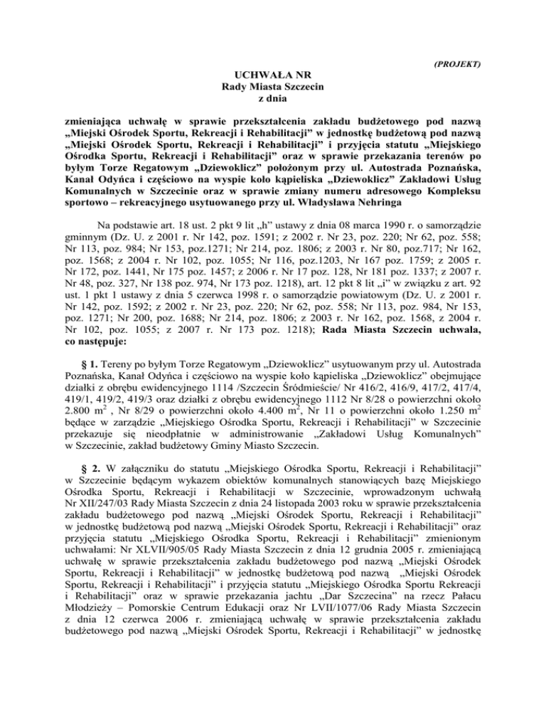 (PROJEKT) UCHWAŁA NR Rady Miasta Szczecin z dnia zmieniająca uchwałę w sprawie przekształcenia zakładu budŜetowego pod nazwą „Miejski Ośrodek Sportu, Rekreacji i Rehabilitacji” w jednostkę budŜetową pod nazwą „Miejski Ośrodek Sportu, Rekreacji i Rehabilitacji” i przyjęcia statutu „Miejskiego Ośrodka Sportu, Rekreacji i Rehabilitacji” oraz w sprawie przekazania terenów po byłym Torze Regatowym „Dziewoklicz” połoŜonym przy ul. Autostrada Poznańska, Kanał Odyńca i częściowo na wyspie koło kąpieliska „Dziewoklicz” Zakładowi Usług Komunalnych w Szczecinie oraz w sprawie zmiany numeru adresowego Kompleksu sportowo – rekreacyjnego usytuowanego przy ul. Władysława Nehringa Na podstawie art. 18 ust. 2 pkt 9 lit „h” ustawy z dnia 08 marca 1990 r. o samorządzie gminnym (Dz. U. z 2001 r. Nr 142, poz. 1591; z 2002 r. Nr 23, poz. 220; Nr 62, poz. 558; Nr 113, poz. 984; Nr 153, poz.1271; Nr 214, poz. 1806; z 2003 r. Nr 80, poz.717; Nr 162, poz. 1568; z 2004 r. Nr 102, poz. 1055; Nr 116, poz.1203, Nr 167 poz. 1759; z 2005 r. Nr 172, poz. 1441, Nr 175 poz. 1457; z 2006 r. Nr 17 poz. 128, Nr 181 poz. 1337; z 2007 r. Nr 48, poz. 327, Nr 138 poz. 974, Nr 173 poz. 1218), art. 12 pkt 8 lit „i” w związku z art. 92 ust. 1 pkt 1 ustawy z dnia 5 czerwca 1998 r. o samorządzie powiatowym (Dz. U. z 2001 r. Nr 142, poz. 1592; z 2002 r. Nr 23, poz. 220; Nr 62, poz. 558; Nr 113, poz. 984, Nr 153, poz. 1271; Nr 200, poz. 1688; Nr 214, poz. 1806; z 2003 r. Nr 162, poz. 1568, z 2004 r. Nr 102, poz. 1055; z 2007 r. Nr 173 poz. 1218); Rada Miasta Szczecin uchwala, co następuje: § 1. Tereny po byłym Torze Regatowym „Dziewoklicz” usytuowanym przy ul. Autostrada Poznańska, Kanał Odyńca i częściowo na wyspie koło kąpieliska „Dziewoklicz” obejmujące działki z obrębu ewidencyjnego 1114 /Szczecin Śródmieście/ Nr 416/2, 416/9, 417/2, 417/4, 419/1, 419/2, 419/3 oraz działki z obrębu ewidencyjnego 1112 Nr 8/28 o powierzchni około 2.800 m2 , Nr 8/29 o powierzchni około 4.400 m2, Nr 11 o powierzchni około 1.250 m2 będące w zarządzie „Miejskiego Ośrodka Sportu, Rekreacji i Rehabilitacji” w Szczecinie przekazuje się nieodpłatnie w administrowanie „Zakładowi Usług Komunalnych” w Szczecinie, zakład budŜetowy Gminy Miasto Szczecin. § 2. W załączniku do statutu „Miejskiego Ośrodka Sportu, Rekreacji i Rehabilitacji” w Szczecinie będącym wykazem obiektów komunalnych stanowiących bazę Miejskiego Ośrodka Sportu, Rekreacji i Rehabilitacji w Szczecinie, wprowadzonym uchwałą Nr XII/247/03 Rady Miasta Szczecin z dnia 24 listopada 2003 roku w sprawie przekształcenia zakładu budŜetowego pod nazwą „Miejski Ośrodek Sportu, Rekreacji i Rehabilitacji” w jednostkę budŜetową pod nazwą „Miejski Ośrodek Sportu, Rekreacji i Rehabilitacji” oraz przyjęcia statutu „Miejskiego Ośrodka Sportu, Rekreacji i Rehabilitacji” zmienionym uchwałami: Nr XLVII/905/05 Rady Miasta Szczecin z dnia 12 grudnia 2005 r. zmieniającą uchwałę w sprawie przekształcenia zakładu budŜetowego pod nazwą „Miejski Ośrodek Sportu, Rekreacji i Rehabilitacji” w jednostkę budŜetową pod nazwą „Miejski Ośrodek Sportu, Rekreacji i Rehabilitacji” i przyjęcia statutu „Miejskiego Ośrodka Sportu Rekreacji i Rehabilitacji” oraz w sprawie przekazania jachtu „Dar Szczecina” na rzecz Pałacu MłodzieŜy – Pomorskie Centrum Edukacji oraz Nr LVII/1077/06 Rady Miasta Szczecin z dnia 12 czerwca 2006 r. zmieniającą uchwałę w sprawie przekształcenia zakładu budŜetowego pod nazwą „Miejski Ośrodek Sportu, Rekreacji i Rehabilitacji” w jednostkę budŜetową pod nazwą „Miejski Ośrodek Sportu, Rekreacji i Rehabilitacji” i przyjęcia statutu „Miejskiego Ośrodka Sportu Rekreacji i Rehabilitacji” oraz w sprawie przejęcia kompleksu sportowo – rekreacyjnego usytuowanego na zapleczu nieruchomości połoŜonej przy ul. Nehringa 65 i 67 w Szczecinie uŜytkowanego obecnie przez Klub Sportowy „Hutnik – Eko Tras Szczecin” przez „Miejski Ośrodek Sportu, Rekreacji i Rehabilitacji” oraz Nr XIV/384/07 Rady Miasta Szczecin z dnia 29 października 2007 r. zmieniającą uchwałę w sprawie przekształcenia zakładu budŜetowego pod nazwą „Miejski Ośrodek Sportu, Rekreacji i Rehabilitacji” w jednostkę budŜetową pod nazwą „Miejski Ośrodek Sportu, Rekreacji i Rehabilitacji” i przyjęcia statutu „Miejskiego Ośrodka Sportu, Rekreacji i Rehabilitacji” oraz w sprawie przejęcia obiektu sportowo – rekreacyjnego przy ul. Modrej w Szczecinie od Rady Osiedla Krzekowo Bezrzecze oraz w sprawie zmian statutu poprzez zwiększenie zakresu działalności „Miejskiego Ośrodka Sportu, Rekreacji i Rehabilitacji” dokonuje się następujących zmian: 1. skreśla się punkt 9 w brzmieniu: Tor Regatowy „Dziewoklicz”. 2. punkt 10 otrzymuje brzmienie: „Kompleks sportowo – rekreacyjny, ul. Władysława Nehringa 69”. § 3. Wykonanie uchwały powierza się Prezydentowi Miasta Szczecin. § 4. Uchwała wchodzi w Ŝycie z dniem podjęcia. UZASADNIENIE 1. Decyzja dotycząca likwidacji Toru Regatowego „Dziewoklicz” została podjęta w roku 2001, jednakŜe ze względów finansowych jej realizacja nastąpiła w sierpniu 2006 roku. Z chwilą zlikwidowania urządzeń toru ustały powody zarządzania tymi terenami przez Miejski Ośrodek Sportu, Rekreacji i Rehabilitacji, gdyŜ nie ma moŜliwości realizowania tam Ŝadnych funkcji sportowych, a działalność Ośrodka ogranicza się jedynie do usuwania szkód w drzewostanie wywołanych warunkami atmosferycznymi. Tor Regatowy „Dziewoklicz” umiejscowiony był na 10 działkach (dz. nr 416/2, 416/9, 417/2, 417/4, 419/1, 419/2, 419/3, z obrębu 1114 /Szczecin – Śródmieście/ oraz działki z obrębu ewidencyjnego 1112 Nr 8/28 w części ok. 2 800 m2, , Nr 8/29 o powierzchni ok. 4.400 m2 , Nr 11 o powierzchni ok. 1.250 m2 . Działki stanowią podmokłe tereny wzdł