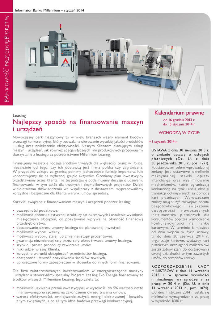 BANKOWOŚĆ PRZ EDSIĘBIORSTW Informator Banku Millennium – styczeń 2014 Leasing Najlepszy sposób na finansowanie maszyn i urządzeń Nowoczesny park maszynowy to w wielu branżach ważny element budowy przewagi konkurencyjnej, który pozwala na oferowanie wysokiej jakości produktów i usług oraz zwiększenie efek tywności. Naszym Klientom planującym zakup maszyn i urządzeń, jak również specjalistycznych linii produkcyjnych proponujemy skorzystanie z leasingu za pośrednictwem Millennium Leasing. Finansujemy wszystkie rodzaje środków trwałych dla większości branż w Polsce, niezależnie od tego, czy ich dostawcą jest f irma polska czy zagraniczna. W przypadku zakupu za granicą pełnimy jednocześnie funkcję impor tera. Nie koncentrujemy się na wybranej grupie aktywów. Oceniamy plan inwestycyjny przedstawiony przez Klienta i na tej podstawie podejmujemy decyzję o udzieleniu finansowania, w tym tak że dla trudnych i skomplikowanych projektów. Dzięki wieloletniemu doświadczeniu we współpracy z dostawcami wypracowaliśmy korzystne i bezpieczne dla Klienta warunki umów sprzedaży. Korzyści związane z finansowaniem maszyn i urządzeń poprzez leasing: • o szczędności podatkowe, • m ożliwość doboru elastycznej struktury rat okresowych i ustalenie wysokości miesięcznych obcią żeń, co poz y ty wnie wp ł y wa na p ł ynność f inansową przedsiębiorstwa, • d opasowanie okresu umowy leasingu do planowanej inwestycji, • m ożliwość wyboru waluty, • m ożliwość wyboru stałej lub zmiennej stopy procentowej, • g warancja niezmiennej raty przez cał y okres tr wania umowy leasingu, • s zybkie i proste procedury zawierania umów, • n iski udział własny Klienta, • k orzystne warunki ubezpieczeń przedmiotów leasingu, • d ostępność i łatwość pozyskiwania środków tr wał ych, • u proszczone formy zabezpieczeń w stosunku do innych form finansowania. Dla f ir m zainteresowanych inwes towaniem w energooszczędne masz yny i urządzenia stworzyliśmy specjalny Program Leasing Eko Energia finansowany ze środków własnych Millennium Leasing. Jego zalety to: • m ożliwość uzyskania premii inwestycyjnej w wysokości do 5% war tości netto finansowanego urządzenia na zakończenie okresu tr wania umowy, • w zrost efek ty wności, zmniejszenie zużycia energii elek tr ycznej i kosz tów z tym związanych, a co za tym idzie budowa przewagi konkurencyjnej, Kalendarium prawne od 16 grudnia 2013 r. do 15 stycznia 2014 r. WCHODZĄ W ŻYCIE: •1 stycznia 2014 r. USTAWA z dnia 30 sierpnia 2013 r. o zmianie ustaw y o usługach p ł at nic z ych (Dz . U. z dnia 30 października 2013 r., poz. 1271). Podstawowym celem wprowadzonej zmiany jest ustawowe określenie mak symalnej s tawk i op ł at y interchange oraz wyeliminowanie mechanizmów, k tóre ograniczają konkurencję na rynku usług obsługi transakcji dokonywanych za pomocą kar t p łatniczych. Wprowadzane zmiany mają służyć rozwojowi obrotu bezgotówkowego i z więk szeniu dostępności nowoczesnych ins tr umentów p ł atnic z ych dla konsumentów poprzez wzmocnienie konkurencyjności na r ynku kar towym. W terminie 6 miesięcy od dnia wejścia w życie ustawy, tj. do dnia 30 czer wca 2014 r., organizacje kartowe, wydawcy kart płatniczych oraz agenci rozliczeniowi zostali zobowiązani do dostosowania swojej działalności, w tym zawartych umów, do przepisów ustawy. R O Z P O R Z Ą DZ E N I E R A DY MINISTRÓW z dnia 11 września 2013 r. w sprawie w ysokości minimalnego w ynagrodzenia za pracę w 2014 r. (Dz. U. z dnia 13 września 2013 r., poz. 1074). Od dnia 1 stycznia 2014 r. ustala się minimalne wynagrodzenie za pracę w wysokości 1680 zł. • e lastyczny okres finansowania, • p roste procedury i minimum formalności. W celu uzyskania dodatkowych informacji na temat leasingu oraz Programu Eko Energia prosimy o kontakt ze swoim Doradcą lub Doradcami Millennium Leasing. Serdecznie zapraszamy również do odwiedzenia stron internetowych www.bankmillennium.pl oraz www.millenniumleasing.pl. R O Z P O R Z Ą DZ E N I E R A DY MINISTRÓW z dnia 30 lipca 2013 r. w sprawie ustalenia granic niektórych gmin i miast, nadania niektórym miejscowościom statusu miasta oraz zmiany siedziby władz gminy (Dz. U. z dnia 1 sierpnia 2013 r., poz. 869). Prognozy makroekonomiczne Inwestycje przedsiębiorstw zaskoczyły pozytywnie Rusz yło! Po cz terech k war tał ach spadków dynamika inwestycji w środki tr wałe w gospodarce narodowej w tr zecim kwar tale była dodatnia. Realnie wzrost wyniósł zaledwie 0,6% r/r, ale na początku roku powrót inwestycji do wzrostów jeszcze w 2013 r. wydawał się optymistycznym założeniem. Łącznie z przyspieszeniem konsumpcji sprawiło to, że popyt krajowy stał się drugim, obok eksportu netto, motorem wzrostu gospodarczego. Co prawda niezby t silnym, ale po pięciu kwartałach spadków dynamika popytu krajowego powróciła do wartości dodatnich. Spr zyjać temu powinna ich dobra kondycja finansowa. Wynik finansowy brutto przedsiębiorstw zatrudniających co najmniej 50 osób wzrósł w trzecim kwar tale o 15,1% r/r i drugi kwar tał z rzędu osiągnął dwucyfrową dynamikę. W minionym kwartale do 72% wzrósł odsetek f ir m dek lar ujących br ak problemów z pł ynnością f inansową, a brak płynności finansowej stanowi barierę rozwoju dla zaledwie 3,4% badanych pr ze z bank cent r alny przedsiębiorstw. Sytuacja finansowa firm nie stanowi zatem bariery dla działalności inwestycyjnej. Inwestycje był y do tej pory słabym ogniwem polskiej gospodarki. Wygasanie projektów infrastrukturalnych ograniczało inwestycje publiczne, a niepewność co do perspek ty w gospodarczych powstrzymywała sektor prywatny przed inwestycjami w rozbudowę majątku produkcyjnego. Stopniowo rośnie natomiast odsetek firm, dla których problemem jest brak odpowiedniego parku maszynowego. Wiązać się to może z rosnącym wykorzystaniem mocy wytwó