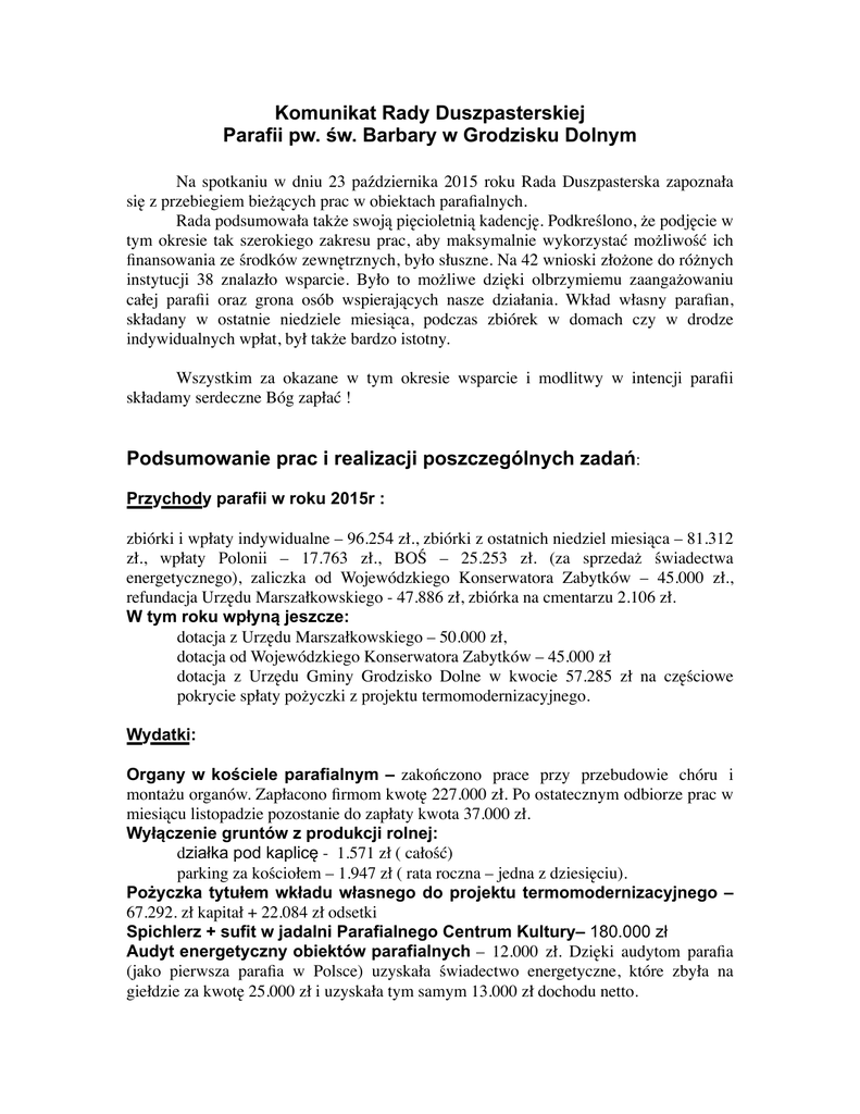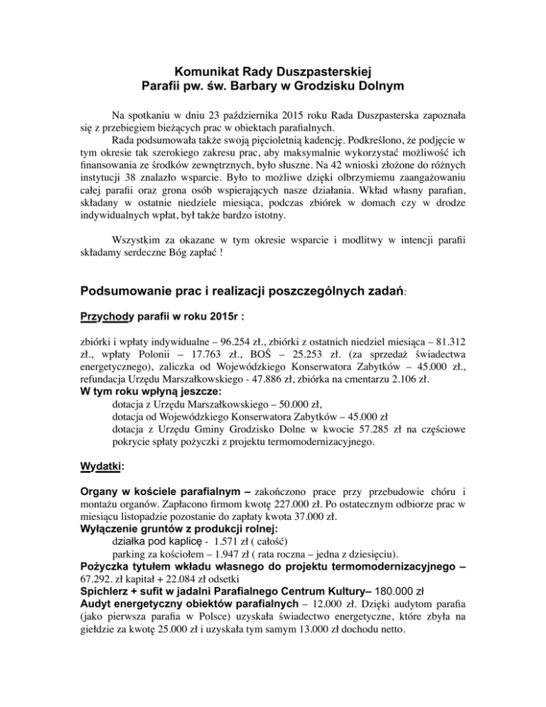 Komunikat Rady Duszpasterskiej Parafii pw. św. Barbary w Grodzisku Dolnym Na spotkaniu w dniu 23 października 2015 roku Rada Duszpasterska zapoznała się z przebiegiem bieżących prac w obiektach parafialnych. Rada podsumowała także swoją pięcioletnią kadencję. Podkreślono, że podjęcie w tym okresie tak szerokiego zakresu prac, aby maksymalnie wykorzystać możliwość ich finansowania ze środków zewnętrznych, było słuszne. Na 42 wnioski złożone do różnych instytucji 38 znalazło wsparcie. Było to możliwe dzięki olbrzymiemu zaangażowaniu całej parafii oraz grona osób wspierających nasze działania. Wkład własny parafian, składany w ostatnie niedziele miesiąca, podczas zbiórek w domach czy w drodze indywidualnych wpłat, był także bardzo istotny. Wszystkim za okazane w tym okresie wsparcie i modlitwy w intencji parafii składamy serdeczne Bóg zapłać ! Podsumowanie prac i realizacji poszczególnych zadań: Przychody parafii w roku 2015r : zbiórki i wpłaty indywidualne – 96.254 zł., zbiórki z ostatnich niedziel miesiąca – 81.312 zł., wpłaty Polonii – 17.763 zł., BOŚ – 25.253 zł. (za sprzedaż świadectwa energetycznego), zaliczka od Wojewódzkiego Konserwatora Zabytków – 45.000 zł., refundacja Urzędu Marszałkowskiego - 47.886 zł, zbiórka na cmentarzu 2.106 zł. W tym roku wpłyną jeszcze: dotacja z Urzędu Marszałkowskiego – 50.000 zł, dotacja od Wojewódzkiego Konserwatora Zabytków – 45.000 zł dotacja z Urzędu Gminy Grodzisko Dolne w kwocie 57.285 zł na częściowe pokrycie spłaty pożyczki z projektu termomodernizacyjnego. Wydatki: Organy w kościele parafialnym – zakończono prace przy przebudowie chóru i montażu organów. Zapłacono firmom kwotę 227.000 zł. Po ostatecznym odbiorze prac w miesiącu listopadzie pozostanie do zapłaty kwota 37.000 zł. Wyłączenie gruntów z produkcji rolnej: działka pod kaplicę - 1.571 zł ( całość) parking za kościołem – 1.947 zł ( rata roczna – jedna z dziesięciu). Pożyczka tytułem wkładu własnego do projektu termomodernizacyjnego – 67.292. zł kapitał + 22.084 zł odsetki Spichlerz + sufit w jadalni Parafialnego Centrum Kultury– 180.000 zł Audyt energetyczny obiektów parafialnych – 12.000 zł. Dzięki audytom parafia (jako pierwsza parafia w Polsce) uzyskała świadectwo energetyczne, które zbyła na giełdzie za kwotę 25.000 zł i uzyskała tym samym 13.000 zł dochodu netto. Nagłośnienie i nowe mikrofony na chórze – 2.539 zł Nowa konstrukcja i dekoracja Bożego Grobu – 5.500 zł. Mechanizm dzwonu na kaplicy pogrzebowej – 3.000 zł Renowacja bocznych drzwi kościoła od Grodziska Górnego – 2.000 zł. Problemy do rozwiązania: Cmentarz – Rada z uznaniem oceniła sposób zarządzania cmentarzem przez p. W. Grzywnę. Nadal brak jednak rozwiązania kompleksowego. Cmentarz nasz wymaga dużych nakładów finansowych, m. in. na urządzenie dróg i alejek, oświetlenie, ogrodzenie i parking. Jest cmentarzem wyznaniowym. Na terenie gminy nie ma miejsca na pochówek osób, które nie są katolikami. Parafialne Centrum Kultury – obiekt wymaga na chwilę obecną wyposażenia w niezbędny sprzęt, potrzebne jest dalsze rozwijanie działalności dla dobra ogółu parafian (pomoc najuboższym przez Caritas i Stowarzyszenie). W dalszej perspektywie: Wymiana kostki wokół kościoła Poprawa elewacji kościoła ( malowanie) Renowacja ogrodzenia i zabytkowych kapliczek w ogrodzeniu Prace planowane w przyszłym roku: Parafialne Centrum Kultury - w dalszym ciągu należy szukać środków na dokończenie prac konserwatorskich przy polichromii w jadalni (do dziś wykonano około 70% prac restauratorskich) Droga krzyżowa w kościele – stacje drogi krzyżowej wymagają odnowienia. Podjęte zostały działania w kierunku pozyskania sponsora. Prezbiterium i stół ołtarzowy - Rada Duszpasterska szczegółowo zapoznała się ze wstępnymi koncepcjami ołtarza autorstwa artysty - rzeźbiarza pana Jana Siuty z Krakowa. Zaakceptowała propozycję ks. Proboszcza o podjęciu kompleksowych prac w tym kierunku. Będą one przebiegać wg następującego harmonogramu: uzgodniona zostanie z Kurią Metropolitalną w Przemyślu koncepcja wyglądu ołtarza (kamiennego stołu ofiarnego), chrzcielnicy, ambony, miejsca przewodniczenia oraz stalli w prezbiterium 4 grudnia 2015 roku ks. abp Mieczysław Mokrzycki, Metropolita Lwowski, przekaże naszej parafii relikwie św. Jana Pawła II, które umiejscowione w relikwiarzu, po wykonaniu ołtarza, stanowić będą jego część. elementy wyposażenia prezbiterium montowane będą sukcesywnie w okresie do 2 lat. Całość prac szacuje się na kwotę ok. 200 tys. zł. Na cele powyższe dalej prowadzić będziemy zbiórki po domach i comiesięczną składkę celową w kościele. Prosimy także o pomoc nasze firmy i instytucje, zwracamy się z prośbą do rodaków rozproszonych po świecie: Nie wyznaczamy kwoty – każdy przekaże tyle, na ile go stać. Wiele do tej pory udało się zrobić wspólnym wysiłkiem. Ufamy, że nasze dalsze zaangażowanie, a także modlitwa w intencji powodzenia tych zamierzeń przyniosą efekty. O dalszych planach, postępach prac oraz potrzebach będziemy sukcesywnie informować Grodzisko Dolne, listopad 2015 - Proboszcz i Rada Duszpasterska