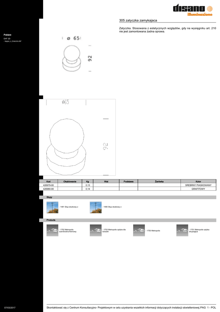 305 zatyczka zamykajaca Zatyczka. Stosowana z estetycznych względów, gdy na wysięgniku art. 210 nie jest zamontowana żadna oprawa. Pobierz DXF 2D - tappo_x_braccio.dxf Kod Okablowanie Kg Wat Podstawa Źarówka Kolor 426979-00 0,13 SREBRNY PIASKOWANY 426980-00 0,14 GRAFITOWY Słupy - 1481 Słup stozkowy z - 1480 Słup stozkowy z - 1752 Metropolis szerokostrumieniowy - 1753 Metropolis optyka dla ścieżek Products 07/03/2017 - 1750 Metropolis - 1751 Metropolis optyka skupiająca Skontaktować się z Centrum Konsultacyjno- Projektowym w celu uzyskania wszelkich informacji dotyczących instalacji oświetleniowej. PAG 1 - POL