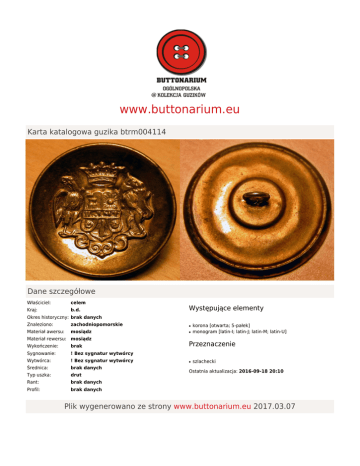 www.buttonarium.eu Karta katalogowa guzika btrm004114 Dane szczegółowe Właściciel: celem Kraj: b.d. Występujące elementy Okres historyczny: brak danych Znaleziono: zachodniopomorskie Materiał awersu: mosiądz Materiał rewersu: mosiądz Wykończenie: brak Sygnowanie: ! Bez sygnatur wytwórcy Wytwórca: ! Bez sygnatur wytwórcy Średnica: brak danych Typ uszka: drut Rant: brak danych Profil: brak danych ● ● korona [otwarta; 5-pałek] monogram [latin-I; latin-J; latin-M; latin-U] Przeznaczenie ● szlachecki Ostatnia aktualizacja: 2016-09-18 20:10 Plik wygenerowano ze strony www.buttonarium.eu 2017.03.07 Opis guzika btrm004114 Niezidentyfikowany guzik liberyjny - niewiadomej produkcji (herb na tarczy herbowej) © buttonarium.eu Awers przedstawia niezidentyfikowany herb z trzymaczami w postaci ptaka (strona zachodnia) oraz lwa (strona wschodnia), herb oprócz elementów graficznych zawiera cztery litery: odwrócone do góry nogami U oraz JMI, powyżej herbu znajduje się szlachecka korona rangowa bez klejnotu, a poniżej motywy roślinne. Rewers bez sygnatur wytwórcy. Guzik znaleziono w okolicach Szczecina w województwie zachodniopomorskim. Ciekawostka W Buttonarium występują już trzy guziki z tym herbem, w tym dwa znalezione w okolicach Szczecina: ● ● ● btrm004113 btrm004114 btrm005361 Przeznaczenie i datowanie - ogólnie Guziki liberyjne spotykano tylko przy niektórych typach liberii. Można przypuszczać, że szykowne guziki liberyjne zdobiły przede wszystkim barwne liberie paradne, i to jedynie reprezentacyjnej służby dworskiej, które czasami noszone były tylko na wyjątkowe okazje. W Europie barwne liberie paradne, zdobione szykownymi i cennymi guzikami, zaczęły być modne w II połowie XVIII wieku, a w XIX wieku były już stosunkowo popularne. Postęp techniczny spowodował obniżkę cen guzików, co wpłynęło na większą ich dostępności, a co za tym idzie i popularność. Liberie były w powszechnym użytku do wybuchu I wojny światowej, a gdzieniegdzie aż do wybuchu II wojny. Do czasów współczesnych liberie przetrwały w renomowanych hotelach, kasynach, klubach, restauracjach itp. Więcej informacji na temat liberii można znaleźć w artykule: www.buttonarium.eu - Guziki liberyjne, zbiór informacji Podstawowe rodzaje guzików liberyjnych: ● ● ● ● guziki z herbem wraz z różnymi jego elementami: godłem heraldycznym, tarczą herbową, koroną rangową, klejnotem, zawołaniem, orderem, dewizą oraz trzymaczami; guziki z samym godłem heraldycznym; guziki z monogramem (prostym lub złożonym) z koroną lub bez korony rangowej; guziki z samą koroną rangową. Ciekawostka Warto też wspomnieć o guzikach liberyjnych w wersji małżeńskiej. Na takich guzikach umieszczano najczęściej herby dwóch rodów, z których pochodzili małżonkowie, często zaznaczając pozycję każdej z rodzin poprzez dodanie odpowiedniej korony rangowej. Spotyka się również guziki na których zamiast herbów dwóch rodzin umieszczono monogramy wraz z przynależnymi im koronami rangowymi. Źródła Podobne guziki na stronie Buttonarium Polska - guziki z herbem na tarczy herbowej Podobne guziki na stronie Buttonarium Polska - guziki z herbem bez tarczy herbowej Podobne guziki na stronie Buttonarium Polska - guziki z monogramem i koroną rangową Podobne guziki na stronie Buttonarium Polska - guziki z monogramem bez korony rangowej Podobne guziki na stronie Buttonarium Polska - guziki z samą koroną rangową Podobne guziki na stronie Buttonarium Polska - guziki w wersji małżeńskiej GUZIKI LIBERYJNE KATALOG, Elbląg 1988 Zajchowski Zb. - Guziki herbowe . cz.1, Elbląg 2008 Zajchowski Zb. - Guziki herbowe . cz.2, Elbląg 2013 www.buttonarium.eu - Guziki liberyjne, zbiór informacji Wytwórca: ! Bez sygnatur wytwórcy Starsze guziki nie były w ogóle sygnowane, zdecydowana większość guzików wykonanych techniką odlewu też nie posiadała oznaczeń wytwórcy. Niektórzy producenci nie podpisywali swoich wyrobów lub tylko czasowo ich nie znakowali (np. na początku swojej działalności). Francuskie guziki wojskowe, z okresu wojen napoleońskich, przeważnie nie były sygnowane, zwłaszcza te z uszkiem typu koszyczek. Współczesne, cywilne guziki ozdobne w zdecydowanej większości nie posiadają żadnych oznaczeń wytwórcy. Przy opracowaniu opisu wykorzystano informacje od użytkowników oraz wnioski z analizy guzików w Buttonarium. Jeśli chciałbyś coś dodać do tego opisu, to napisz poniżej komentarz. Nie zapomnij podać źródeł tych informacji. Ostatnia aktualizacja: 2016-10-06 19:41 Plik wygenerowano ze strony www.buttonarium.eu 2017.03.07