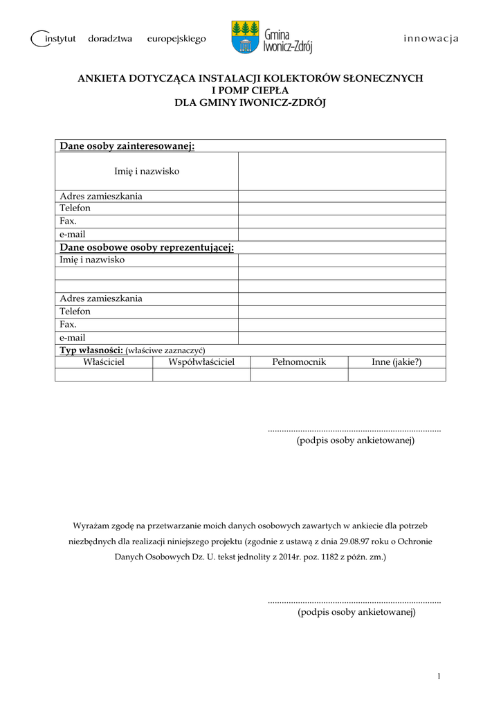 ANKIETA DOTYCZĄCA INSTALACJI KOLEKTORÓW SŁONECZNYCH I POMP CIEPŁA DLA GMINY IWONICZ-ZDRÓJ Dane osoby zainteresowanej: Imię i nazwisko Adres zamieszkania Telefon Fax. e-mail Dane osobowe osoby reprezentującej: Imię i nazwisko Adres zamieszkania Telefon Fax. e-mail Typ własności: (właściwe zaznaczyć) Właściciel Współwłaściciel Pełnomocnik Inne (jakie?) ........................................................................... (podpis osoby ankietowanej) Wyrażam zgodę na przetwarzanie moich danych osobowych zawartych w ankiecie dla potrzeb niezbędnych dla realizacji niniejszego projektu (zgodnie z ustawą z dnia 29.08.97 roku o Ochronie Danych Osobowych Dz. U. tekst jednolity z 2014r. poz. 1182 z późn. zm.) ........................................................................... (podpis osoby ankietowanej) 1 Kwestionariusz dotyczący obiektu Lokalizacja obiektu: Adres obiektu Nr działki Dane o obiekcie: Powierzchnia obiektu [m2] (z podatku od nieruchomości) Rodzaj konstrukcji obiektu [właściwą odpowiedź proszę zaznaczyć X] Typ budynku [właściwą odpowiedź proszę zaznaczyć X] Istniejące kondygnacje [właściwą odpowiedź proszę zaznaczyć X] Rok budowy obiektu Rok ostatniej modernizacji obiektu (np.: ocieplenie obiektu, ocieplenie poddasza, wymiana instalacji CO/CWU, wymiana okien na energooszczędne itp.) Ilość osób zamieszkałych w obiekcie Ilość zużywanej wody zimnej [m3/rok] Ilość zużywanej wody ciepłej [m3/rok] Czy obiekt jest pod nadzorem konserwatora zabytków? [właściwą odpowiedź proszę zaznaczyć X] Konstrukcja drewniana Konstrukcja murowana Z cegły Z pustaków Inna (jaka?) Wolnostojący Bliźniak Inny (jaki?) piwnica [] parter [] 1 piętro 2 piętro [ ] [ ] podd. użyt. [ ] TAK NIE ........................................................................... (podpis osoby ankietowanej) 2 Informacje o sieci CWU: Czy w obiekcie istnieje instalacja do produkcji CWU ? [właściwą odpowiedź proszę zaznaczyć X] TAK NIE Rodzaj i roczne zużycie paliwa do j.m. Ilość produkcji CWU: Węgiel tona Koks tona Gaz ziemny m3 Energia elektryczna kWh Olej opałowy litr Drewno m3 Propan m3 Rodzaj i roczne zużycie paliwa do j.m. Ilość produkcji ciepła c.o. Węgiel tona Koks tona Gaz ziemny m3 Energia elektryczna kWh Olej opałowy litr Drewno m3 Propan m3 Informacje o kotłowni: Lokalizacja kotłowni piwnica łazienka [właściwą odpowiedź proszę zaznaczyć X] Inna (jaka?) Typ, moc, producent kotła Rok produkcji kotła Czy istniejący piec pracuje w TAK automatyce? NIE [właściwą odpowiedź proszę zaznaczyć X] Inne: Rodzaj obiektu Kwota w [zł] Kwota w [zł] Dom mieszkalny Budynek gospodarczy (np. garaż, stajnia) Dom wypoczynkowy Budynek usługowy Budynek mieszany (mieszkalno - usługowy) Inny (jaki?) ........................................................................... (podpis osoby ankietowanej) 3 Część ankiety, którą należy wypełnić w przypadku zainteresowania montażem kolektorów słonecznych !!! Dane o dachu obiektu: Rodzaj dachu [właściwą odpowiedź proszę zaznaczyć X] Płaski Dwuspadowy Inny (jaki?) Powierzchnia dachu [m2] Konstrukcja dachu Stropodach Strych [właściwą odpowiedź proszę zaznaczyć X] Inne Materiał z którego wykonane jest Blacha dachówkowa pokrycie dachu Dachówka cementowa Dachówka ceramiczna [właściwą odpowiedź proszę zaznaczyć X] Eternit Gont drewniany Gont bitumiczny Inny (jaki?) Proszę narysować usytuowanie Państwa domu w stosunku do stron świata (w miarę możliwości załączyć zdjęcie) Północ Zachód Wschód Południe Miejsce montażu kolektora [odpowiedni rysunek proszę zaznaczyć kółkiem] ** ........................................................................... (podpis osoby ankietowanej) 4 Część ankiety, którą należy wypełnić w przypadku zainteresowania montażem pompy ciepła typu powietrze !!! Proszę o podanie wymiarów pomieszczenia w którym będzie znajdować się pompa ciepła [cm] Czy jeśli z przyczyn technicznych bądź prawnych nie byłoby możliwości zainstalowania pompy ciepła na c.w.u. czy byliby Państwo zainteresowani instalacją kolektorów słonecznych? Wysokość [cm] Długość [cm] Szerokość [cm] TAK NIE [właściwą odpowiedź proszę zaznaczyć X] ........................................................................... (podpis osoby ankietowanej) ** UWAGI: Proszę dołączyć zdjęcie południowej strony dachu. 5