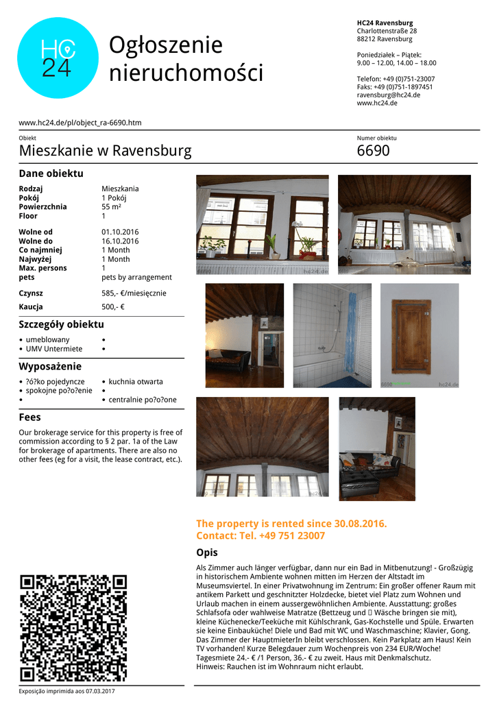 Ogłoszenie nieruchomości HC24 Ravensburg Charlottenstraße 28 88212 Ravensburg Poniedziałek – Piątek: 9.00 – 12.00, 14.00 – 18.00 Telefon: +49 (0)751-23007 Faks: +49 (0)751-1897451 [email protected] www.hc24.de www.hc24.de/pl/object_ra-6690.htm Obiekt Numer obiektu Mieszkanie w Ravensburg 6690 Dane obiektu Rodzaj Pokój Powierzchnia Floor Mieszkania 1 Pokój 55 m² 1 Wolne od Wolne do Co najmniej Najwyżej Max. persons pets 01.10.2016 16.10.2016 1 Month 1 Month 1 pets by arrangement Czynsz 585,- €/miesięcznie Kaucja 500,- € Szczegóły obiektu umeblowany UMV Untermiete Wyposażenie ?ó?ko pojedyncze spokojne po?o?enie kuchnia otwarta centralnie po?o?one Fees Our brokerage service for this property is free of commission according to § 2 par. 1a of the Law for brokerage of apartments. There are also no other fees (eg for a visit, the lease contract, etc.). The property is rented since 30.08.2016. Contact: Tel. +49 751 23007 Opis Als Zimmer auch länger verfügbar, dann nur ein Bad in Mitbenutzung! - Großzügig in historischem Ambiente wohnen mitten im Herzen der Altstadt im Museumsviertel. In einer Privatwohnung im Zentrum: Ein großer offener Raum mit antikem Parkett und geschnitzter Holzdecke, bietet viel Platz zum Wohnen und Urlaub machen in einem aussergewöhnlichen Ambiente. Ausstattung: großes Schlafsofa oder wahlweise Matratze (Bettzeug und Wäsche bringen sie mit), kleine Küchenecke/Teeküche mit Kühlschrank, Gas-Kochstelle und Spüle. Erwarten sie keine Einbauküche! Diele und Bad mit WC und Waschmaschine; Klavier, Gong. Das Zimmer der HauptmieterIn bleibt verschlossen. Kein Parkplatz am Haus! Kein TV vorhanden! Kurze Belegdauer zum Wochenpreis von 234 EUR/Woche! Tagesmiete 24.- € /1 Person, 36.- € zu zweit. Haus mit Denkmalschutz. Hinweis: Rauchen ist im Wohnraum nicht erlaubt. Exposição imprimida aos 07.03.2017 Powered by TCPDF (www.tcpdf.org)