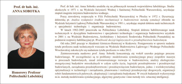 Prof. dr hab. in¿. ANNA SOBOTKA Honorowy Profesor Politechniki Lubelskiej Prof. dr hab. in¿. Anna Sobotka urodzi³a siê na pó³nocnych terenach województwa lubelskiego. Studia ukoñczy³a w 1971 r. na Wydziale In¿ynierii Wodnej i Sanitarnej Politechniki Warszawskiej, uzyskuj¹c stopieñ magistra in¿yniera budownictwa wodnego. Pracê zawodow¹ rozpoczê³a w Filii Politechniki Warszawskiej w P³ocku w 1972 r. Dysertacjê doktorsk¹ pt. Analiza wydajnoœci œrodków mechanizacji w budownictwie metod¹ symulacji obroni³a na Wydziale In¿ynierii L¹dowej Politechniki Warszawskiej w 1981 r., uzyskuj¹c stopieñ doktora nauk technicznych o specjalnoœci technologia i organizacja budownictwa. W latach 1982-2005 pracowa³a na Politechnice Lubelskiej. Stopieñ doktora habilitowanego nauk technicznych w dyscyplinie budownictwo i specjalnoœci technologia i organizacja budownictwa uzyska³a w 2001 r. na Wydziale Budownictwa, Architektury i In¿ynierii Œrodowiska Politechniki Poznañskiej na podstawie rozprawy habilitacyjnej pt. Wra¿liwoœæ decyzji logistycznych w przedsiêbiorstwie budowlanym. Od roku 2005 pracuje w Akademii Górniczo-Hutniczej w Krakowie. Postêpowanie w sprawie nadania tytu³u profesora nauk technicznych wszczête na Wydziale Budownictwa L¹dowego i Wodnego Politechniki Wroc³awskiej zakoñczy³o siê nadaniem tytu³u profesora w roku 2012. Zainteresowania naukowe prof. Anny Sobotki koncentruj¹ siê wokó³ szeroko pojêtego procesu budowlanego. W szczególnoœci s¹ to problemy: modelowania symulacyjnego pracy zespo³ów maszyn w procesach budowlanych, zasad zrównowa¿onego rozwoju w budownictwie, analizy ekologicznoenergetycznej budynków mieszkalnych w ca³ym cyklu ¿ycia, logistyki przedsiêbiorstw i przedsiêwziêæ budowlanych, zarz¹dzania przedsiêbiorstwem i przedsiêwziêciem budowlanym, jedno- i wielokryterialnej optymalizacji w technologii i zarz¹dzaniu, planowania i realizacji przedsiêwziêæ drogowych, organizacji robót fundamentowych palowych, eksploatacji i zarz¹dzania budynkami. W swych badaniach wykorzystuje m.in. metodê modelowania symulacyjnego, algorytmy genetyczne i inne metody tzw. sztucznej inteligencji. Prof. Anna Sobotka jest autork¹ lub wspó³autork¹ 179 publikacji. Na dorobek ten sk³ada siê: 11 monografii (w tym 2 autorskie), 6 podrêczników (w tym 3 autorskie), 25 artyku³ów w czasopismach o zasiêgu miêdzynarodowym, 77 artyku³ów w czasopismach polskich, 22 referaty w jêzyku angielskim, 39 referatów w jêzyku polskim. Wed³ug bazy Web of Science by³a cytowana 34 razy (h=2), wed³ug bazy SCOPUS – 73 razy (h=5). Uczestniczy³a w czterech projektach badawczych KBN (w trzech by³a kierownikiem), jednym projekcie badawczym NCN i jednej pracy badawczej w ramach centralnego programu CPBP. Realizowa³a równie¿ tzw. granty w³asne i zadania statutowe finansowane przez zatrudniaj¹ce j¹ uczelnie. Od rozpoczêcia pracy prof. Anna Sobotka prowadzi³a zajêcia dydaktyczne. Tworzy³a oraz wdra¿a³a plany i programy studiów. Pracowa³a nad unowoczeœnieniem kszta³cenia i popraw¹ jego jakoœci, m.in. wspó³tworzy³a ministerialne standardy dla kierunku budownictwo. Obecnie jest cz³onkiem Zespo³u Nauk Technicznych Polskiej Komisji Akredytacyjnej. By³a promotorem ponad 200 prac magisterskich i in¿ynierskich. Z dyplomantami opublikowa³a 13 prac naukowych, by³a te¿ siedmiokrotnie wyró¿niania jako promotor nagrodzonych przez Ministra Infrastruktury prac dyplomowych i jednej pracy doktorskiej. Za pracê zwi¹zan¹ z dydaktyk¹ otrzyma³a w roku 2009 Medal Komisji Edukacji Narodowej. By³a tak¿e promotorem czterech obronionych rozpraw doktorskich, obecnie jest opiekunem czterech doktorantów. Recenzowa³a cztery dysertacje doktorskie, jedn¹ monografiê habilitacyjn¹, by³a recenzentem w jednym przewodzie habilitacyjnym i w jednym postêpowaniu o tytu³ naukowy profesora. Za ca³okszta³t dzia³alnoœci zwi¹zanej z dziedzin¹ organizacji i zarz¹dzania w budownictwie otrzyma³a w 2001 r. Nagrodê Polskiego Zwi¹zku In¿ynierów i Techników Budownictwa im. Profesora Aleksandra Dy¿ewskiego. Obecnie jest cz³onkiem kapitu³y tej nagrody. Dwukrotnie by³a nagradzana za publikacje przez Ministra Infrastruktury. Szczególne miejsce w dzia³alnoœci prof. Anny Sobotki zajmuje Politechnika Lubelska. Pracowa³a tu na Wydziale In¿ynierii Budowlanej i Sanitarnej, kierowa³a Zak³adem In¿ynierii Procesów Budowlanych i Inwestycyjnych. Piastowa³a stanowisko prodziekana do spraw nauki oraz prodziekana do spraw kszta³cenia. Autorami wszystkich nagrodzonych przez Ministra Infrastruktury prac dyplomowych pisanych pod opiek¹ Pani Profesor byli studenci Politechniki Lubelskiej. Prof. Anna Sobotka by³a promotorem trzech doktoratów pracowników Politechniki Lubelskiej: P. Jaœkowskiego, A. Czarnigowskiej i R. Buconia. Pomimo zmiany miejsca pracy utrzymuje œcis³e kontakty z by³ymi wspó³pracownikami, czego wyrazem s¹ wspólne publikacje, projekt badawczy NCN oraz przygotowywanie kolejnych wniosków projektów badawczych, konsultacje prac i wyników badañ. W roku 2014 wydana zosta³a monografia pt. Zarz¹dzanie ³añcuchami dostaw w budownictwie. Wybrane metody i modele w budownictwie drogowym, której wspó³autorami s¹ lubelscy wychowankowie Pani Profesor.
