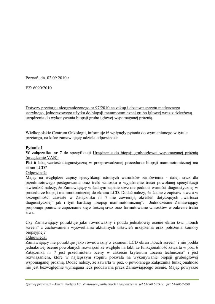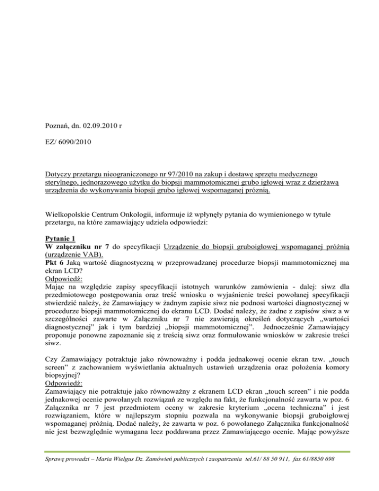 Poznań, dn. 02.09.2010 r EZ/ 6090/2010 Dotyczy przetargu nieograniczonego nr 97/2010 na zakup i dostawę sprzętu medycznego sterylnego, jednorazowego użytku do biopsji mammotomicznej grubo igłowej wraz z dzierżawą urządzenia do wykonywania biopsji grubo igłowej wspomaganej próznią. Wielkopolskie Centrum Onkologii, informuje iż wpłynęły pytania do wymienionego w tytule przetargu, na które zamawiający udziela odpowiedzi: Pytanie 1 W załączniku nr 7 do specyfikacji Urządzenie do biopsji gruboigłowej wspomaganej próżnią (urządzenie VAB). Pkt 6 Jaką wartość diagnostyczną w przeprowadzanej procedurze biopsji mammotomicznej ma ekran LCD? Odpowiedź: Mając na względzie zapisy specyfikacji istotnych warunków zamówienia - dalej: siwz dla przedmiotowego postępowania oraz treść wniosku o wyjaśnienie treści powołanej specyfikacji stwierdzić należy, że Zamawiający w żadnym zapisie siwz nie podnosi wartości diagnostycznej w procedurze biopsji mammotomicznej do ekranu LCD. Dodać należy, że żadne z zapisów siwz a w szczególności zawarte w Załączniku nr 7 nie zawierają określeń dotyczących „wartości diagnostycznej” jak i tym bardziej „biopsji mammotomicznej”. Jednocześnie Zamawiający proponuje ponowne zapoznanie się z treścią siwz oraz formułowanie wniosków w zakresie treści siwz. Czy Zamawiający potraktuje jako równoważny i podda jednakowej ocenie ekran tzw. „touch screen” z zachowaniem wyświetlania aktualnych ustawień urządzenia oraz położenia komory biopsyjnej? Odpowiedź: Zamawiający nie potraktuje jako równoważny z ekranem LCD ekran „touch screen” i nie podda jednakowej ocenie powołanych rozwiązań ze względu na fakt, że funkcjonalność zawarta w poz. 6 Załącznika nr 7 jest przedmiotem oceny w zakresie kryterium „ocena techniczna” i jest rozwiązaniem, które w najlepszym stopniu pozwala na wykonywanie biopsji gruboigłowej wspomaganej próżnią. Dodać należy, że zawarta w poz. 6 powołanego Załącznika funkcjonalność nie jest bezwzględnie wymagana lecz poddawana przez Zamawiającego ocenie. Mając powyższe Sprawę prowadzi – Maria Wielgus Dz. Zamówień publicznych i zaopatrzenia tel.61/ 88 50 911, fax 61/8850 698 na względzie stwierdzić należy, że Zamawiający podtrzymuje zapisy siwz, nie dokonując w nich żadnych zmian. Pkt 8 Czy Zamawiający potraktuje jako równoważny i podda jednakowej ocenie system VAB umożliwiający automatyczne pobieranie oraz gromadzenie i przepłukiwanie pobranych wycinków w nieprzezroczystym zbiorniku, pozwalającym na obserwację i wizualną ocenę pobranych wycinków? Odpowiedź: Zamawiający nie potraktuje jako równoważny i nie podda jednakowej ocenie z systemem opisanym w pozycji 8 Załącznika nr 7 do siwz system VAB umożliwiający automatyczne pobieranie oraz gromadzenie i przepłukiwanie pobranych wycinków w nieprzezroczystym zbiorniku, pozwalającym na obserwację i wizualną ocenę pobranych wycinków ze względu na fakt, że funkcjonalność zawarta w pozycji 8 powołanego Załącznika jest przedmiotem oceny w zakresie kryterium „ocena techniczna” i jest rozwiązaniem, które według Zamawiającego w najlepszym stopniu pozwala na wykonywanie zabiegu biopsji gruboigłowej wspomaganej próżnią. W związku z powyższym Zamawiający podtrzymuje zapisy siwz i nie dokonuje żadnych zmian. Pkt 10 Jakie znaczenie diagnostyczne ma parametr oceniany „Zakończenie procesu pobierania wycinka sygnalizowane sygnałem dźwiękowym”? Odpowiedź: Po ponownej dokładnej analizie treści siwz dla przedmiotowego postępowania oraz poddając wnikliwej analizie treść wniosku o wyjaśnienie w powyższym zakresie Zamawiający stwierdza, że w żadnym zapisie siwz nie podnosi wartości diagnostycznej funkcjonalności „Zakończenie procesu pobierania wycinka sygnalizowane sygnałem dźwiękowym”, lecz jedynie poddaje ocenie tę funkcjonalność w zakresie kryterium „ocena techniczna”. Zamawiający podtrzymuje zapisy siwz w zakresie ocenianych parametrów i nie dokonuje żadnych zmian w siwz. Pkt 11 Czy Zamawiający potraktuje jako równoważny i podda jednakowej ocenie dwie różne rękojeści przeznaczone do biopsji pod kontrolą USG i RTG? Rękojeść wraz z igłą do biopsji pod zobrazowanie RTG umożliwia pobieranie wycinków ze zmiany położonych blisko klatki piersiowej. Odpowiedź: Zamawiający podtrzymuje zapisy siwz w zakresie ocenianych parametrów i nie dokonuje żadnych zmian. Dodać należy, że funkcjonalność opisana w poz. 11 Załącznika nr 7 do siwz została przez Zamawiającego opisana w sposób jednoznaczny i nie budzący wątpliwości a powyższy wniosek nie dotyczy wyjaśnienia lecz zmiany treści siwz. Dodać należy, że jedna rękojeść do wykonywania zabiegów zarówno pod kontrolą USG jak i również biopsji stereotaktycznej pod kontrolą MMG jest znacznie lepszym i oczywistym rozwiązaniem niż dwie rękojeści. Zamawiający nie ogranicza możliwości złożenia oferty przez żadnego z wykonawców jednak określone funkcjonalności w Załączniku nr 7 do siwz są ważne i istotne do wykonywania zabiegu biopsji gruboigłowej wspomaganej próżnią. Pytanie 2 załączniku nr 7 do specyfikacji Igła biopsyjna do biopsji gruboigłowej wspomaganej próżnią. Pkt 5 Czy Zamawiający potraktuje jako równoważny i podda jednakowej ocenie parametr „Pełny ruch obrotowy igły biopsyjnej w zakresie 0-360 stopni przy nieruchomej rękojeści z wkrawającym conajmniej półobrotowym ruchem noża tnącego w celu odcięcia wycinka”? Odpowiedź: Zamawiający przyzna 10 pkt. w zakresie kryterium ocena techniczna dla zaoferowanego wyrobu medycznego spełniającego funkcjonalność w postaci pełnego ruchu obrotowego igły biopsyjnej w Sprawę prowadzi – Maria Wielgus Dz. Zamówień publicznych i zaopatrzenia tel.61/ 88 50 911, fax 61/8850 698 zakresie 0-360 stopni przy nieruchomej rękojeści z wkrawającym powtarzalnym pó