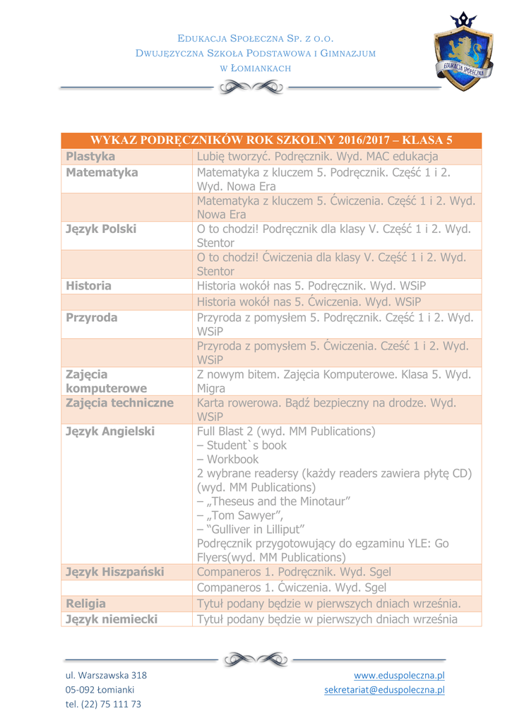 EDUKACJA SPOŁECZNA SP. Z O.O. DWUJĘZYCZNA SZKOŁA PODSTAWOWA I GIMNAZJUM W ŁOMIANKACH WYKAZ PODRĘCZNIKÓW ROK SZKOLNY 2016/2017 – KLASA 5 Plastyka Lubię tworzyć. Podręcznik. Wyd. MAC edukacja Matematyka Matematyka z kluczem 5. Podręcznik. Część 1 i 2. Wyd. Nowa Era Matematyka z kluczem 5. Ćwiczenia. Część 1 i 2. Wyd. Nowa Era Język Polski O to chodzi! Podręcznik dla klasy V. Część 1 i 2. Wyd. Stentor O to chodzi! Ćwiczenia dla klasy V. Część 1 i 2. Wyd. Stentor Historia Historia wokół nas 5. Podręcznik. Wyd. WSiP Historia wokół nas 5. Ćwiczenia. Wyd. WSiP Przyroda Przyroda z pomysłem 5. Podręcznik. Część 1 i 2. Wyd. WSiP Przyroda z pomysłem 5. Ćwiczenia. Cześć 1 i 2. Wyd. WSiP Zajęcia Z nowym bitem. Zajęcia Komputerowe. Klasa 5. Wyd. komputerowe Migra Zajęcia techniczne Karta rowerowa. Bądź bezpieczny na drodze. Wyd. WSiP Język Angielski Full Blast 2 (wyd. MM Publications) – Student`s book – Workbook 2 wybrane readersy (każdy readers zawiera płytę CD) (wyd. MM Publications) – „Theseus and the Minotaur” – „Tom Sawyer”, – “Gulliver in Lilliput” Podręcznik przygotowujący do egzaminu YLE: Go Flyers(wyd. MM Publications) Język Hiszpański Companeros 1. Podręcznik. Wyd. Sgel Companeros 1. Ćwiczenia. Wyd. Sgel Religia Tytuł podany będzie w pierwszych dniach września. Język niemiecki Tytuł podany będzie w pierwszych dniach września ul. Warszawska 318 05-092 Łomianki tel. (22) 75 111 73 www.eduspoleczna.pl [email protected]