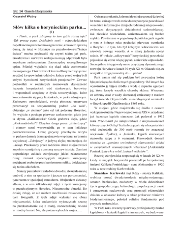 Str. 14 Gazeta Horyniecka Krzysztof Woźny Słów kilka o horynieckim parku... (1) - Panie, a park zdrojowy to tam gdzie rosną tuje? -Tak proszę pana. Dokładnie tam! - odpowiedziałem napotkanemu przechodniowi grzecznie, a zarazem z pewną dumą, że tutaj w Horyńcu na przysłowiowym”końcu świata” można pochwalić się czymś takim jak park. Gwałtowna i nerwowa reakcja na moją odpowiedź była zupełnym zaskoczeniem. Zaoszczędzę szczegółowego opisu. Później wyjaśniło się skąd takie zachowanie nieznajomego. Otóż człowiek ten znał Horyniec wyłącznie ze zdjęć i z opowiadań rodziców, którzy przed wojną byli stałymi bywalcami horynieckich pensjonatów. Zawsze podkreślali w rodzinnych rozmowach skuteczność leczenia horynieckich wód siarkowych, borowiny i wspominali anegdoty z życia towarzyskiego, które koncentrowało się przy łazienkach, w parku zdrojowym. Zachęcony opowieściami, swoją pierwszą emeryturę przeznaczył na sentymentalną podróż „do wód”, obierając „w ciemno” jako cel tak polecany Horyniec. Po wyjściu z pociągu pierwsze zaskoczenie: gdzie jest ta słynna „Kalikstówka? Gdzie grabowa aleja, gdzie „Aleksandrówka”? Okrężna droga przez „śmierdzący” i ciemny tunel wprowadziła go w stan lekkiego podenerwowania. Czarę goryczy przechyliła wizyta w parku o dumnie brzmiącej nazwie wypisanej na bramie wejściowej „Zdrojowy” z jedyną alejką zmierzającą do ...nikąd. Przekazany przez rodziców obraz miejscowości zupełnie rozmijał się z zastaną rzeczywistością. Zamiast wspaniałego zakładu zdrojowego jakieś zakrzaczone ruiny, zamiast spacerujących alejkami kuracjuszy podejrzani osobnicy przy kamiennym stoliku, delektujący się tanim alkoholem. Starszy pan zabawił zaledwie dwa dni, ale udało mi się umówić z nim na spotkanie i jeszcze raz porozmawiać, tym razem w spokojnej atmosferze. Obejrzałem ciekawy album, a w nim kilkadziesiąt zdjęć z życia kuracjuszy w przedwojennym Horyńcu. Niesamowite obrazki. Do dzisiaj żałuję, że nie miałem możliwości zeskanowania tych fotografii. Z tych zdjęć wyłaniał się obraz miejscowości, która znakomicie wykorzystała szansę na przekształcenie się z małej, roztoczańskiej wioski w modny kurort. No, ale potem wybuchła wojna...... Opisane spotkanie, które miało miejsce ponad dziewięć lat temu, zainspirowało mnie do rozpoczęcia poszukiwań wszelkich informacji o dziejach rodzinnej miejscowości, zwłaszcza dotyczących działalności uzdrowiskowej. Jak niewiele wiedziałem, zorientowałem się bardzo szybko. Powtarzane w popularnych publikacjach regułki o tym z którego roku pochodzi pierwsza wzmianka o Horyńcu i o tym, kto był kolejnym właścicielem wsi niewiele nowego wnosiły. A w miarę jedzenia apetyt rośnie. W trakcie „odkrywania” horynieckiej przeszłości pojawiało się coraz więcej pytań, a niewiele odpowiedzi. Szczególnie intrygowały mnie przyczyny dynamicznego rozwoju Horyńca w latach 30-tych XX w. Okazało się, że wszystkie drogi prowadzą do......parku! Park zanim stał się parkiem był zwyczajną kośną łąką należącą do okolicznych gospodarzy. Od innych łąk wyróżniało ją bijące źródło z wodą o zapachu zgniłych jaj, która leczyła wszelkie choroby skórne. Wierzono, że zebrany osad z wody siarczanej zmieszany z masłem leczył świerzb. O tym źródle mineralnym jest wzmianka w Encyklopedii Olgelbranda z 1863 roku. W miejscu gdzie znajdowało się źródło z czasem wykopano studnię. Na pewno pod koniec XIX w. urządzano już lecznicze kąpiele siarczane. Jak podawał w 1912 roku Przewodnik po zdrojowiskach i miejscowościach klimatycznych Galicji liczba leczących się u horynieckich wód dochodziła do 300 osób rocznie (w znaczącej większości Żydów), a „łazienki„ kąpieli siarczanych stanowiła szopa z 6 wannami. Przewodnik donosił również że „pomimo stwierdzonej skuteczności źródeł w cierpieniach reumatycznych właściciel [Aleksander Poniński] nie chce robić żadnych wkładów”. Rozwój zdrojowiska rozpoczął się w latach 20 XX w. kiedy to majątek horyniecki przeszedł po bezpotomnej śmierci Kaliksta Ponińskiego - syna Aleksandra w 1920 roku w ręce rodziny Karłowskich. Stanisław Karłowski mąż Róży - siostry Kaliksta, wybitna postać dwudziestolecia międzywojennego, senator, bankowiec, zasłużony w wielu dziedzinach życia gospodarczego, balneologii, popularyzacji nauki i opracowań naukowych oraz promocji różnorakich działań w obszarze kultury a także prekursor rolnictwa biodynamicznego, położył solidne fundamenty pod przyszłe uzdrowisko. W 1923 roku otworzył pierwszy profesjonalny zakład kąpielowy - łazienki kąpieli siarczanych, wybudowane