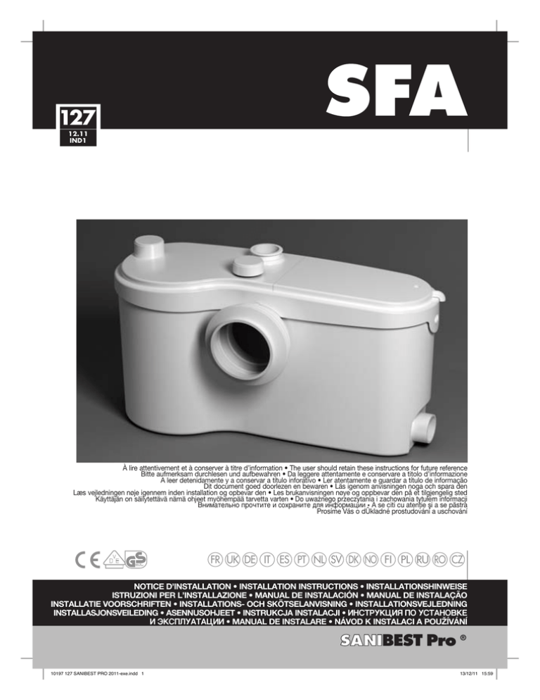 127 1 12.11 IND1 À lire attentivement et à conserver à titre d’information • The user should retain these instructions for future reference Bitte aufmerksam durchlesen und aufbewahren • Da leggere attentamente e conservare a titolo d’informazione A leer detenidamente y a conservar a título inforativo • Ler atentamente e guardar a título de informação Dit document goed doorlezen en bewaren • Läs igenom anvisningen noga och spara den Læs vejledningen nøje igennem inden installation og opbevar den • Les brukanvisningen nøye og oppbevar den på et tilgjengelig sted Käyttäjän on säilytettävä nämä ohjeet myöhempää tarvetta varten • Do uwaœnego przeczytania i zachowania tytu$em informacji ÇÌËχÚÂθÌÓ ÔÓ˜ÚËÚÂ Ë ÒÓı‡ÌËÚ ‰Îfl ËÌÙÓχˆËË • A se citi cu atenţie şi a se păstra Prosíme Vás o dÛkladné prostudování a uschování gepr fte Sicherheit FR UK DE IT ES PT NL SV DK NO FI PL RU RO CZ NOTICE D’INSTALLATION • INSTALLATION INSTRUCTIONS • INSTALLATIONSHINWEISE ISTRUZIONI PER L’INSTALLAZIONE • MANUAL DE INSTALACIÓN • MANUAL DE INSTALAÇÃO INSTALLATIE VOORSCHRIFTEN • INSTALLATIONS- OCH SKÖTSELANVISNING • INSTALLATIONSVEJLEDNING INSTALLASJONSVEILEDING • ASENNUSOHJEET • INSTRUKCJA INSTALACJI • àçëíêìäñàü èé ìëíÄçéÇäÖ à ùäëèãìÄíÄñàà • MANUAL DE INSTALARE • NÁVOD K INSTALACI A POUŽÍVÁNÍ BEST Pro ® 10197 127 SANIBEST PRO 2011-exe.indd 1 13/12/11 15:59 FR NOTICE D’INSTALLATION UK INSTALLATION INSTRUCTIONS DE INSTALLATIONSHINWEISE IT ISTRUZIONI PER L’INSTALLAZIONE ES MANUAL DE INSTALACIÓN PT MANUAL DE INSTALAÇÃO NL INSTALLATIE VOORSCHRIFTEN SV INSTALLATIONS - OCH SKÖTSELANVISNING DK INSTALLATIONSVEJLEDNING NO INSTALLASJONSVEILEDING ............................................................................................................................................................................................................................................................................................................................... .................................................................................................................................................................................................................................................................................................. .......................................................................................................................................................................................................................................................................................................................... p. 8 p. 10 ........................................................................................................................................................................................................................................................................ p. 13 ....................................................................................................................................................................................................................................................................................................................... p. 15 ........................................................................................................................................................................................................................................................................................................................... p. 17 ................................................................................................................................................................................................................................................................................................ p. 19 ........................................................................................................................................................................................................................... p. 21 .......................................................................................................................................................................................................................................................................................... p. 23 ............................................................................................................................................................................................................................................................................................... p. 25 ...................................................................................................................................................................................................................................................................................................................................................................... p. 27 FI ASENNUSOHJEET PL INSTRUKCJA INSTALACJI RU ИНСТРУКЦИЯ ПО УСТАНОВКЕ RO MANUAL DE INSTALARE CZ p. 6 ............................................................................................................................................................................................................................................................................................................................. p. 29 ............................................................................................................................................................................................................................................................................................... p. 31 ................................................................................................................................................
