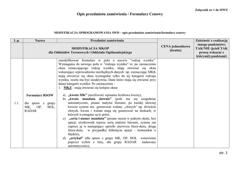 Załącznik nr 1 do SIWZ Opis przedmiotu zamówienia / Formularz Cenowy MODYFIKACJA OPROGRAMOWANIA SWD – opis przedmiotu zamówienia/formularz cenowy L.p. Nazwa Przedmiot zamówienia MODYFIKACJA MKOP dla Oddziałów Terenowych i Oddziału Ogólnomiejskiego CENA jednostkowa (brutto) Zależność z realizacją innego punktu(ów) TAK/NIE (jeżeli TAK proszę wskazać z którym(i) punktami) zmodyfikować formularz w polu o nazwie ”rodzaj wyniku”. Wymagania do nowego pola w ”rodzaju wyniku” to: po zaznaczeniu okna oznaczającego rodzaj wyniku, mają otwierać się okna wskazujące wprowadzenie niezbędnych danych np. zaznaczając MKK mają otworzyć się okna wymagalne tylko do tej kategorii rodzaju wyniku, reszta ma być nieaktywna. Dane które mają się otwierać przy danej kategorii wyniku: Po zaznaczeniu : 1. MKZ - mają otwierać się kolejno okna: Formularz RSOW 1.1. dla spraw z grupy MK, OP, HOL, RADAR a) „kwota MK” (możliwość wpisania liczbowo kwoty), b) „kwota mandatu słownie” (pole ma się uzupełniać automatycznie, pisane małymi literami, po każdej słownej kwocie system ma generować walutę: „złotych” np. dwieście złotych, kwota i waluta mają się generować na drukach, w których wymagane są te pola), c) „seria i numer mandatu” (pisane razem w jednym oknie, bez spacji, użytkownik wpisze serię małymi literami, system zaś zapisze ją w następujący sposób: pierwsza litera-duża, druga litera-duża, w przypadku kliknięcia spacji - komunikat o błędzie), d) „artykuł” (dla spraw z grupy MK, OP, HOL wstawienie poprzez wybór z listy, dla grupy RADAR nadawany automatycznie), str. 1 e) „numer służbowy rozliczającego” ( dla spraw z grupy MK, OP, HOL- wybór z listy numeru z nazwiskiem i imieniem funkcjonariusza; dla spraw z grupy RADAR muszą być widoczni tylko funkcjonariusze OOG), f) „kod czynu” (dla spraw z grupy MK, OP, HOL wstawienie poprzez wybór z listy, dla grupy RADAR nadawany automatycznie), g) „punkty” (generowane z automatu), h) „data zapłacenia mandatu” (oddzielne okna na dzień, miesiąc , rok-dane rozwijane z listy, zaznaczenie poprzez wybór dnia, miesiąca roku- tak jak jest obecna funkcjonalność), i) ”data zakończenia sprawy” (oddzielne okna na dzień, miesiąc, rok - dane rozwijane z listy , zaznaczenie poprzez wybór dnia, miesiąca roku- tak jak jest obecna funkcjonalność), j) „zakończ sprawę” (zakończenie sprawy powoduje jej zamknięcie poprzez pojawienie się komunikatu „sprawa zamknięta”), 2. MKG: mają otwierać się kolejno okna: a) „kwota MK” (możliwość wpisania liczbowo kwoty), b) „kwota mandatu słownie” (pole ma się uzupełniać automatycznie, pisane małymi literami, po każdej słownej kwocie system ma generować walutę: złotych np. dwieście złotych, kwota i waluta mają się generować na drukach w których wymagane są te pola), c) „seria i numer mandatu” – (pisane razem w jednym oknie, bez spacji, użytkownik wpisze serię małymi literami, system zaś zapisze ją w następujący sposób: pierwsza litera-duża, druga litera -duża, w przypadku kliknięcia spacji - komunikat o błędzie), d) „artykuł” (dla spraw z grupy MK, OP, HOL wstawienie poprzez wybór z listy, dla grupy RADAR nadawany str. 2 e) f) g) h) i) automatycznie), „numer służbowy rozliczającego” ( dla spraw z grupy MK, OP, HOL - wybór z listy numeru z nazwiskiem i imieniem funkcjonariusza; dla spraw z grupy RADAR muszą być widoczni tylko funkcjonariusze OOG), „kod czynu” (dla spraw z grupy MK, OP, HOL wstawienie poprzez wybór z listy, dla grupy RADAR nadawany automatycznie), „punkty” (generowane z automatu), „data zakończenia sprawy” (oddzielne okna na dzień, miesiąc, rok - dane rozwijane z listy, zaznaczenie poprzez wybór dnia, miesiąca roku - tak jak jest obecna funkcjonalność), „zakończ sprawę” (zakończenie sprawy powoduje jej zamknięcie poprzez pojawienie się komunikatu „sprawa zamknięta” 3. MKK mają otwierać się kolejno okna: a) dodać checkbox ”z oświadczenia” zaznaczenie tego okna spowoduje, że numery spraw przeniosą się do folderu „OCZEKUJE NA ZPO”(tylko do spraw z grupy RADAR) b) „kwota MK” (możliwość wpisania liczbowo kwoty), c) „kwota mandatu słownie” (pole ma się uzupełniać automatycznie, pisane małymi literami, po każdej słownej kwocie system ma generować walutę: złotych np. dwieście złotych, kwota i waluta mają się generować na drukach, w których wymagane są te pola ), d) „seria i numer mandatu” (pisane razem w jednym oknie, bez spacji, użytkownik wpisze serię małymi literami, system zaś zapisze ją w następujący sposób: pierwsza litera - duża, druga str. 3 e) f) g) h) i) j) litera – duża, w przypadku kliknięcia spacji - komunikat o błędzie), „artykuł” (dla spraw z grupy MK, OP, HOL wstawienie poprzez wybór z listy, dla grupy RADAR nadawany automatycznie), numer służbowy rozliczającego ( dla spraw z grupy MK, OP, HOL - wybór z listy numeru z nazwiskiem i imieniem funkcjonariusza; dla spraw z grupy RADAR muszą być widoczni tylko funkcjonariusze OOG), „kod czynu” (dla spraw z grupy MK, OP, HOL wstawienie poprzez wybór z listy, dla grupy RADAR nadawany automatycznie), „punkty” (generowane z automatu), „data zakończenia sprawy” (oddzielne okna na dzień, miesiąc , rok-dane rozwijane z listy, zaznaczenie poprzez wybór dnia, miesiąca roku- tak jak jest obecna funkcjonalność), „zakończ sprawę” (zakończenie sprawy powoduje jej zamknięcie poprzez pojawienie się komunikatu „sprawa zamknięta”) 4. MKKE : czyli mandat wygenerowany przez system - mają otwierać się kolejno okna: a) dodać checkbox ”z oświadczenia” zaznaczenie tego okna spowoduje, że numery spraw przeniosą się do folderu „OCZEKUJE NA ZPO”(tylko do spraw z grupy RADAR) b) „kwota MK” (możliwość wpisania liczbowo kwoty), c) „kwota mandatu