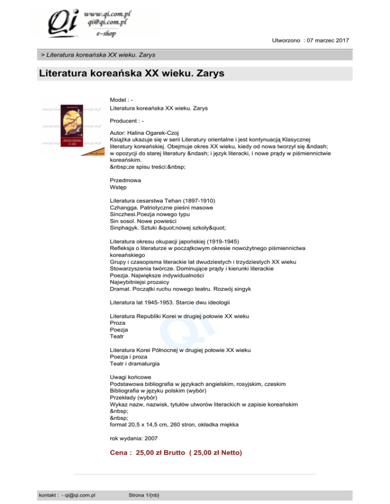 Utworzono : 07 marzec 2017 > Literatura koreańska XX wieku. Zarys Literatura koreańska XX wieku. Zarys Model : Literatura koreańska XX wieku. Zarys Producent : Autor: Halina Ogarek-Czoj Książka ukazuje się w serii Literatury orientalne i jest kontynuacją Klasycznej literatury koreańskiej. Obejmuje okres XX wieku, kiedy od nowa tworzył się – w opozycji do starej literatury – i język literacki, i nowe prądy w piśmiennictwie koreańskim. ze spisu treści: Przedmowa Wstęp Literatura cesarstwa Tehan (1897-1910) Czhangga. Patriotyczne pieśni masowe Sinczhesi.Poezja nowego typu Sin sosol. Nowe powieści Sinphagyk. Sztuki "nowej szkoły" Literatura okresu okupacji japońskiej (1919-1945) Refleksja o literaturze w początkowym okresie nowożytnego piśmiennictwa koreańskiego Grupy i czasopisma literackie lat dwudziestych i trzydziestych XX wieku Stowarzyszenia twórcze. Dominujące prądy i kierunki literackie Poezja. Największe indywidualności Najwybitniejsi prozaicy Dramat. Początki ruchu nowego teatru. Rozwój singyk i Q Literatura lat 1945-1953. Starcie dwu ideologii Literatura Republiki Korei w drugiej połowie XX wieku Proza Poezja Teatr Literatura Korei Północnej w drugiej połowie XX wieku Poezja i proza Teatr i dramaturgia Uwagi końcowe Podstawowa bibliografia w językach angielskim, rosyjskim, czeskim Bibliografia w języku polskim (wybór) Przekłady (wybór) Wykaz nazw, nazwisk, tytułów utworów literackich w zapisie koreańskim format 20,5 x 14,5 cm, 260 stron, okładka miękka rok wydania: 2007 Cena : 25,00 zł Brutto ( 25,00 zł Netto) kontakt : - [email protected] Strona 1/{nb} Utworzono : 07 marzec 2017 > Literatura koreańska XX wieku. Zarys Literatura koreańska XX wieku. Zarys Dostępność: Produkt dostępny w naszym sklepie od 20 grudzień 2008 i Q kontakt : - [email protected] Strona 2/{nb}