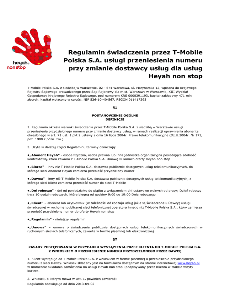 Regulamin świadczenia przez T-Mobile Polska S.A. usługi przeniesienia numeru przy zmianie dostawcy usług dla usług Heyah non stop T-Mobile Polska S.A. z siedzibą w Warszawie, 02 - 674 Warszawa, ul. Marynarska 12, wpisana do Krajowego Rejestru Sądowego prowadzonego przez Sąd Rejonowy dla m.st. Warszawy w Warszawie, XIII Wydział Gospodarczy Krajowego Rejestru Sądowego, pod numerem KRS 0000391193, kapitał zakładowy 471 mln złotych, kapitał wpłacony w całości, NIP 526-10-40-567, REGON 011417295 §1 POSTANOWIENIE OGÓLNE DEFINICJE 1. Regulamin określa warunki świadczenia przez T-Mobile Polska S.A. z siedzibą w Warszawie usługi przeniesienia przydzielonego numeru przy zmianie dostawcy usług, w ramach realizacji uprawnienia abonenta określonego w art. 71 ust. 1 pkt 2 ustawy z dnia 16 lipca 2004r. Prawo telekomunikacyjne (Dz.U.2004r. Nr 171, poz. 1800 z późn. zm.). 2. Użyte w dalszej części Regulaminu terminy oznaczają: •„Abonent Heyah" - osoba fizyczna, osoba prawna lub inna jednostka organizacyjna posiadająca zdolność kontraktową, która zawarła z T-Mobile Polska S.A. Umowę w ramach oferty Heyah non stop •„Biorca" - inny niż T-Mobile Polska S.A. dostawca publicznie dostępnych usług telekomunikacyjnych, do którego sieci Abonent Heyah zamierza przenieść przydzielony numer •„Dawca" - inny niż T-Mobile Polska S.A. dostawca publicznie dostępnych usług telekomunikacyjnych, z którego sieci Klient zamierza przenieść numer do sieci T-Mobile •„Dni robocze" - dni od poniedziałku do piątku z wyłączeniem dni ustawowo wolnych od pracy; Dzień roboczy trwa 10 godzin roboczych, które biegną od godziny 9:00 do 19:00 Dnia roboczego •„Klient" – abonent lub użytkownik (w zależności od rodzaju usług jakie są świadczone u Dawcy) usługi świadczonej w ruchomej publicznej sieci telefonicznej operatora innego niż T-Mobile Polska S.A., który zamierza przenieść przydzielony numer do oferty Heyah non stop •„Regulamin" - niniejszy regulamin •„Umowa” – umowa o świadczenie publicznie dostępnych usług telekomunikacyjnych świadczonych w ruchomych sieciach telefonicznych, zawarta w formie pisemnej lub elektronicznej §2 ZASADY POSTĘPOWANIA W PRZYPADKU WYSTĄPIENIA PRZEZ KLIENTA DO T-MOBILE POLSKA S.A. Z WNIOSKIEM O PRZENIESIENIE NUMERU PRZYDZIELONEGO PRZEZ DAWCĘ 1. Klient występuje do T-Mobile Polska S.A. z wnioskiem w formie pisemnej o przeniesienie przydzielonego numeru z sieci Dawcy. Wniosek składany jest na formularzu dostępnym na stronie internetowej www.heyah.pl w momencie składania zamówienia na usługi Heyah non stop i podpisywany przez Klienta w trakcie wizyty kuriera. 2. Wniosek, o którym mowa w ust. 1, powinien zawierać: Regulamin obowiązuje od dnia 2013-09-02 2.1 W przypadku Klienta będącego osobą fizyczną: a) imię i nazwisko, b) numer PESEL, a w przypadku osoby nieposiadającej numeru PESEL – nazwę i numer dokumentu stwierdzającego tożsamość, c) adres korespondencyjny; 2.2 W przypadku Klienta niebędącego osoba fizyczna: a) nazwę, b) numer identyfikacyjny REGON lub NIP, o ile został nadany lub numer w rejestrze przedsiębiorców albo ewidencji działalności gospodarczej lub innym właściwym rejestrze prowadzonym w państwie członkowskim, c) siedzibę i adres korespondencyjny; 2.3. przydzielony numer, o przeniesienie, którego wnioskuje Klient; 2.4. wnioskowany termin przeniesienia numeru; 2.5. wybrany przez Klienta sposób poinformowania go o rozpoczęciu świadczenia usług: a) SMS; b) e-mail; c) telefon. 3. Do wniosku, o którym mowa w ust. 1 musi być dołączone oświadczenie (formularz „Oświadczenie”), którego wzór stanowi załącznik Rozporządzenia Ministra Infrastruktury z dnia 16 grudnia 2010r. w sprawie warunków korzystania z uprawnień w publicznych sieciach telefonicznych (Dz.U. 2010 Nr 249, poz. 1670). Oświadczenie zamawiane jest w trakcie składania zamówienia na Usługę Heyah non stop na stronie internetowej www.heyah.pl i podpisywane przez Klienta w trakcie wizyty kuriera. W przypadku niezłożenia lub niewypełnienia oświadczenia wniosek nie będzie rozpatrzony, o czym Klient zostanie niezwłocznie powiadomiony w formie pisemnej wraz z podaniem przyczyny i załączonym wzorem oświadczenia. 4. Do wniosku, o którym mowa w ust. 1 Klient może dołączyć pełnomocnictwo dla T-Mobile Polska S.A. do dokonania czynności związanych z przeniesieniem numeru przydzielonego Klientowi w szczególności do wypowiedzenia Umowy z Dawcą. Pełnomocnictwo powinno być udzielone na formularzu, który klient zamawia w trakcie składania zamówienia na Usługę Heyah non stop na stronie internetowej www.heyah.pl. W przypadku przeniesienia numeru, który był u Dawcy w usłudze przedpłaconej, udzielenie przez Klienta pełnomocnictwa dla T-Mobile Polska S.A., o którym mowa w zdaniu pierwszym jest obowiązkowe. 5. T-Mobile Polska S.A. rozpatrzy wniosek Klienta w ciągu 3 Dni roboczych. 6. W przypadku udzielenia pełnomocnictwa, po otrzymaniu podpisanych przez Klienta dokumentów dotyczących przeniesienia przydzielonego numeru, T-Mobile Polska S.A. przekazuje Dawcy dane wymienione w ust. 2 w celu ich weryfikacji i podjęcia czynności niezbędnych do zwolnienia numeru do sieci T-Mobile. 7. W przypadku nieudzielenia T-Mobile Polska S.A. pełnomocnictwa, Klientowi zostanie przesłane zaświadczenie zawierające potwierdzenie możliwości zawarcia Umowy z przeniesieniem numeru, które zawiera w szczególności numer telefonu, który Klient zamierza przenieść do sieci T-Mobile, a także przewidywaną datę rozpoczęcia świadczenia usług z wykorzystaniem przydzielonego numeru oraz termin ważności zaświadczenia. Po upływie terminu ważności zaświadczenia, złożenie wniosku o rozwiązanie Umowy z przeniesieniem numeru może wymagać, w zależności od wymagań Dawcy, ponownego wystąpienia do T-Mobile Polska S.A. z wnioskiem o potwierdzenie możliwości zawarcia Umowy z p