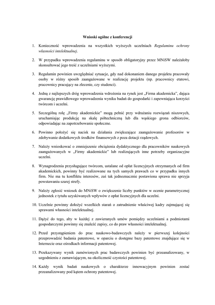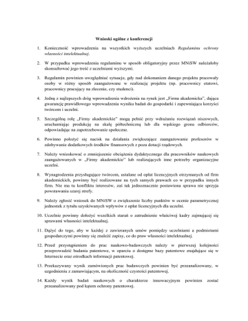Wnioski ogólne z konferencji 1. Konieczność wprowadzenia na wszystkich wyższych uczelniach Regulaminu ochrony własności intelektualnej. 2. W przypadku wprowadzenia regulaminu w sposób obligatoryjny przez MNiSW należałoby skonsultować jego treść z uczelniami wyższymi. 3. Regulamin powinien uwzględniać sytuacje, gdy nad dokonaniem danego projektu pracowały osoby w różny sposób zaangażowane w realizację projektu (np. pracownicy etatowi, pracownicy pracujący na zlecenie, czy studenci). 4. Jedną z najlepszych dróg wprowadzenia wdrożenia na rynek jest „Firma akademicka”, dająca gwarancję prawidłowego wprowadzenia wyniku badań do gospodarki i zapewniająca korzyści twórcom i uczelni. 5. Szczególną rolę „Firmy akademickie” mogą pełnić przy wdrażaniu rozwiązań niszowych, uruchamiając produkcję na skalę półtechniczną lub dla wąskiego grona odbiorców, odpowiadając na zapotrzebowanie społeczne. 6. Powinno położyć się nacisk na działania zwiększające zaangażowanie profesorów w zdobywanie dodatkowych środków finansowych z poza dotacji rządowych. 7. Należy wnioskować o zmniejszenie obciążenia dydaktycznego dla pracowników naukowych zaangażowanych w „Firmy akademickie” lub realizujących inne potrzeby organizacyjne uczelni. 8. Wynagrodzenia przysługujące twórcom, ustalane od opłat licencyjnych otrzymanych od firm akademickich, powinny być realizowane na tych samych prawach co w przypadku innych firm. Nie ma tu konfliktu interesów, zaś tak jednoznacznie postawiona sprawa nie sprzyja powstawaniu szarej strefy. 9. Należy zgłosić wniosek do MNiSW o zwiększenie liczby punktów w ocenie parametrycznej jednostek z tytułu uzyskiwanych wpływów z opłat licencyjnych dla uczelni. 10. Uczelnie powinny dołożyć wszelkich starań o zatrudnienie właściwej kadry zajmującej się sprawami własności intelektualnej. 11. Dążyć do tego, aby w każdej z zawieranych umów pomiędzy uczelniami a podmiotami gospodarczymi powinny się znaleźć zapisy, co do praw własności intelektualnej. 12. Przed przystąpieniem do prac naukowo-badawczych należy w pierwszej kolejności przeprowadzić badania patentowe, w oparciu o dostępne bazy patentowe znajdujące się w Internecie oraz ośrodkach informacji patentowej. 13. Przekazywany wynik zamówionych prac badawczych powinien być przeanalizowany, w uzgodnieniu z zamawiającym, na okoliczność czystości patentowej. 14. Każdy wynik badań naukowych o charakterze przeanalizowany pod kątem ochrony patentowej. innowacyjnym powinien zostać 15. Przed przekazaniem wyników prac naukowych do publikacji należy przeanalizować zdolność patentową przedstawianych w tej publikacji rozwiązań. 16. Uczelnie powinny starać się o zwiększenie zaangażowania nauczycieli akademickich w opiniowaniu projektów międzynarodowych. 17. Należy wprowadzać na uczelniach wyższych obligatoryjne zajęcia z zagadnień ochrony własności intelektualnej z elementami innowacyjności oraz przedsiębiorczości dostosowane do specyfiki poszczególnych wydziałów. 18. Szkoły wyższe powinny nawiązywać współpracę z Parkami Naukowo-Technologicznymi w zakresie promowania przedsiębiorczości wśród studentów i absolwentów. 19. Należy w większym stopniu promować informację patentową dla całego środowiska naukowego w oparciu o działalność Regionalnych Centrów Informacji Patentowej, funkcjonujących w sieci Europejskich Ośrodków Informacji Patentowej PATLIB. 20. Ważne jest również zapewnienie polskiemu środowisku naukowemu bezpłatnego dostępu online do czasopism naukowych i baz danych z obszaru nauk przyrodniczych i technicznych.