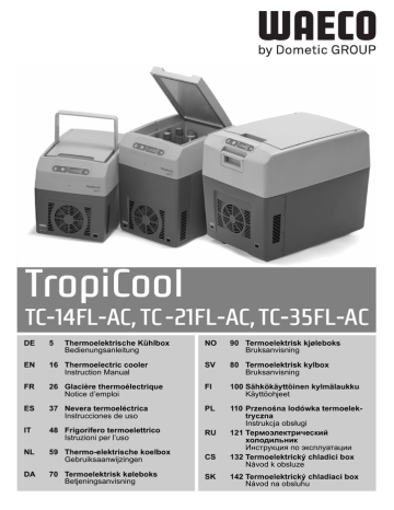 TropiCool TC-14FL-AC, TC -21FL-AC, TC-35FL-AC DE 5 EN Thermoelektrische Kühlbox Bedienungsanleitung NO 90 Termoelektrisk kjøleboks Bruksanvisning 16 Thermoelectric cooler Instruction Manual SV 80 Termoelektrisk kylbox Bruksanvisning FR 26 Glacière thermoélectrique Notice d’emploi FI 100 Sähkökäyttöinen kylmälaukku Käyttöohjeet ES 37 Nevera termoeléctrica Instrucciones de uso PL IT 48 Frigorifero termoelettrico Istruzioni per l’uso RU NL 59 Thermo-elektrische koelbox Gebruiksaanwijzingen CS 110 Przenośna lodówka termoelektryczna Instrukcja obsługi 121 Термоэлектрический холодильник Инструкция по эксплуатации 132 Termoelektrický chladicí box Návod k obsluze DA 70 Termoelektrisk køleboks Betjeningsanvisning SK 142 Termoelektrický chladiaci box Návod na obsluhu TC-Serie 1 TC-14FL-AC 303 323 1,5/2 L 260 328 208 250 450 201 TC-21FL-AC 303 319 352 420 198 TC-35FL-AC 265 2 340 1,5/2 L 550 350 376 1,5/2 L 288 208 460 450 TC-Serie 2 A B C D E F 3 12/24 V DC 4 3 TC-Serie 5 4 Erklärung der Symbole TC-Serie Bitte lesen Sie diese Anleitung vor der Inbetriebnahme sorgfältig durch und bewahren Sie sie auf. Geben Sie sie im Falle einer Weitergabe des Gerätes an den Nutzer weiter. Der Hersteller haftet nicht für Schäden, die durch nicht bestimmungsgemäßen Gebrauch oder falsche Bedienung verursacht werden. Inhaltsverzeichnis 1 Erklärung der Symbole . . . . . . . . . . . . . . . . . . . . . . . . . . . . . . . . . . . 5 2 Sicherheitshinweise . . . . . . . . . . . . . . . . . . . . . . . . . . . . . . . . . . . . . . 6 3 Lieferumfang . . . . . . . . . . . . . . . . . . . . . . . . . . . . . . . . . . . . . . . . . . . 8 4 Bestimmungsgemäßer Gebrauch . . . . . . . . . . . . . . . . . . . . . . . . . . . 9 5 Technische Beschreibung . . . . . . . . . . . . . . . . . . . . . . . . . . . . . . . . . 9 6 Bedienung . . . . . . . . . . . . . . . . . . . . . . . . . . . . . . . . . . . . . . . . . . . . 10 7 Reinigung und Pflege. . . . . . . . . . . . . . . . . . . . . . . . . . . . . . . . . . . . 13 8 Entsorgung. . . . . . . . . . . . . . . . . . . . . . . . . . . . . . . . . . . . . . . . . . . . 13 9 Störungsbeseitigung . . . . . . . . . . . . . . . . . . . . . . . . . . . . . . . . . . . . 14 10 Technische Daten . . . . . . . . . . . . . . . . . . . . . . . . . . . . . . . . . . . . . . 15 1 Erklärung der Symbole D ! ! GEFAHR! Sicherheitshinweis: Nichtbeachtung führt zu Tod oder schwerer Verletzung. DE WARNUNG! Sicherheitshinweis: Nichtbeachtung kann zu Tod oder schwerer Verletzung führen. VORSICHT! Sicherheitshinweis: Nichtbeachtung kann zu Verletzungen führen. 5 Sicherheitshinweise A I TC-Serie ACHTUNG! Nichtbeachtung kann zu Materialschäden führen und die Funktion des Produktes beeinträchtigen. HINWEIS Ergänzende Informationen zur Bedienung des Produktes. ➤ Handlung: Dieses Symbol zeigt Ihnen, dass Sie etwas tun müssen. Die erforderlichen Handlungen werden Schritt für Schritt beschrieben. ✓ Dieses Symbol beschreibt das Ergebnis einer Handlung. Abb. 1 5, Seite 3: Diese Angabe weist Sie auf ein Element in einer Abbildung hin, in diesem Beispiel auf „Position 5 in Abbildung 1 auf Seite 3“. 2 Sicherheitshinweise 2.1 Allgemeine Sicherheit D ! GEFAHR! Bei Booten: Sorgen Sie bei Netzbetrieb unbedingt dafür, dass Ihre Stromversorgung über einen FI-Schalter abgesichert ist. WARNUNG! Wenn das Gerät sichtbare Beschädigungen aufweist, dürfen Sie es nicht in Betrieb nehmen. Reparaturen an diesem Gerät dürfen nur von Fachkräften durchgeführt werden. Durch unsachgemäße Reparaturen können erhebliche Gefahren entstehen. Personen (einschließlich Kinder), die aufgrund ihrer physischen, sensorischen oder geistigen Fähigkeiten oder ihrer Unerfahrenheit oder Unkenntnis nicht in der Lage sind, das Gerät sicher zu benutzen, sollten dieses Gerät nicht ohne Aufsicht oder Anweisung durch eine verantwortliche Person nutzen. Elektrogeräte sind kein Kinderspielzeug! Verwahren und benutzen Sie das Gerät außerhalb der Reichweite von Kindern. 6 DE Sicherheitshinweise TC-Serie Kinder sollten beaufsichtigt werden, um sicherzustellen, dass sie nicht mit dem Gerät spielen. Wenn das Anschlusskabel dieses Gerätes beschädigt wird, muss es durch den Hersteller, seinen Kundendienst oder eine ähnlich qualifizierte Person ersetzt werden, um Gefährdungen zu vermeiden. Lagern Sie keine explosionsfähigen Substanzen wie z. B. Sprühdosen mit Treibgas im Gerät. ! VORSICHT! Trennen Sie das Gerät vom Netz – vor jeder Reinigung und Pflege – nach jedem Gebrauch Lebensmittel dürfen nur in Originalverpackungen oder geeigneten Behältern eingelagert werden. A ACHTUNG! Schließen Sie das Gerät nur wie folgt an: – mit dem DC-Anschlusskabel an die DC-Bordsteckdose (z. B. Zigarettenanzünder) im Fahrzeug – oder mit dem 230-V-Anschlusskabel an das 230-V-Wechselstromnetz Vergleichen Sie die Spannungsangabe auf dem Typenschild mit der vorhandenen Energieversorgung. Das Kühlgerät ist nicht geeignet für den Transport ätzender oder lösungsmittelhaltiger Stoffe. Ziehen Sie den Stecker nie am Anschlusskabel aus der Steckdose. Wenn das Kühlgerät an der DC-Steckdose angeschlossen ist: Klemmen Sie Ihr Kühlgerät und andere Verbraucher von der Batterie ab, bevor Sie ein Schnellladegerät anschließen. Wenn das Kühlgerät an der DC-Steckdose angeschlossen ist: Trennen Sie die Verbindung oder schalten Sie das Kühlgerät aus, wenn Sie den Motor ausschalten. Sonst kann die Batterie entladen werden. DE 7 Lieferumfang 2.2 Sicherheit beim Betrieb des Gerätes D ! A GEFAHR! TC-Serie Fassen Sie nie mit bloßen Händen an blanke Leitungen. Dies gilt vor allem beim Betrieb am Wechselstromnetz. VORSICHT! Achten Sie vor der Inbetriebnahme darauf, dass Zuleitung und Stecker trocken sind. ACHTUNG! Benutzen Sie keine elektrischen Geräte innerhalb des Kühlgerätes, außer wenn diese Geräte vom Hersteller dafür empfohlen werden. Stellen Sie d