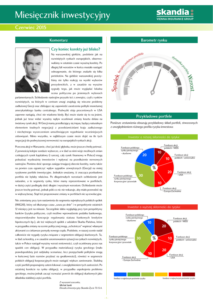 Miesięcznik inwestycyjny Czerwiec 2015 Komentarz Barometr rynku Czy koniec korekty już blisko? dyn am ik st Wzro Spadek fela o rt bez pie cz eń tfela por o stw ap Na warszawskiej giełdzie, podobnie jak na rozwiniętych rynkach europejskich, obserwowaliśmy w ostatnim czasie wyraźną korektę. Po długiej fali wzrostów w końcu musiało nastąpić odreagowanie, do którego znalazło się kilka pretekstów. Na giełdzie warszawskiej przeżyliśmy nie tylko reakcję na wyniki wyborów prezydenckich, a w zasadzie na wyraźne sygnały tego, jak może wyglądać lokalna scena polityczna po jesiennych wyborach parlamentarnych. Schłodzenie nastrojów przyszło też z zewnątrz, czyli z rynków rozwiniętych, na których w centrum uwagi znajdują się wieczne problemy zadłużonej Grecji oraz zbliżające się zapowiedzi zaostrzenia polityki monetarnej amerykańskiego banku centralnego. Podwyżki stóp procentowych w USA zapewne nastąpią, choć nie wiadomo kiedy. Być może stanie się to na jesieni, jednak już teraz widać wyraźny wpływ oczekiwań zmiany kosztu dolara na światowy rynek akcji. W Grecji mamy przedłużający się impas, będący naturalnym elementem trudnych negocjacji z przedstawicielami kraju zadłużonego i niechętnego wyrzeczeniom umożliwiającym wypełnianie wcześniejszych zobowiązań. Mimo wszystko, w najbliższym czasie może dojść na tle tych negocjacji do podwyższonej nerwowości na europejskich rynkach akcji. 1 Przykładowe portfele Poniższe zestawienia obrazują przykładowy skład portfeli, stworzonych z uwzględnieniem różnego profilu ryzyka inwestora: Inwestor o ni˝szej skłonnoÊci do ryzyka: Przecena akcji w Warszawie, choć już dość głęboka, może jeszcze chwilę potrwać. Z pewnością kolejne sondaże wyborcze, a w ślad za nimi wizje możliwych zmian czekających rynek kapitałowy (i szerzej, cały rynek finansowy w Polsce) mogą pobudzać wyobraźnię inwestorów i wpływać na przedłużenie nerwowych nastrojów. Pomimo dość sporego zasięgu trwającej obecnie korekty, warto także na pewien czas ograniczyć wpływ sygnałów zewnętrznych (Grecja) na mniej ryzykowne portfele inwestycyjne. Jednakże uważamy, iż znacząca przebudowa portfela nie byłaby właściwa. Po długotrwałych wzrostach ochłodzenie jest naturalne, a te segmenty rynku, które mamy reprezentowane w portfelach, w dużej części podlegały dość długim i wyraźnym wzrostom. Ochłodzenie może jeszcze trochę potrwać, jednak póki co nic nie wskazuje, aby miało przerodzić się w większą bessę. Stąd też proponowane zmiany w portfelach nie są rewolucyjne. Fundusze polskiego rynku pieniężnego - skarbowe Fundusze akcji polskich - MiŚS 10 20 % Fundusze polskiego rynku pieniężnego korporacyjne i pozostałe Fundusze akcji polskich - uniwersalne 10 20 30 Fundusze akcji - USA 10 Fundusze akcji - Europa Zachodnia Nie zmieniamy przy tym nastawienia do segmentu największych polskich spółek (WIG20), który od dłuższego czasu „szura po dnie” i w perspektywie ostatnich 12 miesięcy jest na minusie. Szczególnie słabo wyglądają przy tym perspektywy banków (ryzyko polityczne, czyli możliwe wprowadzenie podatku bankowego, nieprzewidywalne koncepcje regulowania statusu frankowych kredytów hipotecznych itp.), ale też większych spółek z udziałem Skarbu Państwa, które w przypadku zmiany na scenie politycznej mogą „ochotniczo” wspierać własnymi aktywami co ciekawsze pomysły nowego rządu. Podobnie, w naszej ocenie nadal całkowicie nie wygasły ryzyka związane z segmentem obligacji skarbowych. Tu, w ślad za korektą, a w zasadzie unormowaniem sytuacji na rynkach rozwiniętych, także w Polsce nastąpił wyraźny wzrost rentowności, czyli oczekiwany przez nas spadek cen obligacji. W przypadku materializacji ryzyka greckiego (mało prawdopodobny jest radykalny scenariusz, lecz przepychanki polityków mogą w końcowej fazie rozmów przybrać na gwałtowności), również w segmencie polskich obligacji korporacyjnych może nastąpić większe zawirowanie. Stabilną część portfeli proponujemy zatem lokować z uwzględnieniem tych zastrzeżeń. Po ostatniej korekcie na rynku obligacji, w przypadku uspokojenia problemu greckiego, można jednak zacząć rozważać powrót do obligacji skarbowych jako składnika stabilnej części portfela. Inwestor o wy˝szej skłonnoÊci do ryzyka: Fundusze polskiego rynku pieniężnego - skarbowe Fundusze polskiego rynku pieniężnego korporacyjne i pozostałe 10 fundusz o najniższym poziomie ryzyka Z wyrazami szacunku, Michał Janik Doradca Inwestycyjny Skandia Życie TU S.A. -1- 20 % 30 Fundusze akcji - Europa Zachodnia Fundusze akcji polskich - MiŚS 10 10 Fundusze akcji polskich - uniwersalne 20 Fundusze akcji - USA fundusz o najwyższym poziomie ryzyka Miesięcznik inwestycyjny Czerwiec 2015 Fundusze dost´pne w aktualnej ofercie Skandii w czerwcu* PIO6 SKAR4 UNK4 UNK5 PLN PLN PLN PLN -0,02% 0,00% -0,01% 0,20% -0,02% 0,00% -0,01% 0,20% 0,17% 0,18% 0,39% 0,65% 1,91% 1,77% 3,38% 3,16% Fundusze obligacji polskich skarbowe Aviva Investors FIO Subfundusz Aviva Investors Obligacji CU2 PLN DWS2 PLN Investor Obligacji Fundusz Inwestycyjny Otwarty ING2 PLN ING Parasol FIO Subfundusz Obligacji NOVO5 PLN Novo FIO Subfundusz Novo Papierów Dłu˝nych OPT2 PLN Optimum Fundusz Inwestycyjny Otwarty subfundusz Obligacji Skarbiec FIO Subfundusz Instrumentów Dłu˝nych Skarbiec-Obligacja SKAR2 PLN -0,61% -0,67% -0,69% 0,24% -0,29% -0,93% -0,61% -0,67% -0,69% 0,24% -0,29% -0,93% -1,25% -1,22% -1,98% -1,43% -1,15% -1,50% 3,20% 3,73% 3,34% 4,38% 0,98% 4,03% Fundusze obligacji polskich - korporacyjne i pozostałe Arka BZ WBK FIO Subfundusz Arka BZ WBK Obligacji Skarbowych ARKA2 PLN SEB2 PLN Novo FIO Subfundusz Novo Obligacji Przedsi´biorstw UNK2 PLN UniFundusze FIO Subfundusz UniKorona Obligacje -1,10% 0,50% -0,41% -1,10% 0,50% -0,41% -2,12% -0,48% -1,29% 3,18% 2,30% 3,12% Fundusze obligacji europejskich Templeton