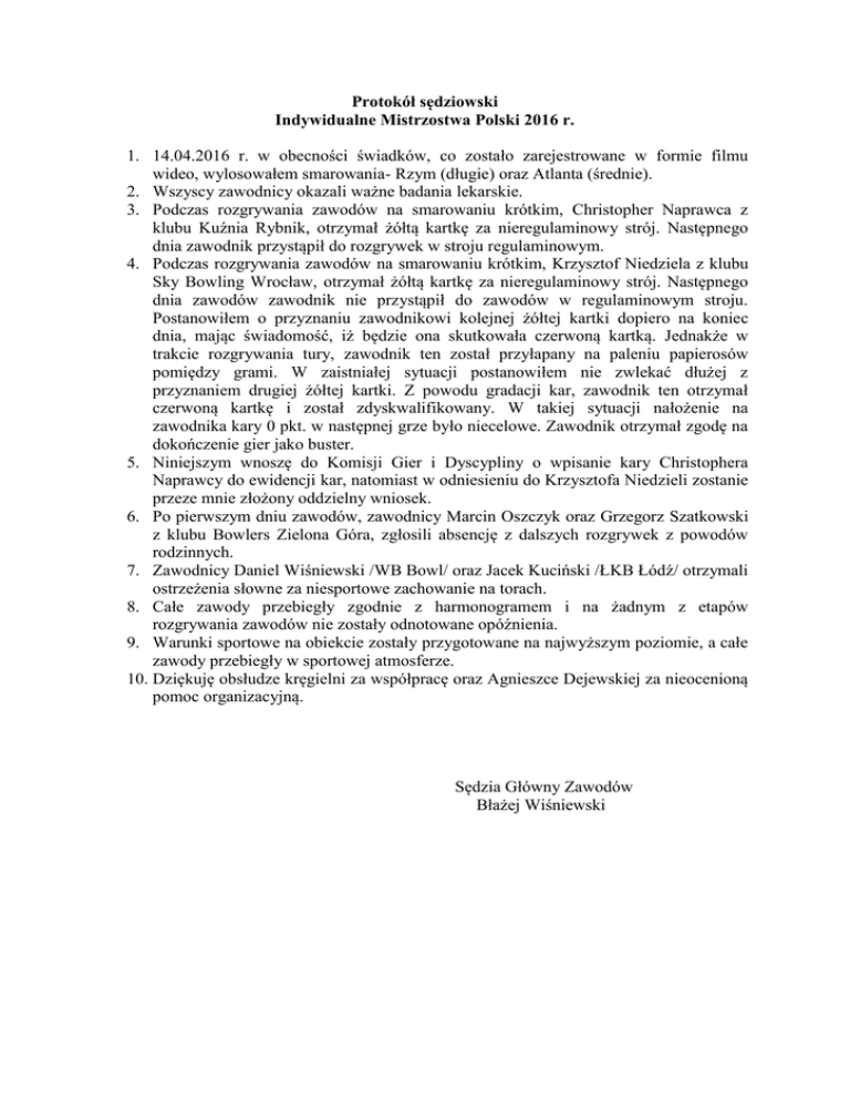 Protokół sędziowski Indywidualne Mistrzostwa Polski 2016 r. 1. 14.04.2016 r. w obecności świadków, co zostało zarejestrowane w formie filmu wideo, wylosowałem smarowania- Rzym (długie) oraz Atlanta (średnie). 2. Wszyscy zawodnicy okazali ważne badania lekarskie. 3. Podczas rozgrywania zawodów na smarowaniu krótkim, Christopher Naprawca z klubu Kuźnia Rybnik, otrzymał żółtą kartkę za nieregulaminowy strój. Następnego dnia zawodnik przystąpił do rozgrywek w stroju regulaminowym. 4. Podczas rozgrywania zawodów na smarowaniu krótkim, Krzysztof Niedziela z klubu Sky Bowling Wrocław, otrzymał żółtą kartkę za nieregulaminowy strój. Następnego dnia zawodów zawodnik nie przystąpił do zawodów w regulaminowym stroju. Postanowiłem o przyznaniu zawodnikowi kolejnej żółtej kartki dopiero na koniec dnia, mając świadomość, iż będzie ona skutkowała czerwoną kartką. Jednakże w trakcie rozgrywania tury, zawodnik ten został przyłapany na paleniu papierosów pomiędzy grami. W zaistniałej sytuacji postanowiłem nie zwlekać dłużej z przyznaniem drugiej żółtej kartki. Z powodu gradacji kar, zawodnik ten otrzymał czerwoną kartkę i został zdyskwalifikowany. W takiej sytuacji nałożenie na zawodnika kary 0 pkt. w następnej grze było niecelowe. Zawodnik otrzymał zgodę na dokończenie gier jako buster. 5. Niniejszym wnoszę do Komisji Gier i Dyscypliny o wpisanie kary Christophera Naprawcy do ewidencji kar, natomiast w odniesieniu do Krzysztofa Niedzieli zostanie przeze mnie złożony oddzielny wniosek. 6. Po pierwszym dniu zawodów, zawodnicy Marcin Oszczyk oraz Grzegorz Szatkowski z klubu Bowlers Zielona Góra, zgłosili absencję z dalszych rozgrywek z powodów rodzinnych. 7. Zawodnicy Daniel Wiśniewski /WB Bowl/ oraz Jacek Kuciński /ŁKB Łódź/ otrzymali ostrzeżenia słowne za niesportowe zachowanie na torach. 8. Całe zawody przebiegły zgodnie z harmonogramem i na żadnym z etapów rozgrywania zawodów nie zostały odnotowane opóźnienia. 9. Warunki sportowe na obiekcie zostały przygotowane na najwyższym poziomie, a całe zawody przebiegły w sportowej atmosferze. 10. Dziękuję obsłudze kręgielni za współpracę oraz Agnieszce Dejewskiej za nieocenioną pomoc organizacyjną. Sędzia Główny Zawodów Błażej Wiśniewski