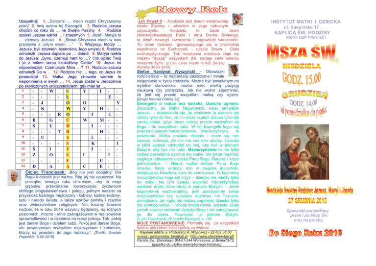 Uzupełnij: 1. „Sercami … niech rządzi Chrystusowy pokój” 2. Imię autora tej Ewangelii 3. Rodzice Jezusa chodzili co roku do … na Święto Paschy 4. Rodzice szukali Jezusa wśród … i znajomych 5. Józef i Maryja to … ziemscy Jezusa 6. „Słowo Chrystusa niech w was przebywa z całym swym …” 7. Wszyscy, którzy … Jezusa, byli zdumieni bystrością Jego umysłu 8. Rodzice odnaleźli Jezusa dopiero po … dniach 9. Maryja rzekła do Jezusa: „Synu, czemuś nam to …? Oto ojciec Twój i ja z bólem serca szukaliśmy Ciebie” 10. Jezus im odpowiedział: Czemuście Mnie …? 11. Rodzice Jezusa odnaleźli Go w … 12. Rodzice nie … tego, co Jezus im powiedział 13. Matka Jego chowała wiernie te wspomnienia w swym … 14. Jezus został w Jerozolimie po skończonych uroczystościach, gdy miał lat … 1 x x W 2 x x x 3 x 4 x J K 5 x x 6 7 B S 8 x x 9 x U 10 x x 12 Ś Z 13 x 11 14 x x R G U x x T x I O x x x S Ł O W O C H R Y S T U S A Y I O Y x x Z x Y H x x E x M x x x x x H x x x x x x x x I x x x I W I Ł K I I I U E x D A C Ojciec Franciszek: „Bóg nie jest obojętny! Dla x Boga ludzkość jest ważna, Bóg jej nie opuszcza! Na początku nowego roku chciałbym, aby to moje głębokie przekonanie towarzyszyło życzeniom obfitego błogosławieństwa i pokoju, pełnym nadziei na przyszłość każdego mężczyzny i kobiety, każdej rodziny, ludu i narodu świata, a także szefów państw i rządów oraz zwierzchników religijnych. Nie tracimy bowiem nadziei, że w roku 2016 wszyscy będziemy, na różnych poziomach, mocno i ufnie zaangażowani w realizowanie sprawiedliwości i w działania na rzecz pokoju. Tak, pokój jest darem Boga i dziełem ludzi. Pokój jest darem Boga, ale powierzonym wszystkim mężczyznom i kobietom, którzy są powołani do jego realizacji”. [Źródło: Oredzie Papieskie 8 XII 2015]. Jan Paweł II - „Niedziela jest dniem świętowania dzieła Stwórcy i udziałem w Jego radosnym odpoczynku. Niedziela to także dzień zmartwychwstałego Pana i daru Ducha Świętego, to dzień nowego stworzenia i zapowiedź wieczności. To dzień Kościoła, gromadzącego się w braterskiej wspólnocie na Eucharystii - uczcie Słowa i Ciała eucharystycznego. Tak rozumiana niedziela staje się niejako "duszą" wszystkich dni, nadaje sens całemu naszemu życiu (z Listu Episk. Polski na Ndz. Świętej INSTYTUT MATKI I DZIECKA . ul. Kasprzaka 17 KAPLICA ŚW. RODZINY (OBOK IZBY PRZYJĘĆ) Rodziny 30 XII 2012) Stefan Kardynał Wyszyński – Obowiązki rodzicielskie – to najbardziej zaszczytne i trwałe osiągnięcie w życiu rodziców. Można być powołanym na wybitne stanowisko, można mieć wielką pozycję naukową czy polityczną, ale nie wolno zapominać, że jest się przede wszystkim matką czy ojcem. [Druga Kromka Chleba 28]. Ewangelia o matce bez dziecka. Dziecko zginęło. Zauważmy, ze Matka Najświętsza, kiedy odnalazła Jezusa…- dowiedziała się, że właściwie to dziecko nie należy tylko do Niej, ze nie może szukać Jezusa tylko dla samej siebie, gdyż Jezus należy przede wszystkim do Boga i do wszystkich ludzi. W tej Ewangelii kryje się prawda o pełnym macierzyństwie. Macierzyństwo to powołanie. Matka posiada dziecko i może się nim cieszyć, radować, ale nie ma nad nim władzy. Dziecko w jakiś sposób odchodzi od niej, aby być w planach Bożych, aby być dla ludzi. Macierzyństwo to nie tylko radość posiadania dziecka dla siebie, ale także mądrość ciągłego oddawania dziecka Panu Bogu. Radość i krzyż jednocześnie. – Nieraz matka oddaje Panu Bogu dziecko, kiedy wchodzi ono w związek małżeński, wstępuje do klasztoru, idzie do seminarium. W tajemnicy macierzyństwa kryje się krzyż – dziecko nie należy tylko do matki. Na tym polega wielkość macierzyństwa, wielkość matki, która służy w planach Bożych. – Jeżeli kogokolwiek wychowujemy, jeśli przeżywamy swoje macierzyństwo czy ojcostwo duchowe lub fizyczne, pamiętajmy, że nigdy nie można zagarniać dziecka tylko dla samego siebie. – Wtedy matka rośnie, wzrasta, kiedy potrafi zawsze oddawać dziecko Bogu i nie zatrzymywać go dla siebie. Powierzać je planom Bożym . [x Jan Twardowski, W świetle Ewangelii, s. 196 MOJE POSTANOWIENIE: Pomodlę się za wszystkich ludzi o potrzebne łaski i pokój na świecie Kapelan IMiDz- x. Proboszcz A. Wójtowicz - 22 632 38 00 e-mail : [email protected] http://www.stanislaw-bm.pl/ Parafia Św. Stanisława BM-01-244 Warszawa; ul.Bema73/75 [gazetka do użytku wewnętrznego Instytutu] Spowiedź pół godziny przed i po Mszy Św. oraz na prośbę. Sercami waszymi niech rządzi Chrystusowy pokój, Słowo Chrystusa niech w was przebywa z całym swym bogactwem. (Kol 3,15-16) Łk 2,41-52 Rodzice Jego chodzili co roku do Jerozolimy na Święto Paschy. Gdy miał lat dwanaście, udali się tam zwyczajem świątecznym. Kiedy wracali po skończonych uroczystościach, został Jezus w Jerozolimie, a tego nie zauważyli Jego Rodzice. Przypuszczając, że jest w towarzystwie pątników, uszli dzień drogi i szukali Go wśród krewnych i znajomych. Gdy Go nie znaleźli, wrócili do Jerozolimy szukając Go. Dopiero po trzech dniach odnaleźli Go w świątyni, gdzie siedział między nauczycielami, przysłuchiwał się im i zadawał pytania. Wszyscy zaś, którzy Go słuchali, byli zdumieni bystrością Jego umysłu i odpowiedziami. Na ten widok zdziwili się bardzo, a Jego Matka rzekła do Niego: Synu, czemuś nam to uczynił? Oto ojciec Twój i ja z bólem serca szukaliśmy Ciebie. Lecz On im odpowiedział: Czemuście Mnie szukali? Czy nie wiedzieliście, że powinienem być w tym, co należy do mego Ojca? Oni jednak nie zrozumieli tego, co im powiedział. Potem poszedł z nimi i wrócił do Nazaretu; i był im poddany. A Matka Jego chowała wiernie wszystkie te wspomnienia w swym sercu. Jezus zaś czynił postępy w mądrości, w latach i w łasce u Boga i u ludzi. Kościół przypomina nam dzisiaj Świętą Rodzin