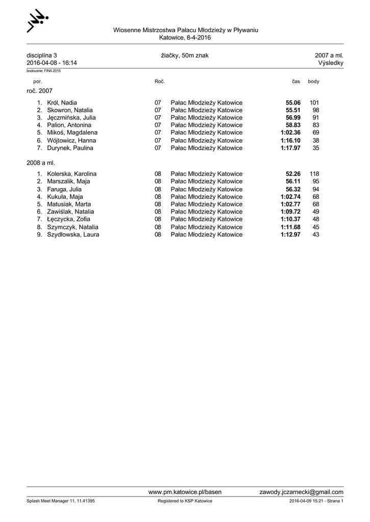 Wiosenne Mistrzostwa Pałacu Młodzieży w Pływaniu Katowice, 8-4-2016 disciplína 3 2016-04-08 - 16:14 žiačky, 50m znak 2007 a ml. Výsledky bodovanie: FINA 2015 Roč. por. čas body roč. 2007 1. 2. 3. 4. 5. 6. 7. Król, Nadia Skowron, Natalia Jęczmińska, Julia Palion, Antonina Mikoś, Magdalena Wójtowicz, Hanna Durynek, Paulina 07 07 07 07 07 07 07 Pałac Młodzieży Katowice Pałac Młodzieży Katowice Pałac Młodzieży Katowice Pałac Młodzieży Katowice Pałac Młodzieży Katowice Pałac Młodzieży Katowice Pałac Młodzieży Katowice 55.06 55.51 56.99 58.83 1:02.36 1:16.10 1:17.97 101 98 91 83 69 38 35 08 08 08 08 08 08 08 08 08 Pałac Młodzieży Katowice Pałac Młodzieży Katowice Pałac Młodzieży Katowice Pałac Młodzieży Katowice Pałac Młodzieży Katowice Pałac Młodzieży Katowice Pałac Młodzieży Katowice Pałac Młodzieży Katowice Pałac Młodzieży Katowice 52.26 56.11 56.32 1:02.74 1:02.77 1:09.72 1:10.37 1:11.68 1:12.97 118 95 94 68 68 49 48 45 43 2008 a ml. 1. 2. 3. 4. 5. 6. 7. 8. 9. Kolerska, Karolina Marszalik, Maja Faruga, Julia Kukuła, Maja Matusiak, Marta Zawiślak, Natalia Łęczycka, Zofia Szymczyk, Natalia Szydłowska, Laura www.pm.katowice.pl/basen Splash Meet Manager 11, 11.41395 Registered to KSP Katowice [email protected] 2016-04-09 15:21 - Strana 1