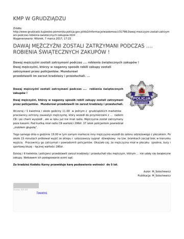KMP W GRUDZIĄDZU Źródło: http://www.grudziadz.kujawsko-pomorska.policja.gov.pl/kb2/informacje/wiadomosci/31798,Dawaj-mezczyzni-zostali-zatrzym ani-podczas-robienia-swiatecznych-zakupow.html Wygenerowano: Wtorek, 7 marca 2017, 17:15 DAWAJ MĘŻCZYŹNI ZOSTALI ZATRZYMANI PODCZAS …. ROBIENIA ŚWIĄTECZNYCH ZAKUPÓW ! Dawaj mężczyźni zostali zatrzymani podczas …. robienia świątecznych zakupów ! Dwaj mężczyźni, którzy w naganny sposób robili zakupy zostali zatrzymani przez policjantów. Mundurowi przedstawili im zarzut kradzieży i przesłuchali. ... Dawaj mężczyźni zostali zatrzymani podczas …. robienia świątecznych zakupów ! Dwaj mężczyźni, którzy w naganny sposób robili zakupy zostali zatrzymani przez policjantów. Mundurowi przedstawili im zarzut kradzieży i przesłuchali. Wczoraj / 5 kwietnia / około godziny 11.00 w jednym z grudziądzkich marketów pracownicy ochrony zauważyli mężczyznę, który wszedł do przymierzalni z … radiem CB i po chwili wyszedł , ale w ręku już nie miał radia. Mężczyzna został zatrzymany poza kasami. Pod kurtką miał radio CB wartości 299zł. 37 latek policjantom powiedział „zrobiłem głupotę”. Tego samego dnia o godzinie 19.00 w tym samym markecie inny mężczyzna wszedł do salonu odzieżowego z plecakiem. Po około 15 minutach próbował wyjść ze sklepu i usłyszawszy sygnał dźwiękowy na tzw. bramkach zaczął biec w kierunku wyjścia. Pracownicy go zatrzymali i powiadomili policjantów. Okazało się, że mężczyzna miał w plecaku spodnie, buty i sportową bluzę – łącznej wartości 280zł. Dzisiaj / 6 kwietnia / policjanci przedstawili zarzut kradzieży i przesłuchali obu mężczyzn, którym … nie udały się świąteczne zakupy. Niebawem ich postępowanie oceni sąd. Za kradzież Kodeks Karny przewiduje karę pozbawienia wolności do 5 lat. Autor: M_Solochewicz Publikacja: M_Solochewicz Ocena: 0/5 (0) Tweetnij