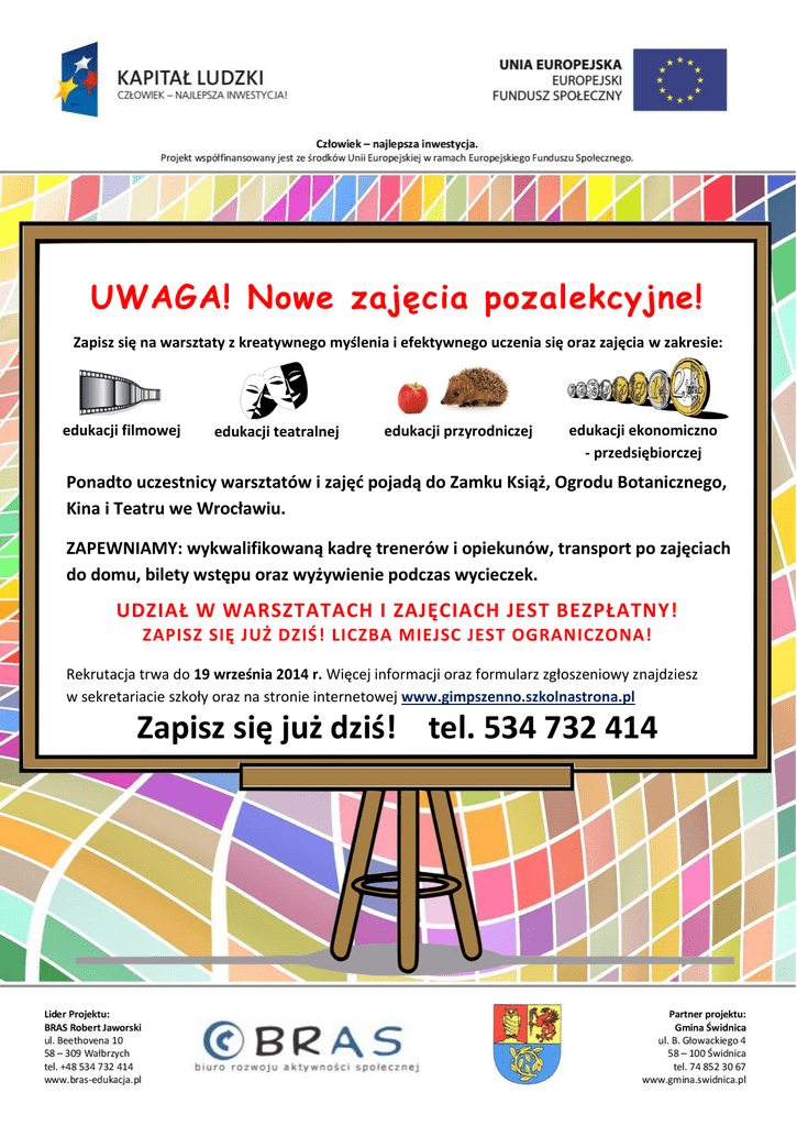 UWAGA! Nowe zajęcia pozalekcyjne! Zapisz się na warsztaty z kreatywnego myślenia i efektywnego uczenia się oraz zajęcia w zakresie: edukacji filmowej edukacji teatralnej edukacji przyrodniczej edukacji ekonomiczno - przedsiębiorczej Ponadto uczestnicy warsztatów i zajęć pojadą do Zamku Książ, Ogrodu Botanicznego, Kina i Teatru we Wrocławiu. ZAPEWNIAMY: wykwalifikowaną kadrę trenerów i opiekunów, transport po zajęciach do domu, bilety wstępu oraz wyżywienie podczas wycieczek. UDZIAŁ W WARSZTATACH I ZAJĘCIACH JEST BEZPŁATNY! ZAPISZ SIĘ JUŻ DZIŚ! LICZBA MIEJSC JEST OGRANICZONA! Rekrutacja trwa do 19 września 2014 r. Więcej informacji oraz formularz zgłoszeniowy znajdziesz w sekretariacie szkoły oraz na stronie internetowej www.gimpszenno.szkolnastrona.pl Zapisz się już dziś! tel. 534 732 414
