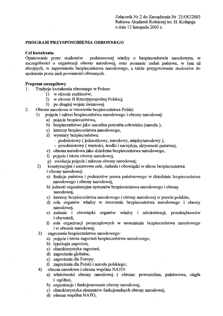 Załącznik Nr 2 do Zarządzenia Nr 21/OC/2003 Rektora Akademii Rolniczej im. H. Kołłątaja z dnia 12 listopada 2003 r. PROGRAM PRZYSPOSOBIENIA OBRONNEGO Cel kształcenia Opanowanie przez studentów podstawowej wiedzy o bezpieczeństwie narodowym, w szczególności o organizacji obrony narodowej, oraz poznanie zadań państwa, w tym sił zbrojnych, w zapewnieniu bezpieczeństwa narodowego, a także przygotowanie studentów do spełnienia przez nich powinności obronnych. Program szczegółowy 1. Tradycje kształcenia obronnego w Polsce: 1) w okresie rozbiorów; 2) w okresie I I Rzeczypospolitej Polskiej; 3) po drugiej wojnie światowej. 2. Obrona narodowa w tworzeniu bezpieczeństwa Polski: 1) pojęcie i zakres bezpieczeństwa narodowego i obrony narodowej: a) pojęcie bezpieczeństwa, b) bezpieczeństwo jako naczelna potrzeba człowieka (narodu ), c) interesy bezpieczeństwa narodowego, d) wymiary bezpieczeństwa: - podmiotowy (jednostkowy, narodowy, międzynarodowy ), - przedmiotowy ( wartości, środki i narzędzia, aktywność państwa), e) obrona narodowa jako dziedzina bezpieczeństwa narodowego, f) pojęcia i istota obrony narodowej, g) ewolucja pojęcia i zakresu obrony narodowej; 2) konstytucyjne i ustawowe cele, zadania i obowiązki w sferze bezpieczeństwa i obrony narodowej: a) funkcje państwa i podmiotów prawa państwowego w dziedzinie bezpieczeństwa narodowego i obrony narodowej, b) jedność organizacyjna systemów bezpieczeństwa narodowego i obrony narodowej, c) interesy bezpieczeństwa narodowego i obrony narodowej w prawie polskim, d) rola organów władzy w tworzeniu bezpieczeństwa narodowego i obrony narodowej, e) zadania i obowiązki organów władzy i administracji, przedsiębiorców i obywateli, f) rola organizacji pozarządowych w umacnianiu bezpieczeństwa narodowego i w obronie narodowej; 3) zagrożenia bezpieczeństwa narodowego: a) pojęcie i istota zagrożeń bezpieczeństwa narodowego, b) typologia zagrożeń, c) charakterystyka zagrożeń, d) zagrożenia globalne, e) zagrożenia dla Europy, f) zagrożenia dla Polski i narodu polskiego; 4) obrona narodowa i obrona wspólna NATO: a) właściwości obrony narodowej ( obrona: powszechna, państwowa, ciągła i ogólna), b) organizacja i funkcjonowanie obrony narodowej, c) charakterystyka elementów funkcjonalnych obrony narodowej, d) obrona wspólna NATO, 3. e) zasady działania NATO, f) zakres wspólnych przedsięwzięć obronnych, g) koncepcja strategiczna NATO, h) rola państwa- członka NATO, i) interesy narodowe a sojusznicze; 5) założenia strategii bezpieczeństwa narodowego: a) pojęcie i istota strategii bezpieczeństwa narodowego, b) kształtowanie się strategii bezpieczeństwa Rzeczypospolitej Polskiej, c) cele i zasady bezpieczeństwa Rzeczypospolitej Polskiej, d) przeciwdziałanie zagrożeniom zewnętrznym i wewnętrznym bezpieczeństwa narodowego; 6) stany nadzwyczajne i gotowość obronna państwa: a) pojęcie i istota stanów nadzwyczajnych i gotowości obronnej państwa, b) stan klęski żywiołowej, stan wyjątkowy i stan wojenny - zasady wprowadzania stanów nadzwyczajnych, zasady działania organów władzy publicznej, zakres ograniczeń wolności i praw człowieka i obywatela, c) funkcjonowanie państwa po wprowadzeniu stanów nadzwyczajnych, d) zarządzanie kryzysowe; 7) założenia strategii obronnej: a) pojęcie i istota strategii obrony narodowej, b) cele i zasady strategii obronności Rzeczypospolitej Polskiej, c) system obronności państwa, d) rola organów władzy, sił zbrojnych i układu pozamilitarnego w systemie obronności Rzeczypospolitej Polskiej. Organizacja wojskowa Polski: 1) pojęcie systemu wojskowego oraz jego misje i zadania: a) pojecie wojska, jego miejsce i rola w państwie, b) pojecie i struktura systemu wojskowego państwa, c) zadania systemu wojskowego; 2) Siły Zbrojne Rzeczypospolitej Polskiej w czasie pokoju, kryzysu i wojny: a) podstawowa funkcja sił zbrojnych, b) działalność pokojowa, c) reagowanie w sytuacjach kryzysowych ( operacje inne niż wojna), d) udział Sił Zbrojnych Rzeczypospolitej Polskiej w międzynarodowych operacjach pokojowych, e) system mobilizacyjny sił zbrojnych, f) działania w operacjach sojuszniczych poza terytorium kraju i w obronie kolektywnej Polski, g) obowiązki państwa - gospodarza, h) opór na terenach okupowanych; 3) struktura organizacyjna sił zbrojnych: a) czynniki wpływające na kształt i możliwości sił zbrojnych, b) system dowodzenia, c) rola Sztabu Generalnego, d) Wojska Lądowe, e) Wojska Lotnicze i Obrony Powietrznej (Siły Powietrzne ), f) Marynarka Wojenna, g) wojska operacyjne i terytorialny system wsparcia, h) rola okręgów wojskowych, wojewódzkich sztabów wojskowych, wojskowych komend uzupełnień i garnizonów, i) organizacja i przeznaczenie; 4) struktura organizacyjna wojsk: a) ogólne zasady organizacji wojsk: - związki taktyczne, oddziały i pododdziały, 4. b) przeznaczenie, organizacja i podstawowe uzbrojenie wojsk pancernych, zmechanizowanych, desantowych, Żandarmerii Wojskowej, obrony terytorialnej, artylerii i obrony przeciwlotniczej, wojsk inżynieryjnych, chemicznych, łączności, komunikacji, logistyki, służby zdrowia, c) duszpasterstwo wojskowe; 5) służba wojskowa: a) rodzaje służby wojskowej ( zawodowa, ochotnicza, obowiązek wojskowy obywateli — zasadnicza służba wojskowa i służba w rezerwie ), b) organizacja i funkcjonowanie wojska ( hierarchia, dyscyplina, porządek wojskowy, garnizon i jednostka wojskowa ); 6) podstawowe pojęcia i zasady walki zbrojnej: a) pojęcie sztuki wojennej i jej części składowych: strategii, sztuki operacyjnej i taktyki, b) środki, czynniki, sposoby, rodzaje i formy walki zbrojnej, c) zasady sztuki wojennej; 7) współpraca cywilno - wojskowa: a) istota, potrzeba, formy i zakres współpracy, b) wojskowe wsparcie władz cywilnych i społeczeństwa - zasady i procedury, c) organizacja współdziałania cywilno - wojskowego. Cywilna 