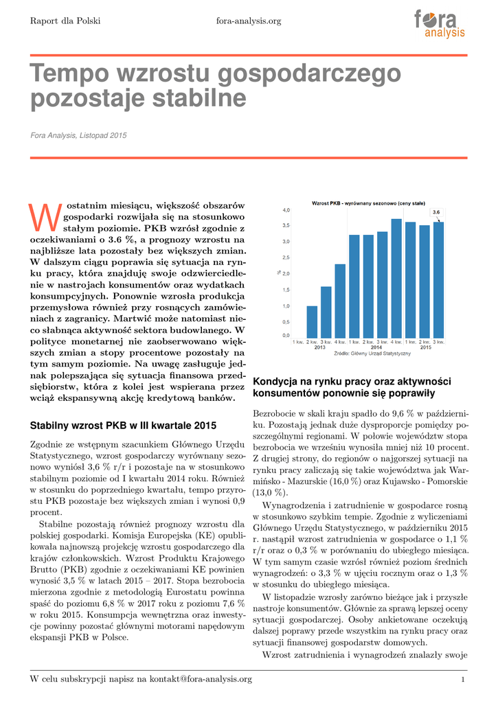 Raport dla Polski fora-analysis.org Tempo wzrostu gospodarczego pozostaje stabilne Fora Analysis, Listopad 2015 ostatnim miesiącu, większość obszarów gospodarki rozwijała się na stosunkowo stałym poziomie. PKB wzrósł zgodnie z oczekiwaniami o 3.6 %, a prognozy wzrostu na najbliższe lata pozostały bez większych zmian. W dalszym ciągu poprawia się sytuacja na rynku pracy, która znajduję swoje odzwierciedlenie w nastrojach konsumentów oraz wydatkach konsumpcyjnych. Ponownie wzrosła produkcja przemysłowa również przy rosnących zamówieniach z zagranicy. Martwić może natomiast nieco słabnąca aktywność sektora budowlanego. W polityce monetarnej nie zaobserwowano większych zmian a stopy procentowe pozostały na tym samym poziomie. Na uwagę zasługuje jednak polepszająca się sytuacja finansowa przedKondycja na rynku pracy oraz aktywności siębiorstw, która z kolei jest wspierana przez konsumentów ponownie sie˛ poprawiły wciąż ekspansywną akcję kredytową banków. W Stabilny wzrost PKB w III kwartale 2015 Zgodnie ze wstępnym szacunkiem Głównego Urzędu Statystycznego, wzrost gospodarczy wyrównany sezonowo wyniósł 3,6 % r/r i pozostaje na w stosunkowo stabilnym poziomie od I kwartału 2014 roku. Również w stosunku do poprzedniego kwartału, tempo przyrostu PKB pozostaje bez większych zmian i wynosi 0,9 procent. Stabilne pozostają również prognozy wzrostu dla polskiej gospodarki. Komisja Europejska (KE) opublikowała najnowszą projekcję wzrostu gospodarczego dla krajów członkowskich. Wzrost Produktu Krajowego Brutto (PKB) zgodnie z oczekiwaniami KE powinien wynosić 3,5 % w latach 2015 – 2017. Stopa bezrobocia mierzona zgodnie z metodologią Eurostatu powinna spaść do poziomu 6,8 % w 2017 roku z poziomu 7,6 % w roku 2015. Konsumpcja wewnętrzna oraz inwestycje powinny pozostać głównymi motorami napędowym ekspansji PKB w Polsce. Bezrobocie w skali kraju spadło do 9,6 % w październiku. Pozostają jednak duże dysproporcje pomiędzy poszczególnymi regionami. W połowie województw stopa bezrobocia we wrześniu wynosiła mniej niż 10 procent. Z drugiej strony, do regionów o najgorszej sytuacji na rynku pracy zaliczają się takie województwa jak Warmińsko - Mazurskie (16,0 %) oraz Kujawsko - Pomorskie (13,0 %). Wynagrodzenia i zatrudnienie w gospodarce rosną w stosunkowo szybkim tempie. Zgodnie z wyliczeniami Głównego Urzędu Statystycznego, w październiku 2015 r. nastąpił wzrost zatrudnienia w gospodarce o 1,1 % r/r oraz o 0,3 % w porównaniu do ubiegłego miesiąca. W tym samym czasie wzrósł również poziom średnich wynagrodzeń: o 3,3 % w ujęciu rocznym oraz o 1,3 % w stosunku do ubiegłego miesiąca. W listopadzie wzrosły zarówno bieżące jak i przyszłe nastroje konsumentów. Głównie za sprawą lepszej oceny sytuacji gospodarczej. Osoby ankietowane oczekują dalszej poprawy przede wszystkim na rynku pracy oraz sytuacji finansowej gospodarstw domowych. Wzrost zatrudnienia i wynagrodzeń znalazły swoje W celu subskrypcji napisz na [email protected] 1 Raport dla Polski fora-analysis.org odzwierciedlenie również we wzroście aktywności gospodarstw domowych. Sprzedaż detaliczna liczona w cenach stałych zwiększyła się o 3,6 % r/r w październiku br. wobec wzrostu o 2,9 % r/r w miesiącu wcześniejszym. W okresie tym najszybciej rosła sprzedaż prasy oraz książek (18,1 %), produktów odzieżowych (17,7 %) oraz pojazdów samochodowych (15,6 %). W dużo mniejszym tempie zwiększyła się sprzedaż paliw (0,5 %), żywności (4,1 %) oraz artykułów wyposażenia mieszkań (4,5 %). sunku do analogicznego okresu w roku 2014. W tym samym czasie import zwiększył się o 3,6 %. Dużo szybszy wzrost wartości eksportu w stosunku do importu spowodował wystąpienie nadwyżki handlowej w okresie od stycznia do września w wysokości 8,9 mld złotych (pierwsza nadwyżka handlowa w tak długim okresie od pierwszej połowy lat ‘90). W poprzednim roku w okresie tym występował wciąż deficyt obrotów handlowych z zagranicą, który wyniósł 7,1 mld złotych. Produkcja przemysłowa oraz eksport w dalszym ciagu ˛ rosna˛ Ogółem ceny dóbr i usług dla konsumentów w październiku spadły o 0,7 % r/r. Wskaźnik PMI dla sektora przemysłowego wzrósł w październiku br. do 52,2 z 50,9 punktów we wrześniu. Poprawa odczytu wskaźnika PMI była spowodowana głównie szybszym wzrostem liczby nowych zamówień oraz wielkości produkcji. W październiku, po miesięcznej przerwie, zwiększyła się liczba nowych zamówień z zagranicy. Ponadto, zgodnie z wynikami ankiety PMI, rośnie zatrudnienie w sektorze przemysłowym, które jest kontynuowane 27 miesiąc z rzędu. Jest to najdłuższy nieprzerwany okres wzrostu zatrudnienia w historii tej ankiety (od 1998). W październiku br. produkcja sprzedana przemysłu po wyeliminowaniu czynników sezonowych wzrosła o 4,7 % r/r, nieco szybciej aniżeli w poprzednim miesiącu, kiedy to zarejestrowano przyrost o 4,2 %. W ciągu ubiegłego roku nastąpiła ekspansja produkcji dla 23 spośród 34 działów przemysłu. W przeciwieństwie do produkcji przemysłowej, w październiku nastąpił spadek produkcji budowlano - montażowej o 2,3 % r/r (-0,9 % we wrześniu br.). W stosunku do poziomu sprzed roku spadła aktywność we wszystkich działach budownictwa. Eksport z Polski w cenach bieżących w pierwszych dziewięciu miesiącach 2015 r. wzrósł o 6,8 % w sto- Największy udział miały w tym kurczące się ceny paliw, które w tym okresie zmalały o 16,4 procent. Spadły również ceny transportu (-10,4 %), odzieży i obuwia (-4,5 %), energii dla gospodarstw domowych (-0,4 %) oraz artykułów wyposażenia mieszkań (-0,4 %). Z drugiej strony, w okresie ostatniego roku najszybciej rosły ceny dóbr i usług związanych z ochroną zdrowia (2,6 %), ceny w restauracjach i hotelach (1,2 %) oraz koszty edukacji (1,0 %). Instytut BIEC szacuje, że deflacja cen w gospodarce powinna si