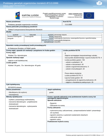 Podstawy genetyki organizmów morskich #13.0.0066 Sylabusy - Centrum Informatyczne UG Dział Kształcenia Projekt współfinansowany przez Unię Europejską w ramach Europejskiego Funduszu Społecznego Nazwa przedmiotu Kod ECTS Podstawy genetyki organizmów morskich Nazwa jednostki prowadzącej przedmiot 13.0.0066 Zakład Funkcjonowania Ekosystemów Morskich Studia wydział Wydział Oceanografii i Geografii kierunek Oceanografia poziom forma moduł specjalnościowy specjalizacja pierwszego stopnia stacjonarne oceanografia chemiczna, oceanografia fizyczna z geoinformatyką, oceanografia biologiczna wszystkie Nazwisko osoby prowadzącej (osób prowadzących) dr Katarzyna Smolarz; dr Rafał Lasota Formy zajęć, sposób ich realizacji i przypisana im liczba godzin Formy zajęć Liczba punktów ECTS Wykład, Ćw. laboratoryjne Sposób realizacji zajęć 6 Zajęcia wymagające bezpośredniego udziału nauczyciela akademickiego: Łączna liczba ECTS: 4 Liczba punktów godzin: 100 - udział w wykładach: 30 - udział w ćwiczeniach: 45 - udział w egzaminie/zaliczeniu: 5 - udział w konsultacjach: 20 zajęcia w sali dydaktycznej Liczba godzin Wykład: 30 godz., Ćw. laboratoryjne: 45 godz. Praca własna studenta: Liczba punktów ECTS: 2 Łączna liczba godzin: 50 - przygotowanie do egzaminu/zaliczenia: 25 - zajęcia o charakterze praktycznym: 25 Cykl dydaktyczny 2015/2016 zimowy Status przedmiotu - fakultatywny (do wyboru) - obowiązkowy Metody dydaktyczne - wykład z prezentacją multimedialną - ćwiczenia laboratoryjne - projektowanie doświadczeń - ćwiczenia laboratoryjne - wykonywanie doświadczeń Język wykładowy polski Forma i sposób zaliczenia oraz podstawowe kryteria oceny lub wymagania egzaminacyjne Sposób zaliczenia - Egzamin - Zaliczenie na ocenę Formy zaliczenia - wykonanie pracy zaliczeniowej - przeprowadzenie badań i prezentacja ich wyników - egzamin pisemny z pytaniami (zadaniami) otwartymi - zaliczenie ustne - egzamin ustny Podstawowe kryteria oceny Podstawy genetyki organizmów morskich #13.0.0066 | Strona 1 z 3 Podstawy genetyki organizmów morskich #13.0.0066 Sylabusy - Centrum Informatyczne UG Dział Kształcenia Wykład • egzamin końcowy, forma pisemna i ustna (100%) Ćwiczenia • ustalenie oceny zaliczeniowej na podstawie ocen cząstkowych otrzy-mywanych w trakcie trwania semestru, pracy zaliczeniowej oraz pra-cy zespołowej (aktywności na zajęciach), w tym: • ocena aktywności i pracy bezpośrednio na zajęciach (oceniane: praca w grupie, aktywność, 15% całości oceny) • znajomość materiału omawianego na zajęciach (oceniane: praktyczne wykorzystanie omawianych zagadnień, kojarzenie faktów, 60% całości oceny) • praca zaliczeniowa (oceniane: zakres wyczerpania tematu, popraw-ność merytoryczna, oryginalność, forma, 25% całości oceny) Sposób weryfikacji założonych efektów kształcenia Określenie przedmiotów wprowadzających wraz z wymogami wstępnymi A. Wymagania formalne brak B. Wymagania wstępne biologia na poziomie podstawowym, chemia organiczna na poziomie podstawowym, podstawy statystyki Cele kształcenia Celem przedmiotu jest omówienie podstawowych zagadnień współczesnej genetyki na przykładach organizmów morskich oraz zapoznanie studentów z podstawowymi technikami cytogenetycznymi i genetycznymi stosowanymi w genetyce organizmów morskich. Nabycie przez studenta wiedzy niezbędnej do samodzielnego przeprowadzenia i oceny podstawowych badań genetycznych i cytogenetycznych oraz testów genotoksyczności. Na tej podstawie student powinien wyciągnąć prawidłowe wnioski dotyczące struktury genetycznej populacji, omówić procesy prowadzące do ekspresji genu, zanalizować zmienność dziedziczność i niedziedziczną oraz dziedziczenie alleliczne i niealleliczne. Dodatkowym celem dydaktycznym jest przyswojenie zasad etyki w badaniach genetycznych oraz nabycie umiejętności analizy i oceny źródeł literaturowych, w tym anglojęzycznych, z zakresu przed-miotu. Treści programowe A. Problematyka wykładu A1. Podstawowe zagadnienia współczesnej genetyki szeroko zilustrowane na przykładach organizmów morskich. A2. Jądrowe i mitochondrialne DNA, samopowielanie materiału genetycznego i ekspresja genów, struktura genomu. A3. Właściwości i współdziałanie genów (penetracja, ekspresywność, dziedziczenie cech ilościowych i jakościowych). A4. Charakterystyka chromosomów jako nośników genów (budowa, funkcje, podział, położenie genów, kariotyp), ewolucja karioty-pów. A5. Zmienność dziedziczna i niedziedziczna. A6. Aberracje chromosomowe liczbowe i strukturalne, mutacje genowe oraz czynniki środowiskowe o działaniu genotoksycznym i mutagennym, testy genotoksyczności. A7. Techniki biochemiczne i molekularne stosowane w ekologii morza, markery genetyczne, miary zmienności genetycznej i ich za-stosowanie w praktyce. A8. Dziedziczenie alleliczne i niealleliczne, wieloczynnikowe, odziedziczalność. A9. Podstawy genetyki populacyjnej. B. Problematyka ćwiczeń / laboratorium B1. Ćwiczenia obejmują zajęcia laboratoryjne i audytoryjne poświęcone poznaniu podstawowych metod analitycznych i statystycz-nych wykorzystywanych w szeroko pojętych badaniach genetycznych. B2. Zapoznanie studenta z zasadami bezpieczeństwa stosowanymi w laboratorium i przygotowanie do pracy w grupie. B3. Charakterystyka cytogenetyczna 2 gatunków małży morskich Macoma balthica oraz Mytilus trossulus (wizualizacja chromoso-mów i kariotypowanie), analiza aneuploidalnych komórek nowotworowych (małże Macoma balthica), przeprowadzenie podstawo-wych testów genotoksyczności stosowanych w środowisku morskim. Analiza zmienności genetycznej wybranych gatunków morskich w oparciu o podstawowe markery molekularne. B4. Praktyczne wykorzystanie praw genetyki klasycznej w rozwiązywaniu zadań dotyczących krzyżówek genetycznych oraz mapo-waniu genów (dystans genetyczny), metody testowania wiarygodności hipotez genetycznych c