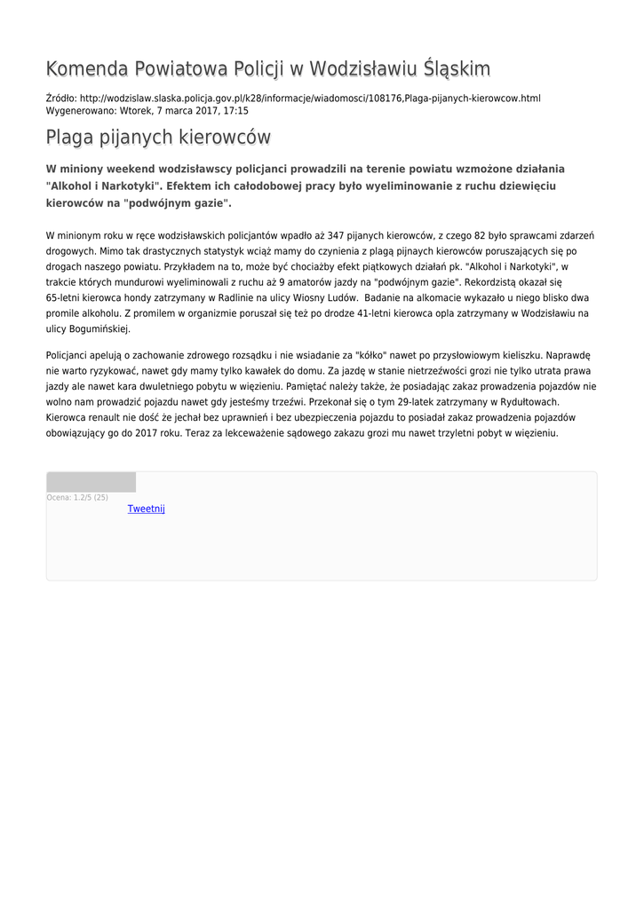 Komenda Powiatowa Policji w Wodzisławiu Śląskim Źródło: http://wodzislaw.slaska.policja.gov.pl/k28/informacje/wiadomosci/108176,Plaga-pijanych-kierowcow.html Wygenerowano: Wtorek, 7 marca 2017, 17:15 Plaga pijanych kierowców W miniony weekend wodzisławscy policjanci prowadzili na terenie powiatu wzmożone działania "Alkohol i Narkotyki". Efektem ich całodobowej pracy było wyeliminowanie z ruchu dziewięciu kierowców na "podwójnym gazie". W minionym roku w ręce wodzisławskich policjantów wpadło aż 347 pijanych kierowców, z czego 82 było sprawcami zdarzeń drogowych. Mimo tak drastycznych statystyk wciąż mamy do czynienia z plagą pijnaych kierowców poruszających się po drogach naszego powiatu. Przykładem na to, może być chociażby efekt piątkowych działań pk. "Alkohol i Narkotyki", w trakcie których mundurowi wyeliminowali z ruchu aż 9 amatorów jazdy na "podwójnym gazie". Rekordzistą okazał się 65-letni kierowca hondy zatrzymany w Radlinie na ulicy Wiosny Ludów. Badanie na alkomacie wykazało u niego blisko dwa promile alkoholu. Z promilem w organizmie poruszał się też po drodze 41-letni kierowca opla zatrzymany w Wodzisławiu na ulicy Bogumińskiej. Policjanci apelują o zachowanie zdrowego rozsądku i nie wsiadanie za "kółko" nawet po przysłowiowym kieliszku. Naprawdę nie warto ryzykować, nawet gdy mamy tylko kawałek do domu. Za jazdę w stanie nietrzeźwości grozi nie tylko utrata prawa jazdy ale nawet kara dwuletniego pobytu w więzieniu. Pamiętać należy także, że posiadając zakaz prowadzenia pojazdów nie wolno nam prowadzić pojazdu nawet gdy jesteśmy trzeźwi. Przekonał się o tym 29-latek zatrzymany w Rydułtowach. Kierowca renault nie dość że jechał bez uprawnień i bez ubezpieczenia pojazdu to posiadał zakaz prowadzenia pojazdów obowiązujący go do 2017 roku. Teraz za lekceważenie sądowego zakazu grozi mu nawet trzyletni pobyt w więzieniu. Ocena: 1.2/5 (25) Tweetnij