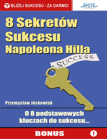 Copyright by Złote Myśli & Przemysław Jóskowiak, rok 2007 Autor: Przemysław Jóskowiak Tytuł: 8 Sekretów Sukcesu Napoleona Hilla Nr zamówienia: 1427940-20151028 Nr Klienta: 1351427 Data realizacji: 28.10.2015 Zapłacono: 0,00 zł Wydanie: Data: 07.11.2007 ISBN: Złote Myśli Sp. z o.o. ul. Kościuszki 1c 44-100 Gliwice www.zlotemysli.pl email: [email protected] Autor oraz Wydawnictwo Złote Myśli dołożyli wszelkich starań, by zawarte w tej książce informacje były kompletne i rzetelne. Nie biorą jednak żadnej odpowiedzialności ani za ich wykorzystanie, ani za związane z tym ewentualne naruszenie praw patentowych lub autorskich. Autor oraz Wydawnictwo Złote Myśli nie ponoszą również żadnej odpowiedzialności za ewentualne szkody wynikłe z wykorzystania informacji zawartych w książce. Niniejsza publikacja, ani żadna jej część, nie może być kopiowana, ani w jakikolwiek inny sposób reprodukowana, powielana, ani odczytywana w środkach publicznego przekazu bez pisemnej zgody wydawcy. Wykonywanie kopii metodą kserograficzną, fotograficzną, a także kopiowanie książki na nośniku filmowym, magnetycznym lub innym powoduje naruszenie praw autorskich niniejszej publikacji. Wszelkie prawa zastrzeżone. All rights reserved. Powered by TCPDF (www.tcpdf.org) SPIS TREŚCI KILKA SŁÓW WSTĘPU..........................................................................................4 8 PODSTAWOWYCH KLUCZY DO SUKCESU.........................................................6 Sekret pierwszy: Trzeba mieć cel..............................................................7 Sekret drugi: Atrakcyjność przyciąga sukces...........................................9 Sekret trzeci: Sukces jest wiarą...............................................................11 Sekret czwarty: Trzeba robić więcej........................................................12 Sekret piąty: Trzeba żyć optymizmem....................................................14 Sekret szósty: Podstawą jest kontrola.....................................................15 Sekret siódmy: Potęgą jest nauka...........................................................17 Sekret ósmy: Trzeba korzystać z nawyku...............................................18 PODSUMOWANIE...............................................................................................20 LITERATURA.......................................................................................................22 8 SEKRETÓW SUKCESU NAPOLEONA HILLA ● str. 4 Przemysław Jóskowiak Kilka słów wstępu Każdy lub większość z nas dąży, przynajmniej podświadomie, do sukcesu i to w różnych dziedzinach życia. Wszyscy, którzy stawiają sobie cele i zmierzają do ich realizacji, poszukują odpowiedzi na pytanie, co tak naprawdę decyduje o osiąganiu sukcesu. Psychologia sukcesu, literatura motywacyjna lub literatura sukcesu to obecnie pojęcia, które także w Polsce cieszą się rosnącą popularnością i stanowią źródło praktycznej wiedzy dla tych, którzy chcą osiągnąć sukces. Każdy, kto poważnie podchodzi do kwestii osiągania sukcesu, nie może obejść się bez publikacji takich autorów jak Anthony Robbins, Dale Carnegie, Robert Schuller, Robert Kiyosaki czy Napoleon Hill. Spośród wymienionych pisarzy-mentorów czołowe miejsce zajmuje z pewnością Napoleon Hill, którego dzieło „Myśl i bogać się” (z ang. „Think and grow rich”) to nie tyle światowy bestseller w tej dziedzinie literatury, co prawdziwa legenda. „Myśl i bogać się” oraz książki „Sukces. Trzeba tylko chcieć” (Napoleon Hill, W. Clement Stone), „Napoleona Hilla Klucze do Sukcesu” to kopalnia wiedzy o pozytywnym myśleniu i inspiracji do osiągania sukcesu. Copyright by Wydawnictwo Złote Myśli &PBC Pro Business Communication 8 SEKRETÓW SUKCESU NAPOLEONA HILLA Przemysław Jóskowiak ● str. 5 E-book „8 Sekretów Sukcesu Napoleona Hilla” jest próbą prezentacji najważniejszych idei i przesłań 8 z 17 zasad osiągania sukcesu sformułowanych przez Napoleona Hilla. Głównym zamiarem autora tej publikacji było stworzenie krótkiego i zwięzłego przewodnika po świecie filozofii sukcesu Hilla oraz zainspirowanie czytelników do dalszego studiowania tej wiedzy. E-book bazuje całkowicie na treści wyżej wymienionych publikacji Napoleona Hilla, a wybór, prezentacja i interpretacja zasad osiągania sukcesu są koncepcją autorską. Copyright by Wydawnictwo Złote Myśli &PBC Pro Business Communication 8 SEKRETÓW SUKCESU NAPOLEONA HILLA ● str. 6 Przemysław Jóskowiak 8 podstawowych kluczy do sukcesu Napoleon Hill był nie był człowiekiem sukcesu w sensie tradycyjnym i najbardziej oczywistym. Jego sukcesem nie były ani dokonania zawodowo-biznesowe ani publiczno-społeczne. Jego nazwisko było przez długi okres znane jedynie wąskiej grupy ludzi, którzy mieli jednak jedną cechę wspólną: wszyscy należeli do grona 2% ludzi, których sposób myślenia i działania doprowadził do najwyższych szczytów sukcesu, tam, gdzie 98% ludzi nigdy nie dotrze. Napoleon Hill był teoretykiem i filozofem, którego dziełem życiowym było zbadanie praktycznych zasad osiągania sukcesu w oparciu o rozmowy z postaciami wybitnymi. Nauka Hilla to filozofia sukcesu oparta na siedemnastu zasadach: precyzja celu, trust mózgów, atrakcyjna osobowość, praktyczna wiara, dodatkowych tysiąc kroków, osobista inicjatywa, pozytywna postawa umysłowa, kontrolowany entuzjazm, samodyscyplina, precyzyjne myślenie, skupiona uwaga, praca zespołowa, nauka na przeciwnościach i porażkach, twórcza wizja, dobre zdrowie, budżet czasu i pieniędzy, siła nawyku. Filozofia Hilla to także 8 podstawowych SEKRETÓW SUKCESU lub inaczej kluczy do sukcesu, bez których nie da się obejść przy realizacji jakichkolwiek celów. Są one przedmiotem niniejszej publikacji: Copyright by Wydawnictwo Złote Myśli &PBC Pro Business Communication 8 SEKRET