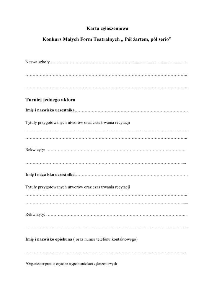 Karta zgłoszeniowa Konkurs Małych Form Teatralnych „ Pół żartem, pół serio” Nazwa szkoły………………………………………………….................................................... ………………………………………………………………………………………………….. ………………………………………………………………………………………………….. Turniej jednego aktora Imię i nazwisko uczestnika……………………………………………………………………. Tytuły przygotowanych utworów oraz czas trwania recytacji ………………………………………………………………………………………………….. ………………………………………………………………………………………………….. Rekwizyty: …………………………………………………………………………………….. ………………………………………………………………………………………………..... Imię i nazwisko uczestnika……………………………………………………………………. Tytuły przygotowanych utworów oraz czas trwania recytacji ………………………………………………………………………………………………….. ………………………………………………………………………………………………....... Rekwizyty: ……………………………………………………………………………………... ………………………………………………………………………………………………….. Imię i nazwisko opiekuna ( oraz numer telefonu kontaktowego) …………………………………………………………………………………………………. *Organizator prosi o czytelne wypełnianie kart zgłoszeniowych