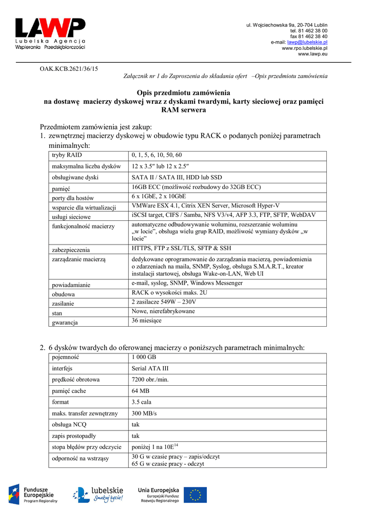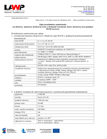 ul. Wojciechowska 9a, 20-704 Lublin tel. 81 462 38 00 fax 81 462 38 40 e-mail: [email protected] www.rpo.lubelskie.pl www.lawp.eu OAK.KCB.2621/36/15 Załącznik nr 1 do Zaproszenia do składania ofert –Opis przedmiotu zamówienia Opis przedmiotu zamówienia na dostawę macierzy dyskowej wraz z dyskami twardymi, karty sieciowej oraz pamięci RAM serwera Przedmiotem zamówienia jest zakup: 1. zewnętrznej macierzy dyskowej w obudowie typu RACK o podanych poniżej parametrach minimalnych: tryby RAID 0, 1, 5, 6, 10, 50, 60 maksymalna liczba dysków 12 x 3.5″ lub 12 x 2.5″ obsługiwane dyski SATA II / SATA III, HDD lub SSD pamięć porty dla hostów wsparcie dla wirtualizacji usługi sieciowe funkcjonalność macierzy 16GB ECC (możliwość rozbudowy do 32GB ECC) 6 x 1GbE, 2 x 10GbE VMWare ESX 4.1, Citrix XEN Server, Microsoft Hyper-V iSCSI target, CIFS / Samba, NFS V3/v4, AFP 3.3, FTP, SFTP, WebDAV zabezpieczenia zarządzanie macierzą HTTPS, FTP z SSL/TLS, SFTP & SSH powiadamianie obudowa zasilanie stan gwarancja automatyczne odbudowywanie woluminu, rozszerzanie woluminu „w locie”, obsługa wielu grup RAID, możliwość wymiany dysków „w locie” dedykowane oprogramowanie do zarządzania macierzą, powiadomienia o zdarzeniach na maila, SNMP, Syslog, obsługa S.M.A.R.T., kreator instalacji startowej, obsługa Wake-on-LAN, Web UI e-mail, syslog, SNMP, Windows Messenger RACK o wysokości maks. 2U 2 zasilacze 549W – 230V Nowe, nierefabrykowane 36 miesiące 2. 6 dysków twardych do oferowanej macierzy o poniższych parametrach minimalnych: pojemność 1 000 GB interfejs Serial ATA III prędkość obrotowa 7200 obr./min. pamięć cache 64 MB format 3.5 cala maks. transfer zewnętrzny 300 MB/s obsługa NCQ tak zapis prostopadły tak stopa błędów przy odczycie poniżej 1 na 10E14 30 G w czasie pracy – zapis/odczyt 65 G w czasie pracy - odczyt odporność na wstrząsy ul. Wojciechowska 9a, 20-704 Lublin tel. 81 462 38 00 fax 81 462 38 40 e-mail: [email protected] www.rpo.lubelskie.pl www.lawp.eu 250 G w spoczynku linia dysków nominalny czas pracy stan uwagi gwarancja zoptymalizowany pod kątem pracy w macierzach NAS 1 000 000 godzin Nowe, nierefabrykowane a) dyski twarde muszą być w pełni kompatybilne z oferowaną macierzą dyskową b) wszystkie dyski twarde muszą być egzemplarzami tego samego modelu dysku 36 miesięcy 3. karty sieciowej HP NC360T Dual Port 1GB ( 412648-B21) lub innej dedykowanej dla serwera HP ProLiant ML 370 G5 o poniższych parametrach minimalnych: interfejs hosta PCI-E gniazdka sieciowe 2 x Ethernet szybkość przesyłania danych 1000 Mbit/s standardy 802.3, 802.3u, 802.3x, 802.3ab, 802.3ad, 802.1p, 802.1Q, PCIe v1.0a standard, RoHS (6 of 6), FCC (U.S. only) Class B, DOC (Canada) Class B, CE EN 55024, EN55022 Class B, VCCI Class II, UL 1950, CSA 950, EN 60950, CE, ACPI 1.1a, MicroSoft WHQL systemy operacyjne Windows Server 2003, Windows Server 2008, Linux Red Hat 5.x, Linux SLES 10-SP1 interfejs PCI-E cechy obsługa WOL gwarancja 12 miesięcy 4. 2 zestawy pamięci RAM HP 8GB (2 x 4GB) FBD PC2-5300 (397415-B21) lub innej dedykowanej dla serwera HP ProLiant ML 370 G5 o poniższych parametrach minimalnych: pojemność 2 x 4GB typ pamięci DDR2 taktowanie 667 MHz pamięć w pełni buforowana tak obsługa ECC tak opóźnienie (Cycle Latency) 5 12 miesięcy gwarancja