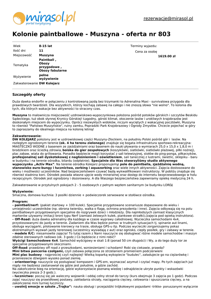 [email protected] Kolonie paintballowe - Muszyna - oferta nr 803 Wiek 8-15 lat Ilość dni 11 Miejscowość Muszyna Tematyka Paintball , Obozy przygodowe , Obozy fabularne Wyżywienie pełne wyżywienie Terminy wyjazdu: Cena za osobę 1619.00 zł Zakwaterowanie DW Kolejarz Szczegóły oferty Duża dawka endorfin w połączeniu z kontrolowaną jazdą bez trzymanki to Adrenalina Maxi - survivalowa przygoda dla prawdziwych twardzieli. Dla wszystkich, którzy kochają zabawę na całego i nie znoszą słowa "nie wolno". To kolonia dla tych, dla których wakacje bez aktywności to stracony czas. Muszyna to malownicza miejscowość uzdrowiskowo-wypoczynkowa położona pośród potoków górskich i szczytów Beskidu Sądeckiego, tuż obok słynnej Krynicy Górskiej! Łagodny, górski klimat, otoczenie lasów i urokliwych krajobrazów jest doskonałym miejscem do wypoczynku. Oprócz niezwykłych widoków, niczym wyciętych z wakacyjnej pocztówki, Muszyna to również "Państwo Muszyńskie", ruiny zamku, Popradzki Park Krajobrazowy i Ogrody Zmysłów. Chcecie pojechać w góry to zapraszamy do idealnego miejsca na kolonię letnią! Zakwaterowanie: DW KOLEJARZ położony jest w uzdrowiskowej części Muszyny-Złockiem, na południu Polski pośród gór i lasów. Na rozległym ogrodzonym terenie (ok. 4 ha terenu zielonego) znajduje się bogata infrastruktura sportowo-rekreacyjna: MIASTECZKO WODNE z basenem ze zjeżdżalniami oraz basenem do nauki pływania o wymiarach 25,0 x 15,0 x 1,8,0 m i brodzikiem oraz ścieżką zdrowia, boiska do gier zespołowych (koszykówki, siatkówki, siatkówki plażowej, piłki nożnej), plac zabaw, wiata do grillowania. Ponadto będziecie mogli korzystać z sali telewizyjnej, stołów do ping-ponga, piłkarzyków, profesjonalnej sali dyskotekowej z nagłośnieniem i oświetleniem, sali tanecznej z lustrami, świetlic, sklepiku - baru w budynku i na terenie ośrodka, bilardu (odpłatnie). Specjalnie dla Was stworzyliśmy studio aktywnego wypoczynku „Activ Max”. Na terenie ośrodka Kolejarz proponujemy: pole do paintballa, zjeżdżalnię wodną, stanowisko euro-bungy i łucznictwa, zorbing i aquazorbing oraz wiele innych aktywności. Zajęcia dostosowane do wieku i możliwości uczestników. Nad bezpieczeństwem czuwać będą wykwalifikowani instruktorzy. W pobliżu znajduje się również stadnina koni. Ośrodek posiada własne ujęcie wody mineralnej oraz dostęp do internetu bezprzewodowego w holu recepcyjnym. Ośrodek jest ogrodzony i dozorowany. A dla Waszego bezpieczeństwa zapewniamy opiekę medyczną 24 h. Zakwaterowanie w przytulnych pokojach 2 - 5 osobowych z pełnym węzłem sanitarnym (w budynku LORD) . Wyżywienie: Smaczna, domowa kuchnia: 3 posiłki dziennie + podwieczorek serwowane w stołówce ośrodka. Program: - paintball/nerf: (pakiet startowy + 100 kulek). Specjalnie przygotowane scenariusze dopasowane do wieku i umiejętności uczestników (np. obrona twierdzy, walka o flagę, ochrona prezydenta i inne). Zajęcia odbywają się na polu paintballowym przygotowanym specjalnie do rozgrywek dzieci i młodzieży. Dla najmłodszych zamiast klasycznych markerów używamy imitacji broni typu Nerf (zamiast żelowych kulek, piankowe strzałki),(zajęcia pod opieką instruktora). - Off-Road: duża dawka adrenaliny dla każdego w czasie wyprawy całodniowej. Wycieczka samochodami 4x4, przystosowanymi do jazdy w terenie. Zadaniem dla Was będzie pomoc w trudnych sytuacjach tj. spinanie aut linami, obsługa wyciągarki, pilotowanie kierowcy na trasie, obsługa GPS-u itp. Podczas wycieczki zorganizujemy pokaz ekstremalnych wyzwań jazdy terenowej (uczestnicy wysiadają z aut) oraz ognisko, ciepły posiłek, gry i zabawy w terenie. - modele R/C: niesamowite zajęcia! To tutaj razem z Nami nauczycie się obsługiwać różne modele samochodów i maszyn zdalnie sterowanych radiowo (ok. 3 godz.) Co będziecie z nimi robić? Wyścigi Samochodowe 4x4. Samochód wyścigowy w skali 1:8 (ponad 50 cm długości) i Wy, a do tego duży tor ze specjalnie przygotowanymi skoczniami. Off-Road: prawdziwy off road z przeszkodami, wzniesieniami i schodami! Robi się ciekawie, prawda? Mini bitwa pancerna czołgami, czyli zabawa połączona ze strzelaniem promieniem podczerwieni Mini plac budowy - najprościej czyli najlepiej! Wielką koparką wykopiecie "budulec", załadujecie go na ciężarówkę i przeniesiecie dźwigiem wysoko ponad ziemię. - orienteering: nauczycie się posługiwać kompasem i GPS-em, wyznaczać azymut i czytać mapy. Po tych zajęciach już nigdy nie będziesz zastanawiał się gdzie jest południe, a gdzie zachód. Na zakończenie bieg na orientację, gdzie wykorzystacie poznaną wiedzę i odnajdziecie ukryte punkty i wskazówki (wycieczka piesza 2-3 godz.). - łucznictwo: poczuj się jak waleczny wojownik i oddaj celny strzał do tarczy (kurs obejmuje 3 zajęcia po 1 godz). Podczas zajęć nauczysz się prawidłowej postawy, zakładania strzały, naciągania cięciwy, celowania i spuszczania cięciwy, a na zakończenie mini turniej łuczniczy. - uwolnij emocje w szkole „Trajka”: nauka obsługi i przejażdżki trójkołowymi pojazdami -trikke- poruszanymi wyłącznie siłą mięśni, bez użycia pedałów lub odpychania od podłoża (kurs obejmuje 3 zajęcia po 1 godz.). Korzystamy tylko z oryginalnych certyfikowanych urządzeń firmy TRIKKE. - zorbing: poczuj ducha walki i zmierz się z gigantyczną kulą. Zabawa polega na staczaniu się po specjalnie przygotowanym torze w ogromnej 3,5-metrowej kuli. W DW Kolejarz mamy unikatowy wykopany w ziemi tor o długości ok. 50 m oraz olbrzymią (12 m), dmuchaną zjeżdżalnię, na której Zorbing się rozpędza. Możliwa jest również zabawa po płaskiej powierzchni (chodzenie, pokonywanie slalomu, itp.) - aquazorbing: chodź po wodzie, biegaj i rób fikołki wewnątrz bańki. Aquazorbing czyli kula wodna gdzie zabawa polega na „chodzeniu” po wodzie w przeźroczystej kuli o średnicy 2 m. - duża prę