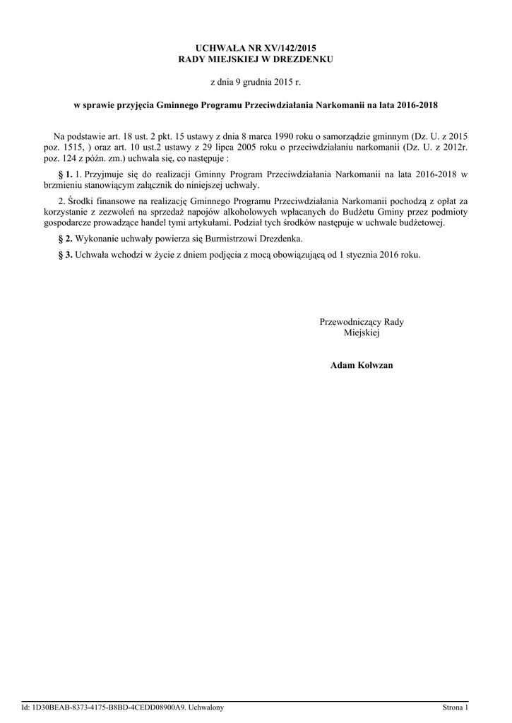UCHWAŁA NR XV/142/2015 RADY MIEJSKIEJ W DREZDENKU z dnia 9 grudnia 2015 r. w sprawie przyjęcia Gminnego Programu Przeciwdziałania Narkomanii na lata 2016-2018 Na podstawie art. 18 ust. 2 pkt. 15 ustawy z dnia 8 marca 1990 roku o samorządzie gminnym (Dz. U. z 2015 poz. 1515, ) oraz art. 10 ust.2 ustawy z 29 lipca 2005 roku o przeciwdziałaniu narkomanii (Dz. U. z 2012r. poz. 124 z późn. zm.) uchwala się, co następuje : § 1. 1. Przyjmuje się do realizacji Gminny Program Przeciwdziałania Narkomanii na lata 2016-2018 w brzmieniu stanowiącym załącznik do niniejszej uchwały. 2. Środki finansowe na realizację Gminnego Programu Przeciwdziałania Narkomanii pochodzą z opłat za korzystanie z zezwoleń na sprzedaż napojów alkoholowych wpłacanych do Budżetu Gminy przez podmioty gospodarcze prowadzące handel tymi artykułami. Podział tych środków następuje w uchwale budżetowej. § 2. Wykonanie uchwały powierza się Burmistrzowi Drezdenka. § 3. Uchwała wchodzi w życie z dniem podjęcia z mocą obowiązującą od 1 stycznia 2016 roku. Przewodniczący Rady Miejskiej Adam Kołwzan Id: 1D30BEAB-8373-4175-B8BD-4CEDD08900A9. Uchwalony Strona 1 Załącznik do Uchwały Nr XV/142/2015 Rady Miejskiej w Drezdenku z dnia 9 grudnia 2015 r. GMINNY PROGRAM PRZECIWDZIAŁANIA NARKOMANII NA LATA 2016-2018 Program został przygotowany przez Kierownika Ośrodka Pomocy Społecznej w porozumieniu z Gminną Komisją Rozwiązywania Problemów Alkoholowych, na podstawie ustawy z 29 lipca 2005 roku o przeciwdziałaniu narkomanii (Dz. U. z 2012r. poz. 124 z późn. zm.). Gminny Program Przeciwdziałania Narkomanii na lata 2016 - 2018 jest spójny z Krajowym Programem Przeciwdziałania Narkomanii oraz stanowi część Strategii i Rozwiązywania Problemów Społecznych Gminy Drezdenko. Celem głównym programu jest realizacja działań profilaktyczno – interwencyjnych w gminie Drezdenko służących eliminowaniu ujemnych skutków narkomanii. Do realizacji powyższego celu programu przyjęto następujące zadania: I. Zwiększenie dostępności pomocy terapeutycznej i rehabilitacyjnej dla osób uzależnionych i osób zagrożonych uzależnieniem od narkotyków lub innych środków psychoaktywnych: Opis celu: stworzenie odpowiednich działań profilaktycznych i terapeutycznych umożliwiających osobom uzależnionym ponowną integrację ze społeczeństwem. 1. Współpraca z ośrodkami terapii uzależnień, oddziałami detoksykacji i leczenia uzależnień z terenu całego kraju. 2. Miejsce pierwszego kontaktu – gminny punkt konsultacyjny przy ul. Marszałkowskiej 18 w Drezdenku. Efekty: zwiększenie efektywności udzielanej pomocy, zmniejszenie liczby osób zagrożonych uzależnieniem. II. Udzielanie pomocy rodzinom, w których występują problemy narkomanii: 1. Pomoc w ramach działalności punktu konsultacyjnego: informacyjna, psychologiczna - doraźna i terapeutyczna. 2. Koordynowanie działań dotyczących pomocy rodzinom, w których występują problemy narkomanii, poprzez współpracę z policją, ops, przedstawicielami ochrony zdrowia, szkołami, organizacjami pozarządowymi i osobami fizycznymi realizującymi programy przeciwdziałania narkomanii. 3. Stworzenie bazy danych placówek dla osób uzależnionych oraz zagrożonych uzależnieniem. Efekty: stworzenie wspólnej polityki na rzecz przeciwdziałania narkomanii, aktywizacja organizacji pozarządowych działających w zakresie profilaktyki narkomanii. III. Cel operacyjny: Prowadzenie profilaktycznej działalności informacyjnej, edukacyjnej i szkoleniowej w zakresie rozwiązywania problemów narkomanii, w szczególności dla dzieci i młodzieży: Opis celu: określenie kierunków zmierzających do wspierania i rozwoju programów profilaktycznych, podnoszenie wiedzy lokalnej społeczności w zakresie problemów narkomanii oraz podnoszenie kwalifikacji zawodowych osób zaangażowanych w działalność profilaktyczną. 1. Realizacja na terenie szkół programów profilaktycznych dla dzieci i młodzieży. 2. Promowanie zdrowego stylu życia i aktywnych form spędzania wolnego czasu przez dzieci i młodzież. 3. Dofinansowanie szkoleń i podnoszenie kwalifikacji osób realizujących zadania profilaktyczne z zakresu przeciwdziałania narkomanii. 4. Współpraca z instytucjami zajmującymi się profilaktyką narkomanii na terenie całego kraju. 5. Prowadzenie akcji informacyjno-profilaktycznych w zakresie zażywania tzw. środków psychoaktywnych z głównym naciskiem na placówki i świetlice szkolne. 6. Prowadzanie lokalnych i regionalnych kampanii edukacyjnych na tematy związane z problemem narkomanii oraz współudział w ogólnopolskich kampaniach medialnych dotyczących tej tematyki. Id: 1D30BEAB-8373-4175-B8BD-4CEDD08900A9. Uchwalony Strona 1 7. Promocja prowadzenia zajęć sportowo-rekreacyjnych. 8. Zakup i rozprowadzanie materiałów informacyjno – edukacyjnych (książki, kasety, płyty DVD, broszury, ulotki itp.). Efekty: podniesienie świadomości społecznej o problemie uzależnień od substancji psychoaktywnych, wzrost zaangażowania społeczności lokalnej w działania profilaktyczne, zwiększenie liczby osób objętych programami profilaktycznymi, zwiększenie liczby osób objętych pomocą psychologiczną oraz prawną. IV. Wspomaganie działań instytucji, organizacji pozarządowych i osób fizycznych służących rozwiązywaniu problemów narkomanii. 1. Wspieranie działań profilaktycznych o charakterze rekreacyjnym, sportowym itp. dla dzieci i młodzieży w szczególny sposób eksponujący szkodliwość narkotyków. Efekty: ograniczenie szkód społecznych wynikających z uzależnienia od narkotyków. V. Pomoc społeczna osobom uzależnionym i rodzinom osób uzależnionych dotkniętym ubóstwem i wykluczeniem społecznym i integrowanie ze środowiskiem lokalnym tych osób: 1. Współpraca w tym zakresie z Ośrodkiem Pomocy Społecznej oraz Centrum Integracji Społecznej w Drezdenku. Efekty: Aktywizacja podmiotów ekonomi