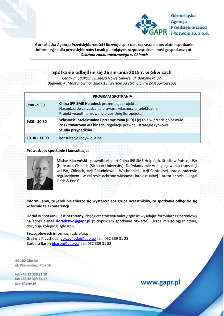 Górnośląska Agencja Przedsiębiorczości i Rozwoju sp. z o.o. zaprasza na bezpłatne spotkanie informacyjne dla przedsiębiorców i osób planujących rozpocząć działalność gospodarczą nt. Ochrona znaku towarowego w Chinach Spotkanie odbędzie się 26 sierpnia 2015 r. w Gliwicach Centrum Edukacji i Biznesu Nowe Gliwice, ul. Bojkowska 37, Budynek 4 „Maszynownia” sala 013 (wejście od strony biura paszportowego) PROGRAM SPOTKANIA 9:00 - 9:30 China IPR SME Helpdesk prezentacja projektu. Narzędzia do zarządzania prawami własności intelektualnej. Projekt współfinansowany przez Unię Europejską 9:30 - 10:30 Własność intelektualna i przemysłowa (IPR) i jej rola w przedsiębiorstwie Znak towarowy w Chinach: regulacje prawne i strategie rynkowe Studia przypadków 10.30 - 11.00 konsultacje indywidualne Prowadzący spotkanie i konsultacje: Michał Kłaczyński - prawnik, ekspert China IPR SME Helpdesk. Studia w Polsce, USA (Harvard), Chinach (Sichuan University). Doświadczenie w negocjowaniu transakcji w USA, Chinach, Azji Południowo - Wschodniej i Azji Centralnej oraz doradztwie regulacyjnym i w zakresie ochrony własności intelektualnej. Autor serwisu „Legal Odds & Ends" . Informujemy, że jeżeli nie zbierze się wystarczająca grupa uczestników, to spotkanie odbędzie się w formie telekonferencji. Udział w spotkaniu jest bezpłatny, chęć uczestnictwa należy zgłosić wysyłając formularz zgłoszeniowy na adres e-mail [email protected] (z dopiskiem spotkanie otwarte). Liczba miejsc ograniczona, decyduje kolejność zgłoszeń. Szczegółowych informacji udzielają: Grażyna Przychodaj [email protected] tel. 032 339 31 23 Barbara Baron [email protected] tel. 032 339 31 52
