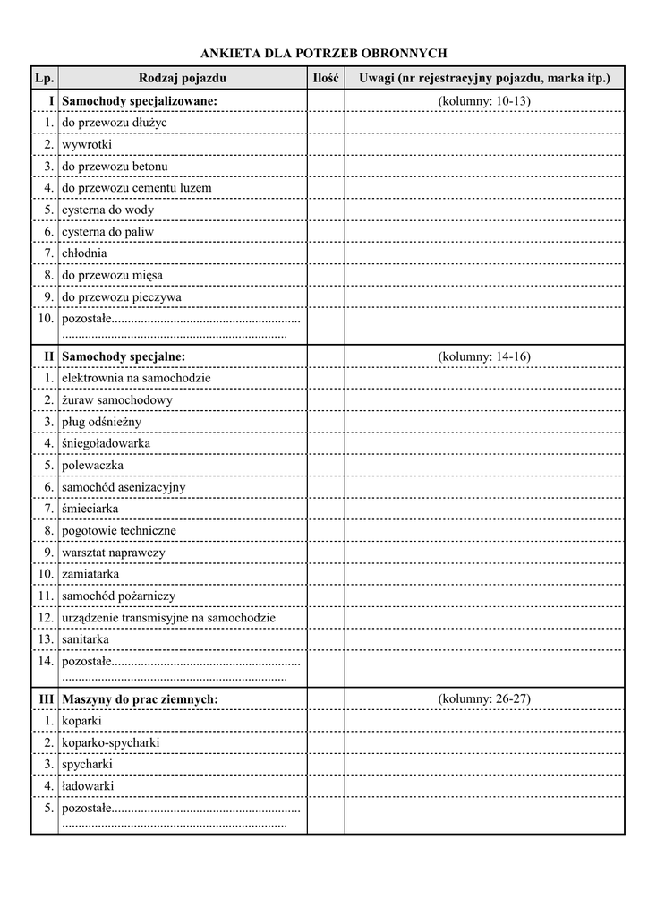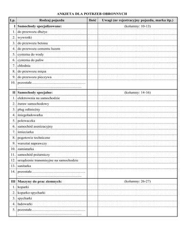 ANKIETA DLA POTRZEB OBRONNYCH Lp. Rodzaj pojazdu I Samochody specjalizowane: Ilość Uwagi (nr rejestracyjny pojazdu, marka itp.) (kolumny: 10-13) 1. do przewozu dłuŜyc 2. wywrotki 3. do przewozu betonu 4. do przewozu cementu luzem 5. cysterna do wody 6. cysterna do paliw 7. chłodnia 8. do przewozu mięsa 9. do przewozu pieczywa 10. pozostałe.......................................................... ..................................................................... II Samochody specjalne: (kolumny: 14-16) 1. elektrownia na samochodzie 2. Ŝuraw samochodowy 3. pług odśnieŜny 4. śniegoładowarka 5. polewaczka 6. samochód asenizacyjny 7. śmieciarka 8. pogotowie techniczne 9. warsztat naprawczy 10. zamiatarka 11. samochód poŜarniczy 12. urządzenie transmisyjne na samochodzie 13. sanitarka 14. pozostałe.......................................................... ..................................................................... III Maszyny do prac ziemnych: 1. koparki 2. koparko-spycharki 3. spycharki 4. ładowarki 5. pozostałe.......................................................... ..................................................................... (kolumny: 26-27) ZESTAWIENIE środków transportowych, maszyn i sprzętu w ________________________________________________________________________________________________________________________________ 19 20 21 22 23 24 25 26 27 rozsiewacz wapna 18 opryskiwacz ciągnikowy 17 ładowacz „CYKLOP” 16 pozostałe 15 do prac ziemnych 14 pozostałe 13 niskopodwoziowe 12 cysterny do paliw 11 maszyny cysterny do wody 10 skrzyniowe samochodowe skrzyniowe ciągnikowe 9 rolnicze kołowe 8 siodłowobalastowe 7 przyczepy gąsienicowe pozostałe 6 ciągniki pozostałe cysterna do paliw 5 samochody sanitarne Ŝuraw samochodowy cysterna do wody 4 wywrotka 2 Osinobus 1 samochody specjalne powyŜej 15 miejsc Nr rejestracyjny samochody specjalizowane autobusy do 1 miejsc Lp. sam. cięŜarowe skrzyniowe powyŜej 2 Mg sam. osobowe i osobowoterenowe 3 Rodzaj pojazdu do 2 Mg motocykl-motorower nazwa jednostki organizacyjnej – posiadacza środków transportowych, maszyn i sprzętu 28 29 30