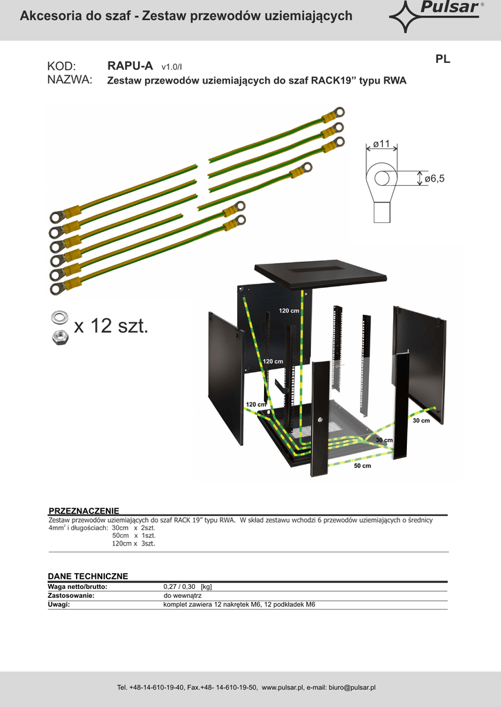 Pulsar Akcesoria do szaf - Zestaw przewodów uziemiających KOD: NAZWA: RAPU-A PL v1.0/I Zestaw przewodów uziemiających do szaf RACK19” typu RWA ø11 ø6,5 x 12 szt. PRZEZNACZENIE Zestaw przewodów uziemiających do szaf RACK 19” typu RWA. W skład zestawu wchodzi 6 przewodów uziemiających o średnicy 4mm2 i długościach: 30cm x 2szt. 50cm x 1szt. 120cm x 3szt. DANE TECHNICZNE Waga netto/brutto: Zastosowanie: Uwagi: 0,27 / 0,30 [kg] do wewnątrz komplet zawiera 12 nakrętek M6, 12 podkładek M6 Tel. +48-14-610-19-40, Fax.+48- 14-610-19-50, www.pulsar.pl, e-mail: [email protected] ®