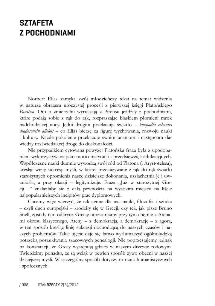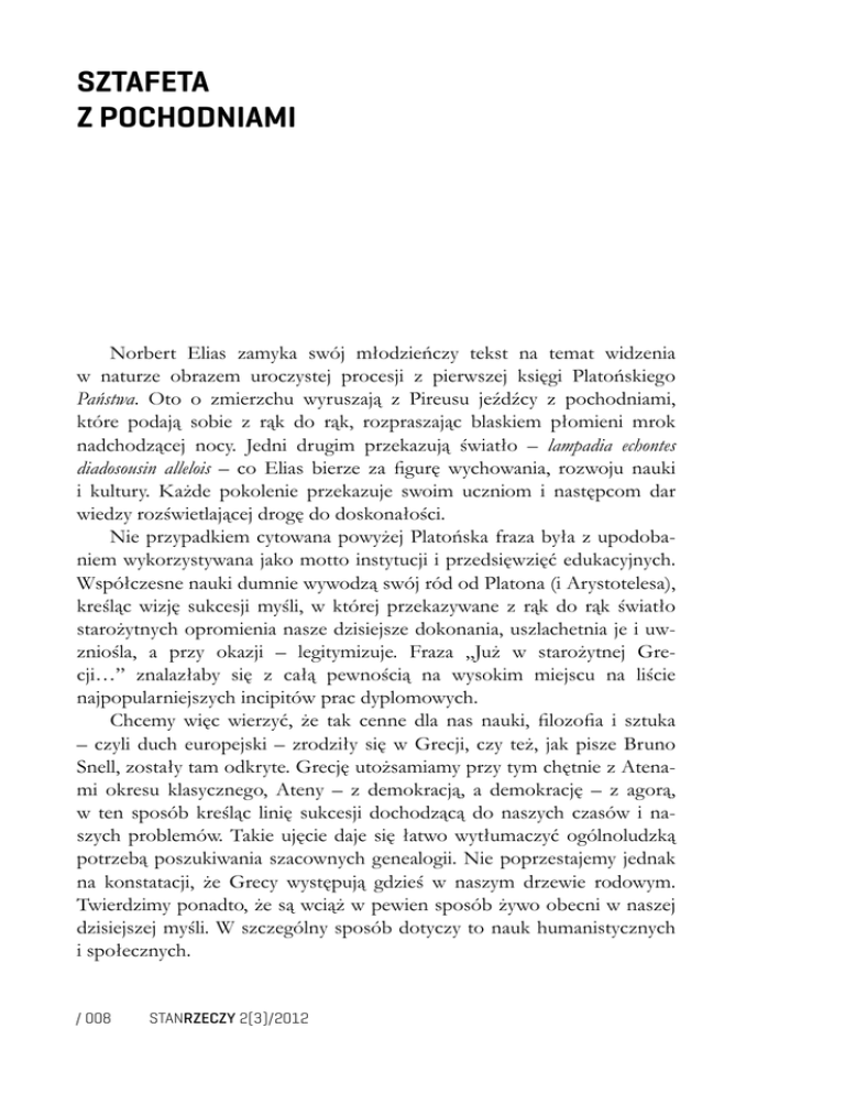 Sztafeta z pochodniami Norbert Elias zamyka swój młodzieńczy tekst na temat widzenia w naturze obrazem uroczystej procesji z pierwszej księgi Platońskiego Państwa. Oto o zmierzchu wyruszają z Pireusu jeźdźcy z pochodniami, które podają sobie z rąk do rąk, rozpraszając blaskiem płomieni mrok nadchodzącej nocy. Jedni drugim przekazują światło – lampadia echontes diadosousin allelois – co Elias bierze za figurę wychowania, rozwoju nauki i kultury. Każde pokolenie przekazuje swoim uczniom i następcom dar wiedzy rozświetlającej drogę do doskonałości. Nie przypadkiem cytowana powyżej Platońska fraza była z upodobaniem wykorzystywana jako motto instytucji i przedsięwzięć edukacyjnych. Współczesne nauki dumnie wywodzą swój ród od Platona (i Arystotelesa), kreśląc wizję sukcesji myśli, w której przekazywane z rąk do rąk światło starożytnych opromienia nasze dzisiejsze dokonania, uszlachetnia je i uwzniośla, a przy okazji – legitymizuje. Fraza „Już w starożytnej Grecji…” znalazłaby się z całą pewnością na wysokim miejscu na liście najpopularniejszych incipitów prac dyplomowych. Chcemy więc wierzyć, że tak cenne dla nas nauki, filozofia i sztuka – czyli duch europejski – zrodziły się w Grecji, czy też, jak pisze Bruno Snell, zostały tam odkryte. Grecję utożsamiamy przy tym chętnie z Atenami okresu klasycznego, Ateny – z demokracją, a demokrację – z agorą, w ten sposób kreśląc linię sukcesji dochodzącą do naszych czasów i naszych problemów. Takie ujęcie daje się łatwo wytłumaczyć ogólnoludzką potrzebą poszukiwania szacownych genealogii. Nie poprzestajemy jednak na konstatacji, że Grecy występują gdzieś w naszym drzewie rodowym. Twierdzimy ponadto, że są wciąż w pewien sposób żywo obecni w naszej dzisiejszej myśli. W szczególny sposób dotyczy to nauk humanistycznych i społecznych. / 008 StanRzeczy 2(3)/2012 Przekonanie o aktualnej obecności Greków szczególnie wyraźnie daje się zauważyć w filozofii i socjologii polityki, gdzie grecka polis ciągle funkcjonuje jako nieodzowny punkt odniesienia. Alvin Gouldner w błyskotliwej pracy Enter Plato (1965), której fragment zamieszczono w tym numerze, broni tezy o greckim pochodzeniu nauk społecznych, w czym sekunduje mu w krytycznym komentarzu Michał Kaczmarczyk. A zatem: Grecy wiecznie żywi, bo wiecznie aktualna jest myśl społeczna? Jeśli tak, warto postawić pytanie o granice tej aktualności, poza którymi zaczynają się instrumentalizacja i fałsz. Dowolne kształtowanie przeszłości to przywilej, ale i pilna potrzeba teraźniejszości, o ile chce ona w historii poszukiwać argumentów. Trzeba było odpowiednio sprokurować Greków, by wyzyskać ich potencjał retoryczny i erystyczny na potrzeby XX-wiecznej myśli politycznej. Dotknęło to, jak wiadomo, zwłaszcza Sokratesa, którego postać dostarcza nader wdzięcznego materiału do trawestacji. Nad tradycją sokratejską zastanawiają się Paweł Armada i Dominika Michalak w recenzji The Art of Living Alexandra Nehamasa. Elias natomiast w studenckiej farsie z 1930 roku pod wiele mówiącym tytułem „Polityka jako nauka” przedstawia Sokratesa jako wziętego, choć bezproduktywnego edukatora; trudno oprzeć się wrażeniu, że rola ta doskonale oddaje charakter jego obecności w naszym myśleniu. Wciąganie starożytnych Greków w teraźniejszość to jedna ze strategii ich udomawiania – inną jest ubieranie ich w kostiumy z teatrzyku szkolnych mitologii i relegowanie w oswojoną przeszłość. To kusząca metoda zwłaszcza w wypadku trudniejszych do przyswojenia elementów dziedzictwa greckiego, takich jak starożytna religijność, o której spreparowanym wizerunku pisze Lucyna Kostuch. Świat Greków z krwi i kości, mówiących językiem, którego znajomości dawno przestaliśmy wymagać od kolejnych pokoleń komentatorów Platona, okazuje się niepokojąco obcy. Przywykliśmy do szkolnych Greków odziedziczonych po klasycyzmie, romantyzmie, Fryderyku Nietzschem i Hannah Arendt; niekoniecznie jesteśmy zainteresowani bezpośrednim kontaktem. Dotyczy to zresztą nie tylko Greków sprzed tysiącleci – współcześni też są tajemnicą, tym większą, że okrywa ich szczelnie draperia przeszłej chwały. Przemysław Kordos prowadzi nas w świat współczesnych zmagań literackich z antyczną tradycją, pokazując, jak współcześni Grecy z trudem spłacają odsetki od długów Homera, Sofoklesa i Arystofanesa. Maria Mycielska-Środoń przedstawia z kolei problemy tożsamości greckiej w warunkach emigracji. W jej tekście zarysowuje się bolesny dla małych narodów problem kruchości wielkiej tradycji, która łatwo staje się tylko StanRzeczy 2(3)/2012 / 009 krępującą etykietką. Niełatwo być potomkiem Ulissesa. Na szczęście jednak, o czym łatwo zapominamy, spuścizna antyku to nie jedyne źródło dzisiejszej tożsamości greckiej. Ewa Nowicka pokazuje aspekt zupełnie inny – ludową religijność prawosławną widzianą z perspektywy antropologicznej. Pamiętajmy: nie zostało z góry ustalone, która z odkrywanych dziś warstw ma być kluczem do greckiej kultury. Warto zdobyć się na dystans wobec skłonności do uprzywilejowywania tylko jednej z wielu bogatych tradycji obszaru, który dziś nazywa się Grecją. Tym z naszych czytelników, którzy zechcą na chwilę oderwać się od pytania o żywotność Greków i pogrążyć w wirze bieżących polemik, proponujemy jak zwykle obszerny blok recenzji. Znajdą w nim między innymi dyskusję o konserwatyzmie Tomasza Merty oraz polemikę Tomasza Zaryckiego z Janem Sową na temat „fantomowego ciała króla”. Ucieczka w teraźniejszość nie ustrzeże nas jednak przed Mojrą. Nie tylko pisząc o przyszłości demokracji, lecz i o dystynkcji klasowej, rytuałach interakcyjnych oraz strategiach życiowych robotników w kapitalizmie, pozostajemy częścią wielkiego łańcucha idei, który łącz