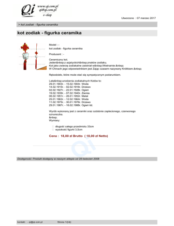 Utworzono : 07 marzec 2017 > kot zodiak - figurka ceramika kot zodiak - figurka ceramika Model : kot zodiak - figurka ceramika Producent : Ceramiczny kot. Jeden z azjatyckich znaków zodiaku. Kot jako zwierzę zodiakalne zaistniał w Wietnamie. W Chinach jego odpowiednikiem jest Zając czasem nazywany Królikiem. Rękodzieło, które może stać się sympatycznym podarunkiem. Lata urodzenia zodiakalnych Kotów to: 29.01.1903r. - 15.02.1904r. Woda 14.02.1915r. - 02.02.1916r. Drzewo 02.02.1927r. - 22.01.1928r. Ogień 19.02.1939r. - 07.02.1940r. Ziemia 06.02.1951r. - 26.01.1952r. Metal 25.01.1963r. - 12.02.1964r. Woda 11.02.1975r. - 30.01.1976r. Drzewo 29.01.1987r. - 16.02.1988r. Ogień itd. Wyrób wykonany jest z ceramiki oraz ozdobnie zaplecionego, czerwonego sznureczka. Wymiary: � długość całego przedmiotu 33cm � wysokość figurki 3,5cm i Q Cena : 18,00 zł Brutto ( 18,00 zł Netto) Dostępność: Produkt dostępny w naszym sklepie od 28 kwiecień 2008 kontakt : - [email protected] Strona 1/{nb}