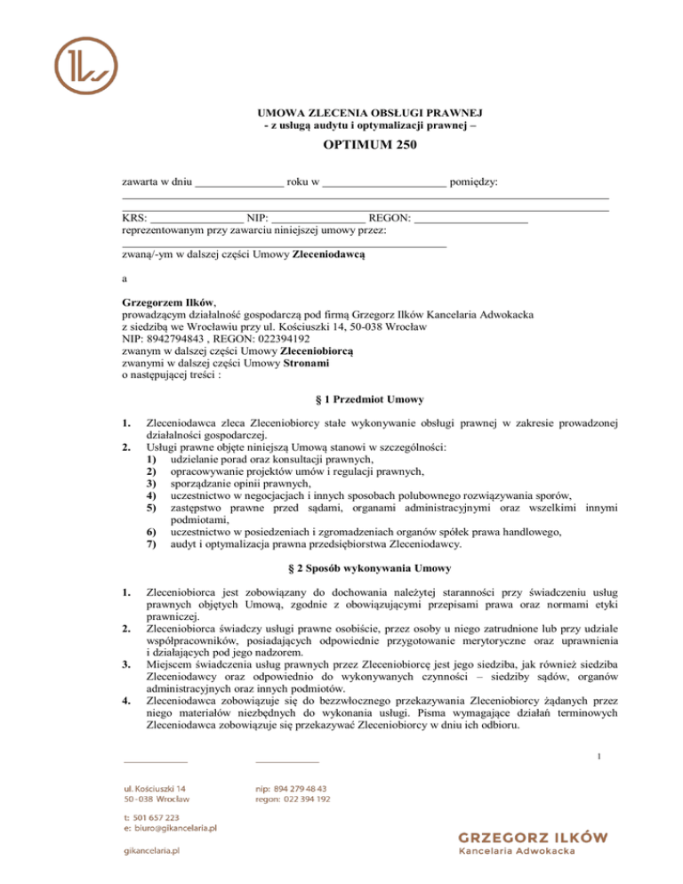 UMOWA ZLECENIA OBSŁUGI PRAWNEJ - z usługą audytu i optymalizacji prawnej – OPTIMUM 250 zawarta w dniu roku w pomiędzy: KRS: NIP: REGON: reprezentowanym przy zawarciu niniejszej umowy przez: zwaną/-ym w dalszej części Umowy Zleceniodawcą a Grzegorzem Ilków, prowadzącym działalność gospodarczą pod firmą Grzegorz Ilków Kancelaria Adwokacka z siedzibą we Wrocławiu przy ul. Kościuszki 14, 50-038 Wrocław NIP: 8942794843 , REGON: 022394192 zwanym w dalszej części Umowy Zleceniobiorcą zwanymi w dalszej części Umowy Stronami o następującej treści : § 1 Przedmiot Umowy 1. 2. Zleceniodawca zleca Zleceniobiorcy stałe wykonywanie obsługi prawnej w zakresie prowadzonej działalności gospodarczej. Usługi prawne objęte niniejszą Umową stanowi w szczególności: 1) udzielanie porad oraz konsultacji prawnych, 2) opracowywanie projektów umów i regulacji prawnych, 3) sporządzanie opinii prawnych, 4) uczestnictwo w negocjacjach i innych sposobach polubownego rozwiązywania sporów, 5) zastępstwo prawne przed sądami, organami administracyjnymi oraz wszelkimi innymi podmiotami, 6) uczestnictwo w posiedzeniach i zgromadzeniach organów spółek prawa handlowego, 7) audyt i optymalizacja prawna przedsiębiorstwa Zleceniodawcy. § 2 Sposób wykonywania Umowy 1. 2. 3. 4. Zleceniobiorca jest zobowiązany do dochowania należytej staranności przy świadczeniu usług prawnych objętych Umową, zgodnie z obowiązującymi przepisami prawa oraz normami etyki prawniczej. Zleceniobiorca świadczy usługi prawne osobiście, przez osoby u niego zatrudnione lub przy udziale współpracowników, posiadających odpowiednie przygotowanie merytoryczne oraz uprawnienia i działających pod jego nadzorem. Miejscem świadczenia usług prawnych przez Zleceniobiorcę jest jego siedziba, jak również siedziba Zleceniodawcy oraz odpowiednio do wykonywanych czynności – siedziby sądów, organów administracyjnych oraz innych podmiotów. Zleceniodawca zobowiązuje się do bezzwłocznego przekazywania Zleceniobiorcy żądanych przez niego materiałów niezbędnych do wykonania usługi. Pisma wymagające działań terminowych Zleceniodawca zobowiązuje się przekazywać Zleceniobiorcy w dniu ich odbioru. 1 5. 6. Koszty przejazdu i pobytu poza miejsce siedziby Zleceniobiorcy Strony będą ustalały indywidualnie przy realizacji każdej usługi. W przypadku ich nieuzgodnienia koszty pobytu oznaczają koszty zakwaterowania w hotelu, znajdującym się w miejscu, gdzie zamiejscowa obsługa ma być wykonana, jednakże o standardzie nie wyższym niż 3 gwiazdki, natomiast koszty przejazdu będą rozliczone zgodnie z ogólnie obowiązującymi normami regulującymi zwrot kosztów podróży służbowej na obszarze kraju. Strony zobowiązują się do nieujawniania jakichkolwiek informacji uzyskanych w związku z realizacją niniejszej Umowy. § 3 Audyt prawny 1. 2. 3. 4. 5. Zleceniobiorca, na życzenie Zleceniodawcy, przeprowadzi audyt prawny jego przedsiębiorstwa (dalej jako: audyt). Audyt obejmuje weryfikację regulacji z zakresu prawa cywilnego funkcjonujących w działalności przedsiębiorstwa Zleceniodawcy, w szczególności regulaminów, umów z kontrahentami, pracownikami, współpracownikami i innymi podmiotami, jak również analizę formy prawnej tej działalności w aspekcie jej charakteru oraz stosunków właścicielskich. Celem audytu jest zdiagnozowanie zagrożeń o naturze prawnej oraz możliwości podwyższenia bezpieczeństwa prawnego i wydajności finansowej przedsiębiorstwa. Zleceniobiorca prowadzi audyt zgodnie ze wskazaniami Zleceniodawcy, który obowiązany jest do współpracy w niezbędnym dla realizacji usługi zakresie. Czas trwania audytu wynosi jeden miesiąc, chyba że Strony postanowią odmiennie. Wnioski z czynności audytu Zleceniobiorca przedstawia Zleceniodawcy w formie pisemnego sprawozdania, zawierającego listę zaleceń w kierunku optymalizacji prawnej przedsiębiorstwa, wraz z propozycją terminu jej przeprowadzenia oraz wysokości wynagrodzenia Zleceniobiorcy z tego tytułu. § 4 Optymalizacja prawna 1. 2. 3. 4. Zleceniobiorca, na życzenie Zleceniodawcy, przeprowadzi w oparciu o sprawozdanie z audytu optymalizację prawną jego przedsiębiorstwa (dalej jako: optymalizacja). Optymalizacja obejmuje realizację zaleceń wskazanych w sprawozdaniu z audytu, w szczególności poprzez przekształcenie formy prawnej przedsiębiorstwa, opracowanie nowych regulacji prawnych lub modyfikację dotychczasowych oraz przeprowadzenie stosownych szkoleń. Celem optymalizacji jest eliminacja zagrożeń o naturze prawnej, podwyższenie bezpieczeństwa prawnego i wydajności finansowej przedsiębiorstwa. Strony zobowiązują się do współpracy w niezbędnym dla realizacji usługi zakresie. Czas trwania optymalizacji wynosi jeden miesiąc, chyba że w sprawozdaniu z audytu Zleceniobiorca zaproponował inny termin. Przeprowadzenie optymalizacji prawnej w oparciu o audyt skutkuje obniżeniem wynagrodzenia ryczałtowego Zleceniobiorcy, o którym mowa w § 5 ust. 1 poniżej o 25 %, począwszy od kolejnego miesiąca po jej zakończeniu. § 5 Wynagrodzenie 1. 2. 3. Za wykonywanie zlecenia Strony uzgadniają miesięczne wynagrodzenie ryczałtowe w kwocie 250,00 zł netto w ramach którego Zleceniobiorca zobowiązany jest do świadczenia obsługi prawnej w wymiarze do 2 godzin miesięcznie. W przypadku niewykorzystania przez Zleceniodawcę obsługi prawnej w wymiarze wskazanym w ust. 1, w kolejnych miesiącach ulega on zwiększeniu o niespożytkowane godziny z miesiąca poprzedniego, jednakże do wymiaru niewiększego niż 10 godzin łącznie. W przypadku zgłoszenia przez Zleceniodawcę zapotrzebowania na usługi Zleceniobiorcy w wymiarze większym niż wskazany w ust. 1 i 2 powyżej, za każdą godzinę pracy powyżej tego wymiaru Strony ustalają wynagrodzenie w kwocie 170,00 zł netto za godzinę pracy. 2 4. 5. 6. 7. Czas pracy Zleceniobiorcy i podjęte czynności udokumentowane będ