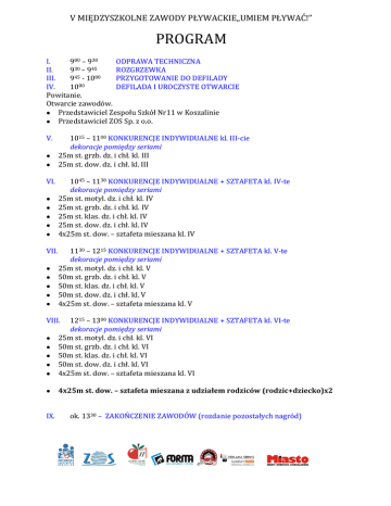 V MIĘDZYSZKOLNE ZAWODY PŁYWACKIE„UMIEM PŁYWAĆ!” PROGRAM I. 900 – 930 ODPRAWA TECHNICZNA 30 45 II. 9 –9 ROZGRZEWKA III. 945 - 1000 PRZYGOTOWANIE DO DEFILADY 00 IV. 10 DEFILADA I UROCZYSTE OTWARCIE Powitanie. Otwarcie zawodów. Przedstawiciel Zespołu Szkół Nr11 w Koszalinie Przedstawiciel ZOS Sp. z o.o. V. 1015 – 1100 KONKURENCJE INDYWIDUALNE kl. III-cie dekoracje pomiędzy seriami 25m st. grzb. dz. i chł. kl. III 25m st. dow. dz. i chł. kl. III VI. 1045 – 1130 KONKURENCJE INDYWIDUALNE + SZTAFETA kl. IV-te dekoracje pomiędzy seriami 25m st. motyl. dz. i chł. kl. IV 25m st. grzb. dz. i chł. kl. IV 25m st. klas. dz. i chł. kl. IV 25m st. dow. dz. i chł. kl. IV 4x25m st. dow. – sztafeta mieszana kl. IV VII. 1130 – 1215 KONKURENCJE INDYWIDUALNE + SZTAFETA kl. V-te dekoracje pomiędzy seriami 25m st. motyl. dz. i chł. kl. V 50m st. grzb. dz. i chł. kl. V 50m st. klas. dz. i chł. kl. V 50m st. dow. dz. i chł. kl. V 4x25m st. dow. – sztafeta mieszana kl. V VIII. 1215 – 1300 KONKURENCJE INDYWIDUALNE + SZTAFETA kl. VI-te dekoracje pomiędzy seriami 25m st. motyl. dz. i chł. kl. VI 50m st. grzb. dz. i chł. kl. VI 50m st. klas. dz. i chł. kl. VI 50m st. dow. dz. i chł. kl. VI 4x25m st. dow. – sztafeta mieszana kl. VI 4x25m st. dow. – sztafeta mieszana z udziałem rodziców (rodzic+dziecko)x2 IX. ok. 1330 – ZAKOŃCZENIE ZAWODÓW (rozdanie pozostałych nagród)