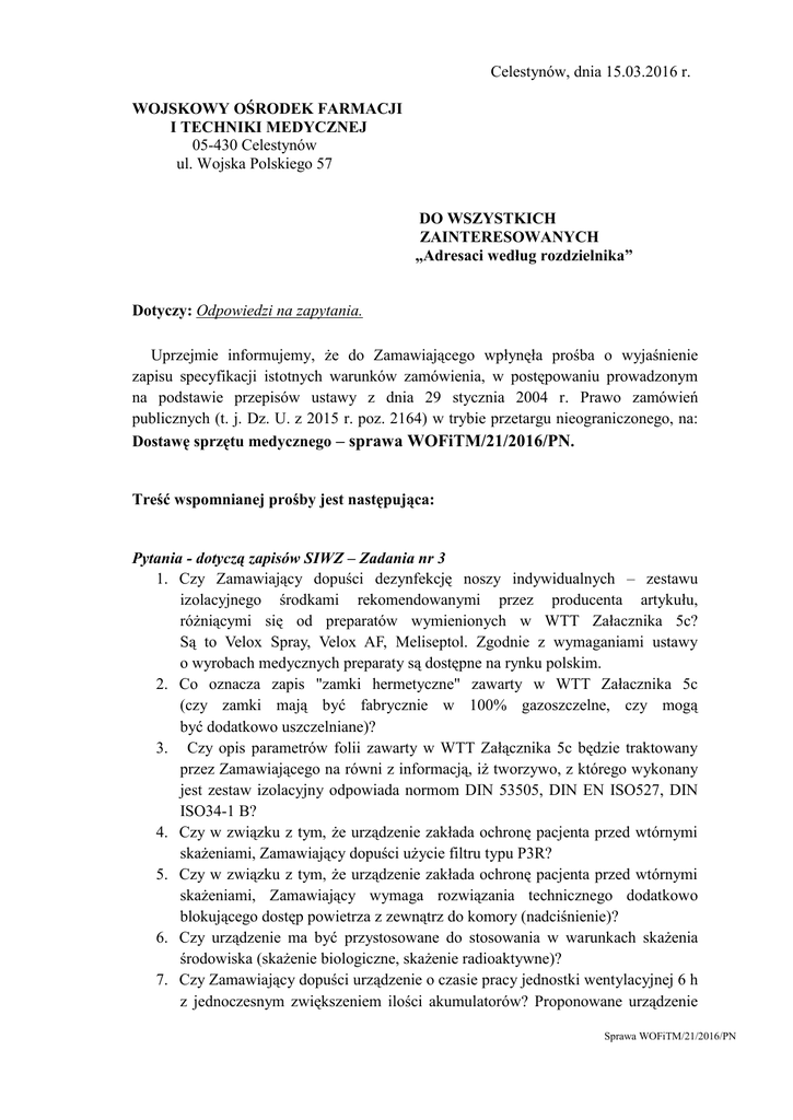 Celestynów, dnia 15.03.2016 r. WOJSKOWY OŚRODEK FARMACJI I TECHNIKI MEDYCZNEJ 05-430 Celestynów ul. Wojska Polskiego 57 DO WSZYSTKICH ZAINTERESOWANYCH „Adresaci według rozdzielnika” Dotyczy: Odpowiedzi na zapytania. Uprzejmie informujemy, że do Zamawiającego wpłynęła prośba o wyjaśnienie zapisu specyfikacji istotnych warunków zamówienia, w postępowaniu prowadzonym na podstawie przepisów ustawy z dnia 29 stycznia 2004 r. Prawo zamówień publicznych (t. j. Dz. U. z 2015 r. poz. 2164) w trybie przetargu nieograniczonego, na: Dostawę sprzętu medycznego – sprawa WOFiTM/21/2016/PN. Treść wspomnianej prośby jest następująca: Pytania - dotyczą zapisów SIWZ – Zadania nr 3 1. Czy Zamawiający dopuści dezynfekcję noszy indywidualnych – zestawu izolacyjnego środkami rekomendowanymi przez producenta artykułu, różniącymi się od preparatów wymienionych w WTT Załacznika 5c? Są to Velox Spray, Velox AF, Meliseptol. Zgodnie z wymaganiami ustawy o wyrobach medycznych preparaty są dostępne na rynku polskim. 2. Co oznacza zapis "zamki hermetyczne" zawarty w WTT Załacznika 5c (czy zamki mają być fabrycznie w 100% gazoszczelne, czy mogą być dodatkowo uszczelniane)? 3. Czy opis parametrów folii zawarty w WTT Załącznika 5c będzie traktowany przez Zamawiającego na równi z informacją, iż tworzywo, z którego wykonany jest zestaw izolacyjny odpowiada normom DIN 53505, DIN EN ISO527, DIN ISO34-1 B? 4. Czy w związku z tym, że urządzenie zakłada ochronę pacjenta przed wtórnymi skażeniami, Zamawiający dopuści użycie filtru typu P3R? 5. Czy w związku z tym, że urządzenie zakłada ochronę pacjenta przed wtórnymi skażeniami, Zamawiający wymaga rozwiązania technicznego dodatkowo blokującego dostęp powietrza z zewnątrz do komory (nadciśnienie)? 6. Czy urządzenie ma być przystosowane do stosowania w warunkach skażenia środowiska (skażenie biologiczne, skażenie radioaktywne)? 7. Czy Zamawiający dopuści urządzenie o czasie pracy jednostki wentylacyjnej 6 h z jednoczesnym zwiększeniem ilości akumulatorów? Proponowane urządzenie Sprawa WOFiTM/21/2016/PN zapewnia pełną wymianę w komorze po 10 minutach. 8. Czy Zamawiający dopuści urządzenie niewymagające serwisu gwarancyjnego i w związku z tym niewymagające przeglądów gwarancyjnych z powodu konstrukcji urządzenia (elementy elektryczne mają budowę modułową, która nie przewiduje zdejmowania obudowy, wymiana filtrów i zabezpieczenia portów do podłączenia urządzeń medycznych jest dokonywana przez użytkownika) oraz okoliczności, w jakich izolator jest zazwyczaj użytkowany. Odpowiedzi: 1. Dopuszczalna jest możliwość dezynfekcji noszy indywidualny zestaw izolacyjny zaproponowanymi preparatami, z uwzględnieniem preparatów wymienionych w wymaganiach. 2. Zamawiający po zapisem zawartym w WT-T ,, Absolutna nieprzepuszczalność w stosunku do otoczenia zapewniona składem i wykonaniem zastosowanych materiałów’’ – miał na myśli 100% gazoszczelność. 3. Parametry folii noszy indywidualny zestaw izolacyjny mają być zgodne z opisem w zawartym wymaganiach WT-T. 4. Dopuszczalny jest filtr P3R. 5. Nie są wymagane inne rozwiązania, niż te opisane w WTT. 6. Urządzenie musi być zgodne z wymaganiami, nie są określone dodatkowe wymagania. 7. Wymagany jest czas pracy urządzenia określony w WTT. 8. Dopuszczalne jest urządzenie, które nie wymaga planowego serwisowania w czasie gwarancji, przy zachowaniu pozostałych wymagań oraz dostępu serwisu pogwarancyjnego (wykaz punktów serwisowych). Informujemy, że zgodnie z wymogiem art. 38 ust. 2 ustawy, stanowisko Zamawiającego zostało rozesłane do wszystkich wykonawców, którym przekazano SIWZ. KOMENDANT płk Krzysztof KACZMAREK Proszę o potwierdzenie otrzymania niniejszego pisma na fax. 261 894 091 Sprawa WOFiTM/21/2016/PN