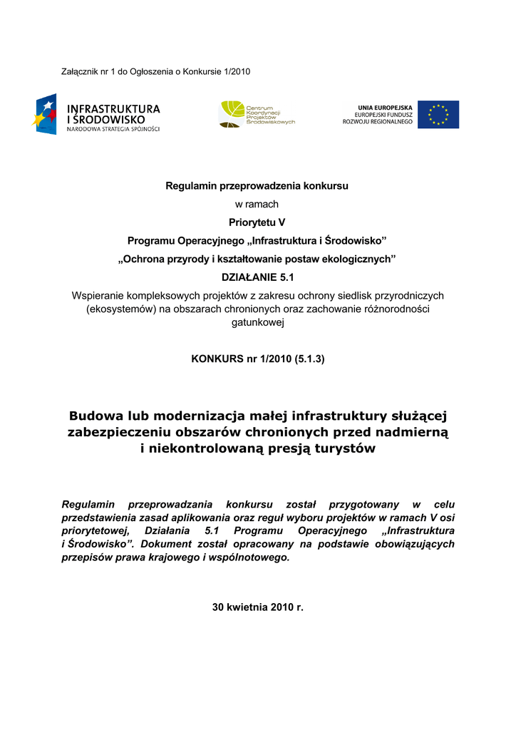 Załącznik nr 1 do Ogłoszenia o Konkursie 1/2010 Regulamin przeprowadzenia konkursu w ramach Priorytetu V Programu Operacyjnego „Infrastruktura i Środowisko” „Ochrona przyrody i kształtowanie postaw ekologicznych” DZIAŁANIE 5.1 Wspieranie kompleksowych projektów z zakresu ochrony siedlisk przyrodniczych (ekosystemów) na obszarach chronionych oraz zachowanie różnorodności gatunkowej KONKURS nr 1/2010 (5.1.3) Budowa lub modernizacja małej infrastruktury służącej zabezpieczeniu obszarów chronionych przed nadmierną i niekontrolowaną presją turystów Regulamin przeprowadzania konkursu został przygotowany w celu przedstawienia zasad aplikowania oraz reguł wyboru projektów w ramach V osi priorytetowej, Działania 5.1 Programu Operacyjnego „Infrastruktura i Środowisko”. Dokument został opracowany na podstawie obowiązujących przepisów prawa krajowego i wspólnotowego. 30 kwietnia 2010 r. ROZDZIAŁ I. OGÓLNE ZASADY PRZYGOTOWANIA PROJEKTÓW 1. Zakres tematyczny projektów 1.1. Wsparcie będą mogły uzyskać projekty, w których główny zakres prac dotyczy budowy lub modernizacji małej infrastruktury służącej odsunięciu ruchu turystycznego od miejsc występowania zagrożonych gatunków lub siedlisk, tzn. co najmniej 50% wydatków kwalifikowalnych w ramach planowanego budżetu zostanie poniesionych na budowę/modernizację małej infrastruktury, która umożliwi kanalizację ruchu turystycznego. 1.2. Do puli w/w działań mogą być zaliczone: planowanie i przygotowanie do realizacji działań terenowych; wydatki związane z przygotowaniem i uzyskaniem wymaganych prawem uzgodnień, pozwoleń i decyzji administracyjnych; zakup materiałów budowlanych; wydatki związane z budową/modernizacją elementów małej infrastruktury turystycznej; zakup sprzętu (pod warunkiem, iż jest on niezbędny do wykonania prac, a jego zakup jest bardziej efektywny kosztowo niż wynajem na czas budowy); wykup gruntu, pod warunkiem, że wymienione wydatki umożliwiają realizację działań terenowych służących odsunięciu presji od zagrożonych gatunków lub siedlisk. 1.3. Przy zachowaniu powyższych zasad, istnieje możliwość dofinansowania w ramach konkursu projektów, których elementy nawiązują do innych konkursów w ramach działania 5.1 oraz działań 5.2 i 5.3, przy czym wszelkie zadania polegające na inwentaryzacji, planowaniu i przygotowaniu do działań ochronnych mają umożliwić realizację działań terenowych w ramach niniejszego projektu. 1.4. Projekty realizowane w ramach konkursu powinny dotyczyć zabezpieczania zagrożonych gatunków i/lub siedlisk, które mają istotne znaczenie dla europejskich zasobów przyrodniczych. 1.5. Planowane działania powinny uwzględniać aktualne i przyszłe lokalne uwarunkowania i być oparte na wiarygodnych informacjach ukazujących faktyczną potrzebę uporządkowania ruchu turystycznego w celu ochrony gatunków i/lub siedlisk. W ramach Planu Realizacji Przedsięwzięcia Wnioskodawca powinien przedstawić informacje poparte danymi empirycznymi, nt.: poziomu ruchu turystycznego na obszarze/ach, na którym/ych podejmowane będą działania w ramach projektu lub dynamiki jego zmian; lokalizacji oraz stanu gatunków i/lub siedlisk, zagrożonych ze strony nadmiernej i niekontrolowanej presji turystów; strat wartości przyrodniczych na danym obszarze spowodowanych nadmierną i niekontrolowaną presją turystów. 1.6. Wnioskodawca powinien przygotować syntetyczną koncepcję programowoprzestrzenną kanalizacji ruchu turystycznego, w której w formie opisowej i graficznej (mapa) przedstawione zostaną: informacje o występujących gatunkach i/lub siedliskach narażonych na presję ze strony turystów, z uwzględnieniem ich statusu ochronnego oraz znaczenia dla europejskich lub krajowych zasobów1; informacje o dotychczasowym ruchu turystycznym na obszarze objętym projektem (trasy, natężenie, formy ruchu turystycznego); informacje o stratach zasobów przyrodniczych; informacje nt. lokalizacji i parametrów planowanych obiektów. 2. Działania dotyczące ograniczenia presji na gatunki i/lub siedliska występujące na obszarach należących do sieci Natura 2000. 2.1. W ramach konkursu priorytetowo traktowane będą działania dotyczące ochrony gatunków i/lub siedlisk występujących na obszarach należących do sieci Natura 2000. Obszarami należącymi do sieci Natura 2000 są OSO, które zostały zatwierdzone rozporządzeniem Ministra Środowiska oraz SOO, które zostały zgłoszone przez rząd RP do Komisji Europejskiej. O przynależności danego obszaru do sieci Natura 2000 decyduje data oficjalnego zatwierdzenia lub zgłoszenia. 2.2. Działania podejmowane na obszarach należących do sieci Natura 2000 powinny bezpośrednio dotyczyć zmniejszenia presji na gatunki lub siedliska, które są przedmiotem ochrony w ramach danego obszaru. Szczegółowe informacje na temat chronionych siedlisk i gatunków zawarte są w tzw. standardowych formularzach danych (SDF, Standard Data Form) sporządzanych dla każdego obszaru. Działania dotyczące zmniejszenia presji na gatunki lub siedliska występujące na obszarze Natura 2000, jednak niewymienione w formularzu dla danego obszaru, nie zostaną uznane za kwalifikowalne. W tym przypadku istnieje możliwość współfinansowania, jeżeli wniosek zawierać będzie oświadczenie Ministerstwa Środowiska, zobowiązującego się do dokonania korekty w formularzu danych obszaru. 3. Działania ochronne dotyczące kanalizacji ruchu turystycznego realizowane poza obszarami chronionymi. 3.1. Działania realizowane w ramach projektów powinny koncentrować się na obszarach chronionych polskim prawem lub obszarach chronionych o statusie międzynarodowym. 3.2. Za kwalifikowane mogą być uznane również wydatki na czynności prowadzone na terenach sąsiadujących z obszarami chronionymi, których celem jest zmniejszenie presji na gatunki/siedliska występujące na obszarach chronionych. 