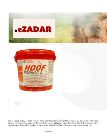 Jakość kopyt, skóry i sierści jest nie tylko dziedzicznie bardzo zróżnicowana, ale zależy ona również w ogromnym stopniu od odpowiedniego utrzymania i optymalnego odżywiania konia. Duża część koni cierpi z powodu najróżniejszych problemów z kopytami, które związane są z nieprawidłowym Strona 1 z 3 utrzymaniem i karmieniem. Skutkami tego są najczęściej : nieprawidłowa przemiana materii puszki kopytowej, gorsza jakość kopyta, łamliwe kopyta, szczeliny w kopycie, miękka lub chropowata puszka kopyta, puste ściany puszki kopyta, gnicie strzałki i zły przyrost kopyta. HOOF FORMULA wspomaga szybką odbudowę zdrowego rogu kopytowego. Przeznaczony jest dla koni, które przebyły choroby i urazy kopyta oraz u których występuje: • kruchość kopyt • łamliwość • zbyt duża miękkość • pękanie, rozdwajanie kopyt • zbyt słabo rozrastające się piętki • skłonność go gnicia strzałki • gnicie białej linii • tworzenie się pustej ściany • płaska podeszwa • rekonwalescencja po ochwacie HOOF FORMULA zawiera dużą ilość biotyny, metioniny oraz inne składniki niezbędne do budowy mocnych i zdrowych kopyt. HOOF FORMULA uzupełnia brakujące składniki. Kompleksowa formuła: 2 000 000 mcg/kg biotyny oraz wiele niezbędnych składników zapewnia optymalną przemianę materii puszki kopytowej i dostarczenie niezbędnych odżywczych i uzupełniających składników w najwyższym skondensowaniu. HOOF FORMULA wspomaga poprawę jakości puszki kopytowej i wzrost kopyta. Jest ona również ważna przy terapeutycznych środkach zaradczych zaleconych przez weterynarza lub kowala jako wsparcie żywieniowo-fizjologiczne. Dieter Kroehnert Od 1990 roku jest oficjalnym kowalem Niemieckiego Jeździeckiego Komitetu Olimpijskiego i opiekuje się niemieckimi mistrzowskimi końmi w dyscyplinach: ujeżdżenia, skoków, WKKW i powożenia podczas Olimpiad oraz Mistrzostw Świata i Europy. Zawartość składników: Białko surowe.... 15,50% Surowy popiół.........5,00% Tłuszcz....................4,50% Włókno surowe......10,00% L-Lysina...................6,50% DL-Metionina……..5,00% Składniki uzupełniające na kg: Biotyna......................2.000.000,00 mcg Cynk.................................9.000,00 mg Miedź................................1.000,00 mg Lecytyna.......................166.666,00 mg L-Lizyna..........................65.000,00 mg DL-Metionina..................50.000,00 mg Strona 2 z 3 Skład: Wytłoczyny jabłkowe 27% Kukurydza ( zmielona ) 25% Pszenica ( zmielona ) 13% Cukier gronowy 2,5% Olej rzepakowy ( tłoczony na zimno ) 2% Owies zmielony 1% Dawkowanie: Dla koni o wadze ok. 600 kg: Codziennie 1-2 miarki ( w opakowaniu) dodać do podstawowej paszy. Porcja dzienna: 25 – 50 g Dla źrebiąt i pony ok. 300 kg Codziennie 0,5 – 1 miarki ( w opakowaniu) dodać do podstawowej paszy Porcja dzienna 12,5 – 25 g Uwaga! 1 opakowanie –wiadro 5 kg – wystarcza na ponad 3 miesiące kuracji przy max dawce . Strona 3 z 3