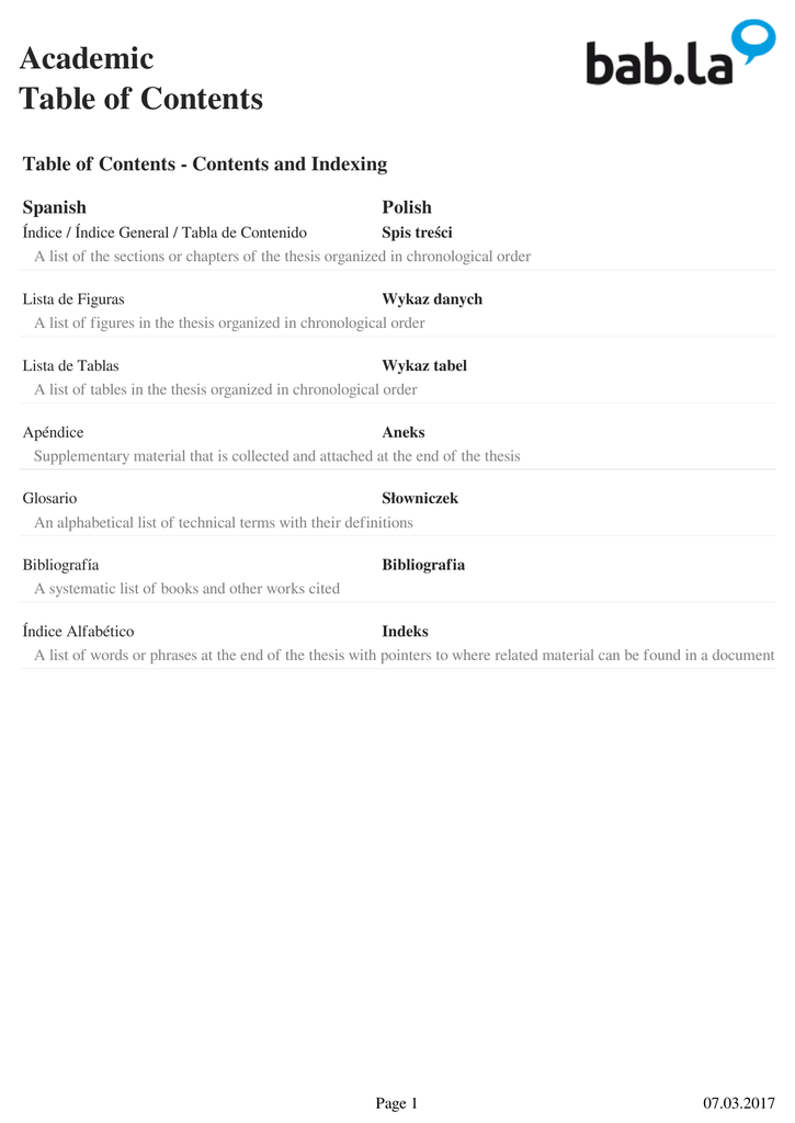 Academic Table of Contents Table of Contents - Contents and Indexing Spanish Polish Índice / Índice General / Tabla de Contenido Spis treści A list of the sections or chapters of the thesis organized in chronological order Lista de Figuras Wykaz danych A list of figures in the thesis organized in chronological order Lista de Tablas Wykaz tabel A list of tables in the thesis organized in chronological order Apéndice Aneks Supplementary material that is collected and attached at the end of the thesis Glosario Słowniczek An alphabetical list of technical terms with their definitions Bibliografía A systematic list of books and other works cited Bibliografia Índice Alfabético Indeks A list of words or phrases at the end of the thesis with pointers to where related material can be found in a document Page 1 Powered by TCPDF (www.tcpdf.org) 07.03.2017