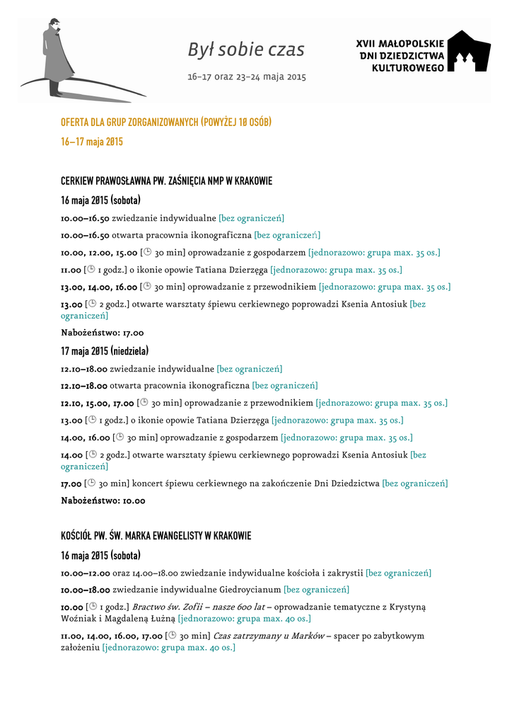 OFERTA DLA GRUP ZORGANIZOWANYCH (POWYŻEJ 10 OSÓB) 16–17 maja 2015 CERKIEW PRAWOSŁAWNA PW. ZAŚNIĘCIA NMP W KRAKOWIE 16 maja 2015 (sobota) 10.00 10.00– 00– 16.50 zwiedzanie indywidualne [bez ograniczeń] 10.00– 10.00– 16.50 otwarta pracownia ikonograficzna [bez ograniczeń] 10.00, 12.00, 15.00 [ 30 min] oprowadzanie z gospodarzem [jednorazowo: grupa max. 35 os.] 11.00 [ 1 godz.] o ikonie opowie Tatiana Dzierzęga [jednorazowo: grupa max. 35 os.] 13.00, 14.00, 16.00 [ 30 min] oprowadzanie z przewodnikiem [jednorazowo: grupa max. 35 os.] 13.00 [ 2 godz.] otwarte warsztaty śpiewu cerkiewnego poprowadzi Ksenia Antosiuk [bez ograniczeń] Nabożeństwo: 17.00 17 maja 2015 (niedziela) 12.10– 12.10 – 18.00 zwiedzanie indywidualne [bez ograniczeń] 12.10– 12.10 – 18.00 otwarta pracownia ikonograficzna [bez ograniczeń] 12.10, 15.00, 17.00 [ 30 min] oprowadzanie z przewodnikiem [jednorazowo: grupa max. 35 os.] 13.00 [ 1 godz.] o ikonie opowie Tatiana Dzierzęga [jednorazowo: grupa max. 35 os.] 14.00, 16.00 [ 30 min] oprowadzanie z gospodarzem [jednorazowo: grupa max. 35 os.] 14.00 [ 2 godz.] otwarte warsztaty śpiewu cerkiewnego poprowadzi Ksenia Antosiuk [bez ograniczeń] 17.00 [ 30 min] koncert śpiewu cerkiewnego na zakończenie Dni Dziedzictwa [bez ograniczeń] Nabożeństwo: 10.00 KOŚCIÓŁ PW. ŚW. MARKA EWANGELISTY W KRAKOWIE 16 maja 2015 (sobota) 10.00– 10.00– 12.00 oraz 14.00–18.00 zwiedzanie indywidualne kościoła i zakrystii [bez ograniczeń] 10.00– 10.00– 18.00 zwiedzanie indywidualne Giedroycianum [bez ograniczeń] 10.00 [ 1 godz.] Bractwo św. Zofii – nasze 600 lat – oprowadzanie tematyczne z Krystyną Woźniak i Magdaleną Łużną [jednorazowo: grupa max. 40 os.] 11.00, 14.00, 16.00, 17.00 [ 30 min] Czas zatrzymany u Marków – spacer po zabytkowym założeniu [jednorazowo: grupa max. 40 os.] 12.30 [ 1 godz.] Michał Giedroyć – zakonnik z XV w. – o postaci tajemniczego zakrystiana z kościoła Marków opowiedzą siostry jadwiżanki [jednorazowo: grupa max. 40 os.] 15.00 [ 1 godz.] Przemiany wystroju kościoła św. Marka – oprowadzanie z historyczką sztuki dr Beatą Frey-Stecową [jednorazowo: grupa max. 40 os.] 19.15 [ 1 godz.] koncert muzyki dawnej zespołu Perfugium [bez ograniczeń] Msza św.: 12.30 17 maja 2015 (niedziela) 10.00– 0.00– 18.00 zwiedzanie indywidualne Giedroycianum [bez ograniczeń] 11.30 [ 1 godz.] Michał Giedroyć – zakonnik z XV w. – o postaci tajemniczego zakrystiana z kościoła Marków opowiedzą siostry jadwiżanki [jednorazowo: grupa max. 40 os.] 13.3 13.30 – 15.00 oraz 16.30– 16.30 – 18.00 zwiedzanie indywidualne kościoła i zakrystii [bez ograniczeń] 13.00 [ 1 godz.] Bractwo św. Zofii – nasze 600 lat – oprowadzanie tematyczne z Krystyną Woźniak i Magdaleną Łużną [jednorazowo: grupa max. 40 os.] 14.00 [ 1 godz.] Przemiany wystroju kościoła św. Marka – oprowadzanie z historyczką sztuki dr Beatą Frey-Stecową [jednorazowo: grupa max. 40 os.] 16.45, 17.15 [ 30 min] Czas zatrzymany u Marków – spacer po zabytkowym założeniu [jednorazowo: grupa max. 40 os.] Msze św.: 10.15, 11.30, 12.30, 12.30, 15.30 KOLONIA ROBOTNICZA I FABRYKA BATA W CHEŁMKU 16 maja 2015 (sobota) 10.00– 10.00– 18.00 zwiedzanie indywidualne obiektów [bez ograniczeń] 10.00– 10.00– 18.00 zwiedzanie indywidualne dawnej willi dyrektora Alojzego Gabesama [bez ograniczeń] 10.00– 10.00– 18.00 zwiedzanie indywidualne ekspozycji w Domu Pamięci Baty [bez ograniczeń] 10.00– 10.00– 18.00 zwiedzanie indywidualne kościoła pw. NMP Królowej Polski [bez ograniczeń] 10.00– 10.00– 18.00 Nie marnujcie czasu… – pokaz slajdów w kinie Iluzja [bez ograniczeń] 10.00– 10.00– 18.00 wystawa XVI Wiosennego Przeglądu Sztuki Nieprofesjonalnej [bez ograniczeń] 11.00, 13.00, 15.00, 17.00 [ 40 min] oprowadzanie po dawnej kolonii robotniczej [jednorazowo: grupa max. 40 os.] 12.00, 14.00, 16.00 [ 40 min] oprowadzanie po dawnej fabryce Baty [jednorazowo: grupa max. 40 os.] 18.00 [ 45 min] Bata i film – opowieść historyka kina Macieja Gila [bez ograniczeń] 17 maja 2015 (niedziela) 10.00– 10.00– 18.00 zwiedzanie indywidualne obiektów [bez ograniczeń] 10.00– 10.00– 18.00 zwiedzanie indywidualne dawnej willi dyrektora Alojzego Gabesama [bez ograniczeń] 10.00– 10.00– 18.00 zwiedzanie indywidualne ekspozycji w Domu Pamięci Baty [bez ograniczeń] 10.00– 10.00– 18.00 Nie marnujcie czasu… – pokaz slajdów w kinie Iluzja [bez ograniczeń] 10.00– 10.00– 18.00 wystawa XVI Wiosennego Przeglądu Sztuki Nieprofesjonalnej [bez ograniczeń] 11.00, 13.00, 15.00, 17.00 [ 40 min] oprowadzanie po dawnej kolonii robotniczej [jednorazowo: grupa max. 40 os.] 12.00, 14.00, 16.00 [ 40 min] oprowadzanie po dawnej fabryce Baty [jednorazowo: grupa max. 40 os.] 12.00– 12.00 – 17.30 zwiedzanie indywidualne kościoła pw. NMP Królowej Polski [bez ograniczeń] 15.00 [ 1,5 godz.] wycieczka geologiczna po wzgórzu Skała z Markiem Szuwarzyńskim [jednorazowo: grupa max. 30 os.] ZESPÓŁ ZABUDOWAŃ PODWORSKICH W BOBRKU 16 maja 2015 (sobota) 10.00– 10.00– 18.00 zwiedzanie indywidualne zabudowań podworskich [bez ograniczeń] 10.00– 10.00– 18.00 plenerowy pokaz prac oraz warsztatu rzeźbiarzy ludowych – Antoniego Korycika i Ryszarda Gondka z Chełmka [bez ograniczeń] 10.00– 10.00– 13.00 zwiedzanie indywidualne kościoła pw. Przenajświętszej Trójcy w Bobrku [bez ograniczeń] 10.00, 11.00, 12.00, 13.00, 14.00, 15.00, 16.00, 17.00 [ 25 min] oprowadzanie po ekspozycji w czworakach z etnografką Beatą Skoczeń-Marchewką [jednorazowo: grupa max. 15 os.] 10.30, 12.30, 14.30, 16.30 [ 1 godz.] spacer po zabudowaniach podworskich z historykiem Aleksandrem Babińskim [jednorazowo: grupa max. 40 os.] 14.00– 14.00 – 18.00 piknik i degustacja miejscowych potraw [bez ograniczeń] 15.30 [ 1 godz.] Bobreckie założenie parkowe – spacer z dr. Grzegorzem Szewczykiem [jednorazowo: grupa max. 4