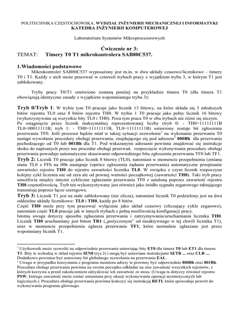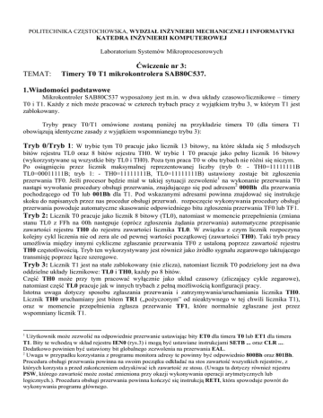 POLITECHNIKA CZĘSTOCHOWSKA, WYDZIAŁ INŻYNIERII MECHANICZNEJ I INFORMATYKI KATEDRA INŻYNIERII KOMPUTEROWEJ Laboratorium Systemów Mikroprocesorowych TEMAT: Ćwiczenie nr 3: Timery T0 T1 mikrokontrolera SAB80C537. 1.Wiadomości podstawowe Mikrokontroler SAB80C537 wyposażony jest m.in. w dwa układy czasowo/licznikowe – timery T0 i T1. Każdy z nich może pracować w czterech trybach pracy z wyjątkiem trybu 3, w którym T1 jest zablokowany. Tryby pracy T0/T1 omówione zostaną poniżej na przykładzie timera T0 (dla timera T1 obowiązują identyczne zasady z wyjątkiem wspomnianego trybu 3): Tryb 0/Tryb 1: W trybie tym T0 pracuje jako licznik 13 bitowy, na które składa się 5 młodszych bitów rejestru TL0 oraz 8 bitów rejestru TH0. W trybie 1 T0 pracuje jako pełny licznik 16 bitowy (wykorzystywane są wszystkie bity TL0 i TH0). Poza tym praca T0 w obu trybach nie różni się niczym. Po osiągnięciu przez licznik maksymalnej reprezentowanej liczby (tryb 0: - TH0=11111111B TL0=00011111B; tryb 1: - TH0=11111111B, TL0=11111111B) ustawiony zostaje bit zgłoszenia przerwania TF0. Jeśli procesor będzie miał w takiej sytuacji zezwolenie1 na wykonanie przerwania T0 nastąpi wywołanie procedury obsługi przerwania, znajdującego się pod adresem2 000Bh dla przerwania pochodzącego od T0 lub 001Bh dla T1. Pod wskazanymi adresami powinna znajdować się instrukcje skoku do napisanych przez nas procedur obsługi przerwań. rozpoczęcie wykonywania procedury obsługi przerwania powoduje automatyczne skasowanie odpowiedniego bitu zgłoszenia przerwania TF0 lub TF1. Tryb 2: Licznik T0 pracuje jako licznik 8 bitowy (TL0), natomiast w momencie przepełnienia (zmiana stanu TL0 z FFh na 00h następuje (oprócz zgłoszenia żądania przerwania) automatyczne przepisanie zawartości rejestru TH0 do rejestru zawartości licznika TL0. W związku z czym licznik rozpoczyna kolejny cykl liczenia nie od zera ale od pewnej wartości początkowej (zawartości TH0). Taki tryb pracy umożliwia między innymi cykliczne zgłaszanie przerwania TF0 z ustaloną poprzez zawartość rejestru TH0 częstotliwością. Tryb ten wykorzystywany jest również jako źródło sygnału zegarowego taktującego transmisję poprzez łącze szeregowe. Tryb 3: Licznik T1 jest na stałe zablokowany (nie zlicza), natomiast licznik T0 podzielony jest na dwa oddzielne układy licznikowe: TL0 i TH0, każdy po 8 bitów. Część TH0 może przy tym pracować wyłącznie jako układ czasowy (zliczający cykle zegarowe), natomiast część TL0 pracuje jak w innych trybach z pełną możliwością konfiguracji pracy. Istotna uwaga dotyczy sposobu zgłaszania przerwania i zatrzymywania/uruchamiania licznika TH0. Licznik TH0 uruchamiany jest bitem TR1 („pożyczonym” od nieaktywnego w tej chwili licznika T1), oraz w momencie przepełnienia zgłasza przerwanie TF1, które normalnie zgłaszane jest przez wspomniany licznik T1. 1 Użytkownik może zezwolić na odpowiednie przerwanie ustawiając bity ET0 dla timera T0 lub ET1 dla timera T1. Bity te wchodzą w skład rejestru IEN0 (rys.3) i mogą być ustawiane instrukcjami SETB ... oraz CLR .... Dodatkowo powinien być ustawiony bit globalnego zezwolenia na przerwania EAL. 2 Uwaga w przypadku korzystania z programu monitora adresy te powinny być odpowiednio 800Bh oraz 801Bh. Procedura obsługi przerwania powinna na swoim początku odkładać na stos zawartość wszystkich rejestrów, z których korzysta a przed zakończeniem odzyskiwać ich zawartość ze stosu. (Uwaga ta dotyczy również rejestru PSW, którego zawartość może zostać zmieniona przy okazji wykonywania operacji arytmetycznych lub logicznych.). Procedura obsługi przerwania powinna kończyć się instrukcją RETI, która spowoduje powrót do wykonywania programu głównego. We wszystkich trybach obowiązują takie same reguły dotyczące sterowania licznikami T0/T1 patrz tabela 1 oraz tabela 2. |------------------------- TIMER 1 -------------------------|----------------------- TIMER 0 --------------------------| | | | GATE C\~T M1 M0 GATE C\~T M1 M0 Rys.1 Bity sterujące licznikami T0/T1 zawarte w rejestrze TMOD M1,M0 C/~T GATE bity wyboru trybu pracy timerów: 00 – tryb 0 01 – tryb 1 10 – tryb 2 11 – tryb 3 Counter/~Timer – Bit wyboru sposobu pracy timerów: C\~T = 1 – timer pracuje jako licznik impulsów zewnętrznych (podawanych na wejście odpowiednio T0 lub T1), C\~T = 0 – timer pracuje jako licznik impulsów zegarowych i może służyć do odmierzania odcinków czasu. Bit sterujący zliczaniem: GATE = 1 licznik będzie zliczał tylko wtedy gdy na wejście INT0 (INT1 dla T1) zostanie podany sygnał wysoki (logiczna jedynka) oraz bit zezwolenia zliczania TR0 (TR1) będzie ustawiony, GATE = 0 sterowanie licznikiem (zliczanie/zatrzymanie) zależy tylko od bitu TR0 (TR1). Tabela 1. Opis bitów rejestru TMOD TF1 TR1 TF0 TR0 Rys.2 Bity sterujące licznikami zawarte w rejestrze TCON TF0, TF1 bit zgłoszenia przerwania odpowiednio od licznika T0 lub T1 ustawiany przez procesor w chwili przepełnienia licznika. Jeśli procesor będzie miał zezwolenie na wykonanie przerwania(2) wykonana zostanie odpowiednia procedura obsługi przerwania. Bit zgłoszenia przerwania TF0(TF1) zostanie w takim przypadku automatycznie skasowany. TR0, TR1 Bit sterujący zliczaniem/zatrzymaniem liczników: 0 – licznik zatrzymany, 1 – licznik zlicza impulsy (zegarowe lub pochodzące z zewnątrz). Tabela 2. Opis bitów rejestru TCON 2. Przykład Przykład 1. Ustawić Timer T0 w tryb pracy 1 zliczania impulsów podawanych z zewnątrz bez zewnętrznego sterowania zliczaniem, natomiast timer T1 do pracy w trybie 2 zliczania impulsów zegarowych z wartością początkową równą 170, również bez zewnętrznego sterowania zliczaniem. Timery nie powinny generować przerwań. Następnie należy uruchomić oba timery. Rozwiązanie: Posługując się tablicami 1 i 2 ustalamy dla timera T0: M1=0, M0=1, C\~T=1, GATE=0, oraz dla timera T1: