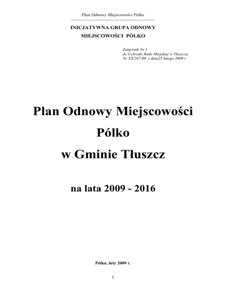 Plan Odnowy Miejscowości Pólko ------------------------------------------------------- INICJATYWNA GRUPA ODNOWY MIEJSCOWOŚCI PÓLKO Załącznik Nr 1 do Uchwały Rady Miejskiej w Tłuszczu Nr XX/247/09 z dnia25 lutego 2009 r. Plan Odnowy Miejscowości Pólko w Gminie Tłuszcz na lata 2009 - 2016 Pólko, luty 2009 r. 1 Plan Odnowy Miejscowości Pólko ------------------------------------------------------- Spis treści: Strona I. Wstęp I. 1. Cel opracowania Planu Odnowy Miejscowości 3 II. Charakterystyka miejscowości Pólko II. 1. Położenie geograficzno – przestrzenne 4 II. 2. Zasoby miejscowości i zagospodarowanie terenu 4 II. 3. Walory kulturowe, krajobrazowe i ochrona przyrody 6 III. Analiza SWOT miejscowości Pólko 7 IV. Kierunki rozwoju miejscowości Pólko 8 V. Arkusz planowania V. 1. Zarządzanie 9 V. 2. Cel planowanych inwestycji 9 Planowane do realizacji zadania w ramach Planu Odnowy Miejscowości Pólko na lata 2009-2016 2 10 Plan Odnowy Miejscowości Pólko ------------------------------------------------------- I. Wstęp I. 1. Cel opracowania Planu Odnowy Miejscowości Obszarem realizacji Planu Odnowy Miejscowości jest teren sołectwa Pólko, a czas jego realizacji obejmuje lata 2009 – 2016. Na wielu spotkaniach z mieszkańcami dyskutowano o potrzebie dokonania wielu zmian. Ustalono wspólną wizję rozwoju miejscowości Pólko. Powołano w tym celu Inicjatywną Grupę Odnowy Miejscowości Pólko. Grupa postanowiła opracować ostateczny Plan Odnowy Miejscowości. W tym celu: 1. Zanotowano wiele pomysłów i inicjatyw mieszkańców. 2. Określono działania przyspieszające rozwój miejscowości. 3. Przeprowadzono konsultacje z: - Mieszkańcami sołectwa Pólko. - Radą Sołecką. - Przedstawicielami samorządu terytorialnego. Plan Odnowy Miejscowości Pólko jest zgodny z następującymi dokumentami: 1. Planem Rozwoju Lokalnego. 2. Strategią Rozwoju Gminy Tłuszcz. 3. Strategią Powiatu Wołomińskiego. 4. Strategią Województwa Mazowieckiego. Opracowanie planu odnowy miejscowości to wyzwanie, przed którym stanęły wszystkie aktywne społeczności lokalne zaangażowane w działania rozwojowe podejmowane na terenie ich małych ojczyzn. Wdrożenie planu odnowy ma na celu: możliwość korzystania z funduszy strukturalnych i innych zewnętrznych źródeł finansowania działań rozwojowych; poprawę warunków i wzrost atrakcyjności życia społeczno – kulturalnego; umożliwienie dzieciom rozwijania zainteresowań i zagospodarowania czasu wolnego; kultywowanie tradycji i obyczajów; poprawę estetyki miejscowości; integrowanie społeczności lokalnej; przeciwdziałanie patologiom społecznym; aktywizację społeczności lokalnej – wzrost tożsamości z miejscem zamieszkania i stopnia integracji mieszkańców wokół działania na rzecz własnego środowiska – miejscowości. Plan zawiera oczekiwania mieszkańców, wynikające ze szczegółowej analizy mocnych stron miejscowości, zasobów i ich wykorzystania, planowanych przedsięwzięć. 3 Plan Odnowy Miejscowości Pólko ------------------------------------------------------- II. Charakterystyka miejscowości Pólko II. 1. Położenie geograficzno – przestrzenne Wieś Pólko stanowi zwartą zabudowę mieszkaniową. Położona jest na Mazowszu, po prawej stronie Wisły, w województwie Mazowieckim, powiecie Wołomińskim i gminie Tłuszcz. Sołectwo Pólko bezpośrednio sąsiaduje z Tłuszczem, gdzie mieści się siedziba władz gminnych. Leży w środkowej części gminy, na wschód od Tłuszcza, w odległości ok. 40 km od Warszawy i ok. 18 km od miasta powiatowego Wołomin. Teren, na którym położona jest miejscowość, to powierzchnia polodowcowej równiny morenowej, położonej ok. 100. n.p.m. Są to rozległe doliny łąkowe i tereny upraw rolnych. Mieszkańcy korzystają z komunikacji autobusowej w stronę Tłuszcza. Wioska graniczy z miastem Tłuszcz – siedzibą Gminy, gdzie znajduje się ważny węzeł komunikacji kolejowej. Przez Pólko przebiega droga powiatowa umożliwiająca dogodny dojazd do Tłuszcza, Wołomina, Warszawy oraz do sąsiedniej Gminy Strachówka. Czas dojazdu do centrum Warszawy samochodem nie przekracza jednej godziny. Większość gruntów to grunty V i VI kl. co sprawia, że gospodarowanie na tych terenach jest mało efektywne. Znaczna cześć mieszkańców dojeżdża do pracy w okolicznych miastach. II. 2. Zasoby miejscowości i zagospodarowanie terenu Na dzień 31.12.2007 roku powierzchnia sołectwa Pólko wynosiła 0,49 km2, co stanowi ok. 0,5 % ogólnej powierzchni gminy. W skali gminy jest to jeden z najmniejszych obszarów osadnictwa znajdujący się na terenach wiejskich gminy. Zamieszkuje tu 200 osób, stanowi to ponad 1 % ogólnej liczby mieszkańców gminy. Średnia gęstość zaludnienia wynosi ok. 408 osób/km2, co powoduje, że jest znacznie wyższa, niż w kraju, województwie i w gminie. Podstawową funkcją tej miejscowości jest funkcja rolniczo – mieszkalna. Miejscowość Pólko to tereny, gdzie są doskonałe grunty, aby rozwijać budownictwo mieszkaniowe. Wioska wyposażona jest w sieć: energetyczną, gazową i telefoniczną, jednak nie posiada sieci wodociągowej i kanalizacji. Miejscowość położona jest przy drodze powiatowej, system dróg wiejskich jest rozwinięty prawidłowo, w większości jednak drogi wymagają dalszego utwardzenia. Przy głównym ciągu komunikacyjnym we wsi Pólko istnieje chodnik. Zainteresowani mieszkańcy mogą korzystać z Internetu. Na terenie sołectwa nie istnieją siedziby żadnych instytucji publicznych. Dzieci uczęszczają do szkoły w Stryjkach i w Tłuszczu. Usługi medyczne zaspokajane są przez niepubliczny ośrodek zdrowia z siedzibą w Tłuszczu. 4 Plan Odnowy Miejscowości Pólko ------------------------------------------------------Liczba mieszkańców zameldowanych na stałe w 2007 roku. Miejscowość Razem mieszkańców Pólko 200 W tym: - kobiety - mężczyźni 98 102 Wiek Produkcyjny Przedprod