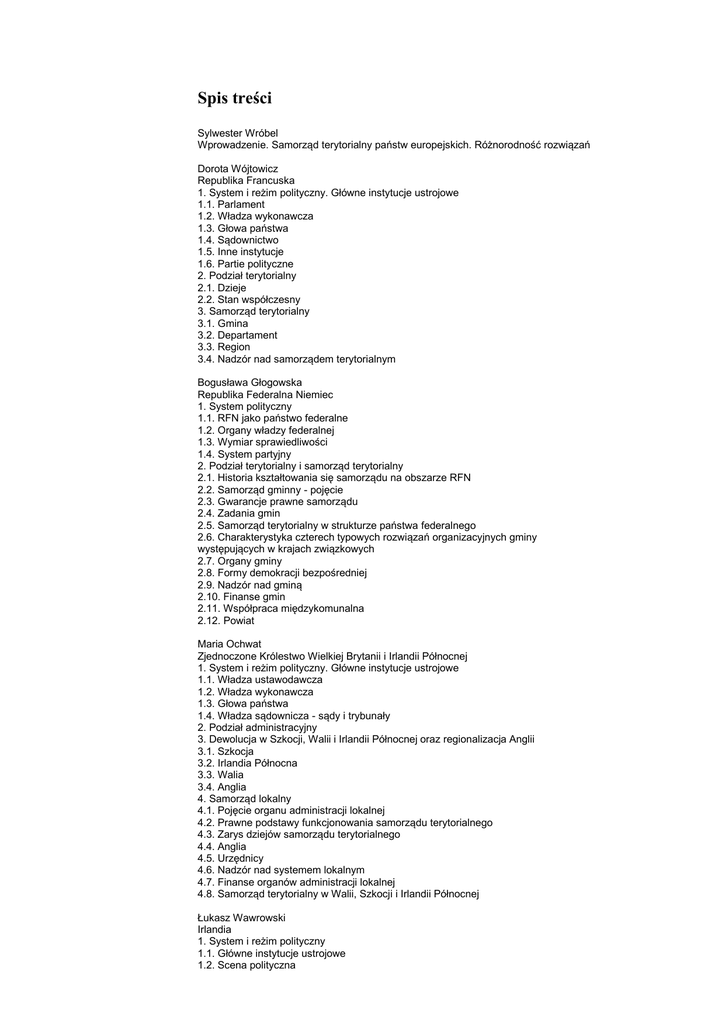Spis treści Sylwester Wróbel Wprowadzenie. Samorząd terytorialny państw europejskich. Różnorodność rozwiązań Dorota Wójtowicz Republika Francuska 1. System i reżim polityczny. Główne instytucje ustrojowe 1.1. Parlament 1.2. Władza wykonawcza 1.3. Głowa państwa 1.4. Sądownictwo 1.5. Inne instytucje 1.6. Partie polityczne 2. Podział terytorialny 2.1. Dzieje 2.2. Stan współczesny 3. Samorząd terytorialny 3.1. Gmina 3.2. Departament 3.3. Region 3.4. Nadzór nad samorządem terytorialnym Bogusława Głogowska Republika Federalna Niemiec 1. System polityczny 1.1. RFN jako państwo federalne 1.2. Organy władzy federalnej 1.3. Wymiar sprawiedliwości 1.4. System partyjny 2. Podział terytorialny i samorząd terytorialny 2.1. Historia kształtowania się samorządu na obszarze RFN 2.2. Samorząd gminny - pojęcie 2.3. Gwarancje prawne samorządu 2.4. Zadania gmin 2.5. Samorząd terytorialny w strukturze państwa federalnego 2.6. Charakterystyka czterech typowych rozwiązań organizacyjnych gminy występujących w krajach związkowych 2.7. Organy gminy 2.8. Formy demokracji bezpośredniej 2.9. Nadzór nad gminą 2.10. Finanse gmin 2.11. Współpraca międzykomunalna 2.12. Powiat Maria Ochwat Zjednoczone Królestwo Wielkiej Brytanii i Irlandii Północnej 1. System i reżim polityczny. Główne instytucje ustrojowe 1.1. Władza ustawodawcza 1.2. Władza wykonawcza 1.3. Głowa państwa 1.4. Władza sądownicza - sądy i trybunały 2. Podział administracyjny 3. Dewolucja w Szkocji, Walii i Irlandii Północnej oraz regionalizacja Anglii 3.1. Szkocja 3.2. Irlandia Północna 3.3. Walia 3.4. Anglia 4. Samorząd lokalny 4.1. Pojęcie organu administracji lokalnej 4.2. Prawne podstawy funkcjonowania samorządu terytorialnego 4.3. Zarys dziejów samorządu terytorialnego 4.4. Anglia 4.5. Urzędnicy 4.6. Nadzór nad systemem lokalnym 4.7. Finanse organów administracji lokalnej 4.8. Samorząd terytorialny w Walii, Szkocji i Irlandii Północnej Łukasz Wawrowski Irlandia 1. System i reżim polityczny 1.1. Główne instytucje ustrojowe 1.2. Scena polityczna 2. Podział terytorialny i samorząd terytorialny - dzieje i współczesność 2.1. Zarys historii podziału i samorządu terytorialnego 2.2. Ogólna charakterystyka współczesnego podziału terytorialnego i samorządowego 3. Samorząd terytorialny 3.1. Samorząd lokalny 3.2. Samorząd regionalny 3.3. Praktyka funkcjonowania samorządu terytorialnego Anna Augustynowicz Królestwo Belgii 1. System i reżim polityczny. Główne instytucje ustrojowe 1.1. Parlament 1.2. Władza wykonawcza 1.3. Głowa państwa 1.4. Sądownictwo 1.5. Trybunał Arbitrażowy 1.6. Rada Stanu 1.7. Rzecznik praw obywatelskich 1.8. Partie polityczne (największe i dominujące) 2. Podział terytorialny 3. Samorząd terytorialny 3.1. Gmina 3.2. Prowincje 3.3. Instytucje demokracji bezpośredniej - referendum samorządowe 3.4. Nadzór nad samorządem terytorialnym Martyna Dudzicz Królestwo Norwegii 1. System polityczny 1.1. Główne instytucje ustrojowe 1.2. System partyjny 2. Podział terytorialny i geneza samorządu terytorialnego 3. Samorząd terytorialny 3.1. Podstawy prawne 3.2. Instytucje demokracji bezpośredniej 3.3. Partie polityczne, organizacje społeczne i polityczne 3.4. Zadania samorządów terytorialnych 3.5. Organy samorządu terytorialnego 3.6. Finanse Martyna Dudzicz Królestwo Szwecji 1. System polityczny 1.1. Główne instytucje ustrojowe 1.2. System partyjny 2. Podział terytorialny i geneza samorządu terytorialnego 3. Samorząd terytorialny 3.1. Podstawy prawne 3.2. Instytucje demokracji bezpośredniej 3.3. Zadania samorządów terytorialnych 3.4. Organy samorządu terytorialnego 3.5. Finanse 3.6. Nadzór Wojciech Kostka Republika Finlandii 1. System polityczny 1.1. Podstawy ustroju 1.2. System i reżim polityczny. Główne instytucje ustrojowe 2. Podział terytorialny i samorząd terytorialny 2.1. Administracja państwowa 2.2. Administracja samorządowa 2.3. Gmina jako podstawowa jednostka samorządu terytorialnego 2.4. Region samorządowy jako drugi stopień samorządu terytorialnego 2.5. Autonomia Wysp Alandzkich Rafał Glajcar Republika Czeska 1. System polityczny 1.1. Powstanie Republiki Czeskiej 1.2. Główne instytucje ustrojowe 1.3. Największe partie polityczne 2. Podział terytorialny i samorząd terytorialny 2.1. Podział terytorialny i samorząd w perspektywie historycznej 2.2. Przywrócenie instytucji samorządu terytorialnego w okresie przemian demokratycznych 2.3. Samorząd terytorialny na szczeblu gminy 2.4. Samorząd terytorialny na szczeblu województwa 2.5. Nadzór nad samorządem terytorialnym 2.6. Finanse jednostek samorządu terytorialnego Agnieszka Zogata-Kusz Republika Słowacka 1. System i ustrój polityczny. Główne instytucje ustrojowe 1.1. Władza ustawodawcza 1.2. Władza wykonawcza 1.3. Władza sądownicza 1.2. System partyjny 2. Podział terytorialny i samorząd terytorialny 2.1. Gmina 2.2. Miasta 2.3. Współpraca międzygminna 2.4. Kraj ISBN: 978-83-7164-755-0