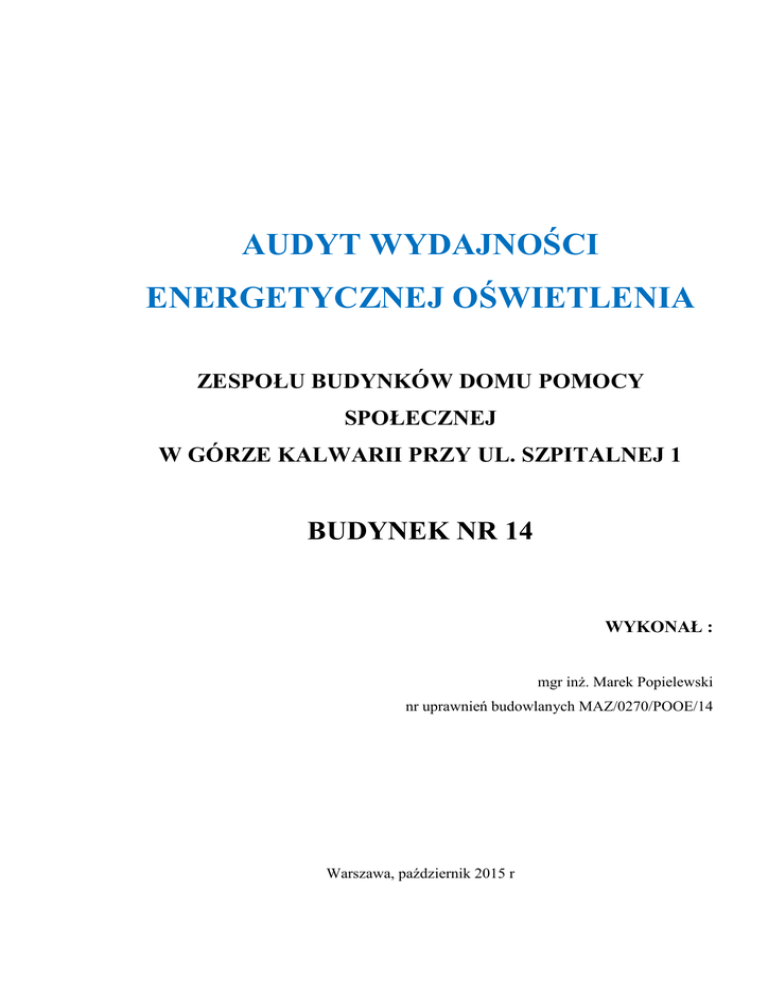 AUDYT WYDAJNOŚCI ENERGETYCZNEJ OŚWIETLENIA ZESPOŁU BUDYNKÓW DOMU POMOCY SPOŁECZNEJ W GÓRZE KALWARII PRZY UL. SZPITALNEJ 1 BUDYNEK NR 14 WYKONAŁ : mgr inż. Marek Popielewski nr uprawnień budowlanych MAZ/0270/POOE/14 Warszawa, październik 2015 r Spis treści: - MAPA OBIEKTU Z ZAZNACZONYM BUDYNKIEM ……………..………. 3 1. WYMAGANIA OŚWIETLENIOWE DLA BUDYNKÓW UŻYTECZNOŚCI PUBLICZNEJ……………………………………………………..4 1.1. Wyjaśnienie podstawowych parametrów oświetleniowych …………………….4 1.2. Inwentaryzacja oświetlenia ……………………………………………………...4 2. ANALIZA ISTNIEJĄCEJ INSTALACJI OŚWIETLENIA …………………..5 2.1 Zestawienie zbiorcze istniejącego oświetlenia …………………………………..6 3. OPRACOWANIE STRATEGII PROWADZĄCYCH DO POPRAWY WYDAJNOŚCI ENERGETYCZNEJ OŚWIETLENIA ………….. 7 3.1 Wybór i charakterystyka sprzętu oświetleniowego ……………………………... 7 3.2 Wybór systemu konserwacji …………………………………………………… 7 3.3 Zestawienie zbiorcze oświetlenia po modernizacji …………………………….. 8 4. ANALIZA WYNIKÓW I OCENA EFEKTYWNOŚCI ENERGETYCZNEJ ……………………………………………………………………. 9 4.1 Charakterystyka finansowa wymiany oświetlenia …………………………….. 10 4.2 Wnioski ……...…………………………………………………………………. 11 LITERATURA…………………………………………………………………………... 11 1. WYMAGANIA OŚWIETLENIOWE DLA BUDYNKÓW UŻYTECZNOŚCI PUBLICZNEJ Wymagania oświetleniowe przyjęto na podstawie polskiej normy PN-EN 12464-1:2012 [3]. Tabela nr 1.1 Ra [-] 80 δ (*) [-] 0,4 Korytarz 100 UGRL [-] 22 Klatka schodowa 100 22 80 0,4 Szatnie ,umywalnie, toalety 200 22 80 0,4 Pokoje wypoczynkowe ( sypialnia ) 100 22 80 0,4 Kuchnia 500 22 80 0,6 Stołówka 200 22 80 0,4 Pokoje opieki medycznej 500 16 90 0,6 Magazyn 100 25 60 0,4 Pomieszczenia socjalne 100 22 80 0,4 Świetlica 300 22 80 0,4 Jadalnia 200 22 80 0,4 Pomieszczenie gospodarcze 100 22 80 0,4 Warsztat 500 22 80 0,6 Pralnia 300 22 80 0,4 Pomieszczenia medyczne 500 22 80 0,4 Biuro 500 22 80 0,6 Przygotowanie warzyw, mięsa itd. 300 22 80 0,4 Obieralnia 500 22 80 0,4 Rodzaj wnętrza, zadania lub czynności Em [lx] 1.1. Wyjaśnienie podstawowych parametrów oświetleniowych Natężenie oświetlenia E [1] w danym punkcie powierzchni jest to iloraz elementarnego strumienia świetlnego (dΦ) padającego na powierzchnię (dS) E = dΦ / ds. (1.1) Jednostką natężenia oświetlenia jest lux [lx]. Równomierność oświetlenia δ jest to stosunek najmniejszej wartości natężenia oświetlenia w punkcie ( Emin) do średniej wartości natężenia oświetlenia (Em) δ = Emin / Em (1.2) Temperatura barwowa Tc danego źródła światła jest to temperatura ciała czarnego, które promieniuje światło o barwie identycznej z barwą tego źródła [1]. Jednostką temperatury barwowej jest Kelwin [K]. Norma [4] podaje zakresy temperatury barwowej : Tc ≤ 3300 K – barwa światła ciepła 3300 K ≤ Tc ≤ 5300 K – barwa światła naturalna Tc ≤ 5300 K – barwa światła zimna Wskaźnik oddawania barw Ra - informuje o tym, w jakim stopniu dane źródło światła umożliwia obserwację kolorów [6]. Im wyższy stopień oddawania barw tym lepiej postrzegane są kolory. Maksymalna wartość wskaźnika Ra =100. Olśnienie - warunki widzenia powstałe na skutek niewłaściwego rozkładu, bądź zakresu luminancji, bądź też występowania zbyt dużych kontrastów, powodujące uczucie przykrości i niewygody, lub obniżenie zdolności rozpoznawania szczegółów, lub przedmiotów, lub oba te wrażenia jednocześnie [6]. 2. ANALIZA ISTNIEJĄCEJ INSTALACJI OŚWIETLENIA Instalację oświetlenia wykonano na oprawach świetlówkowych z magnetycznymi statecznikami prądu oraz na oprawach z kompaktowymi świetlówkami. Oprawy te charakteryzują się niską skutecznością świetlną oraz dużą energochłonnością. Istniejące oświetlenie nie spełnia wymagań normatywnych. 2.1 Zestawienie wyników istniejącego oświetlenia w budynku nr 14 Tabela nr 2.1 Charakterystyka oświetleniowa pomieszczeń budynek nr 14 ( parter ) przed modernizacją. L.p Rodzaj pomieszczenia Typ oprawy Moc oprawy P [W] Ilość opraw [szt.] Moc Zużycie Czas całkowita energii użytkowania instalowana całkowite/rok w roku t [h] Pi [W] [kWh/rok] PARTER 1 Pokój mieszkalny(1) Żyrandol 5x18 99 2 198 3000 594 2 Łazienka 128 1 128 2000 256 3 Pokój mieszkalny(8) Żyrandol 5x18 99 2 198 3000 594 4 Pokój mieszkalny (2) Żyrandol 5x18 99 1 99 3000 297 5 Wiatrołap OPK 2x18W 39 1 39 5000 195 6 Korytarz OPK 2x36W 79 6 474 5000 2370 Żyrandol 5x18 99 1 99 3000 297 Żyrandol 5x18 99 1 99 3000 297 7 8 Pokój mieszkalny (3) Pokój mieszkalny (4) OPK 2x58W 9 Łazienka OPK 2x58W 128 1 128 2000 256 10 Pokój mieszkalny (5) Żyrandol 5x18 99 1 99 3000 297 11 Łazienka OPK 2x58W 128 1 128 2000 256 Żyrandol 5x18 99 1 99 3000 297 Żyrandol 5x18 99 2 198 3000 594 12 13 Pokój mieszkalny (6) Pokój mieszkalny (7) 14 Łazienka OPK 2x58W 128 1 128 2000 256 15 Magazyn OPK 2x18W 39 2 78 1500 117 16 Gabinet zabiegowy OPK 4x18W 79 3 237 3000 711 17 Magazyn Plafon 2x24W 53 1 53 1500 79,5 18 WC Plafon 2x24W 53 2 106 2000 212 19 Pokój pielęgniarek Żyrandol 5x18 99 1 99 3000 297 20 Pokój socjalny OPK 2x18W 39 3 117 3000 351 34 2 804 - 8 623,5 RAZEM : 2.2 Zestawienie zbiorcze wyników istniejącego oświetlenia w budynku nr 14 Tabela nr 2.2 Zbiorcze zestawienie oświetlenia pomieszczeń w budynku nr 14 przed modernizacją. Moc Zużycie Cena Rodzaj całkowita energii energii za L.p. pomieszczenia instalowana całkowite/rok 1 kWh Pi [W] [kWh/rok] [zł] 1 Parter RAZEM : Koszt energii elektryczne za oświetlenie na rok [zł/rok] Liczbowy wskaźnik energii oświetlenia LENI [kWh/m2·ro